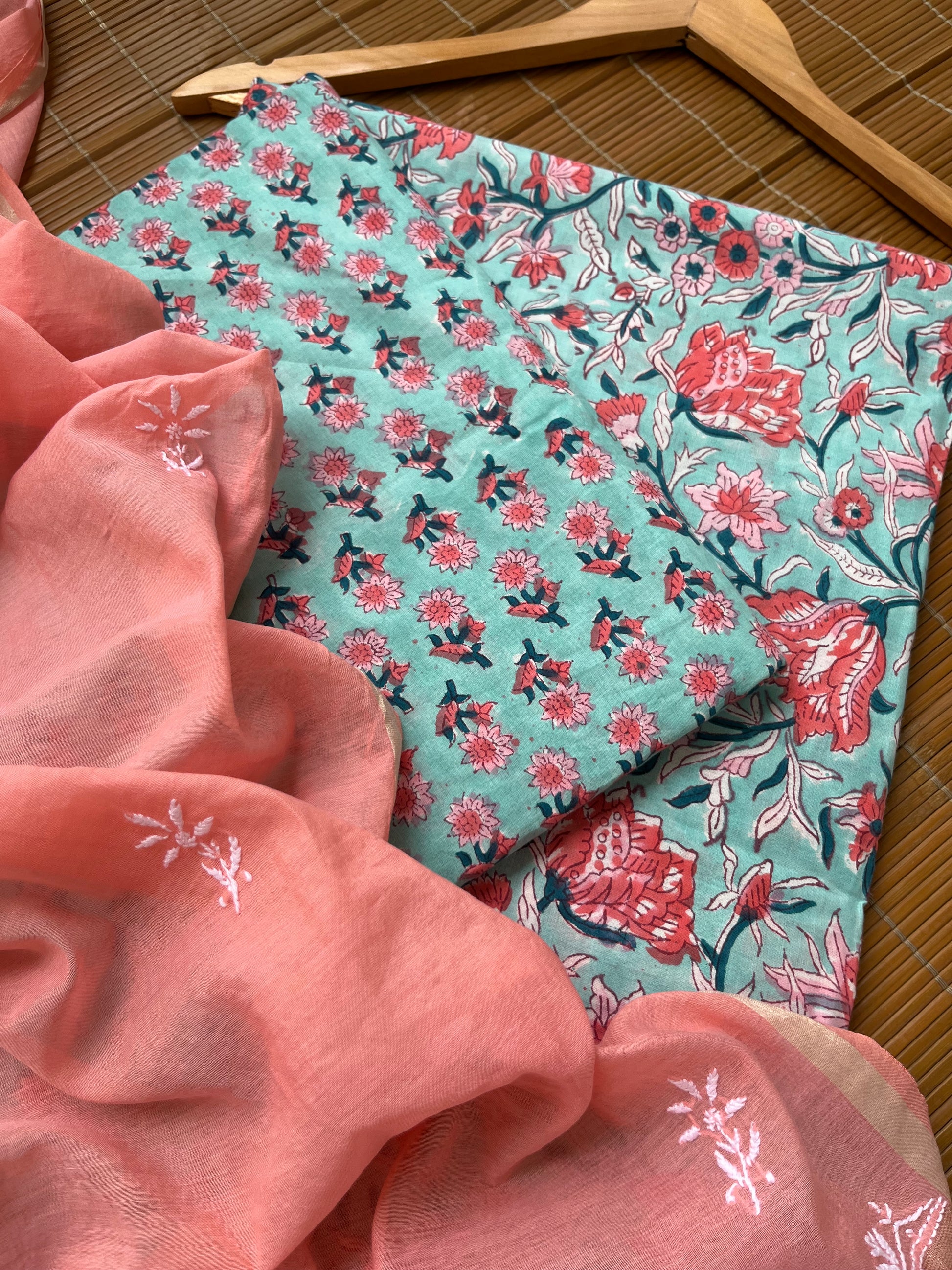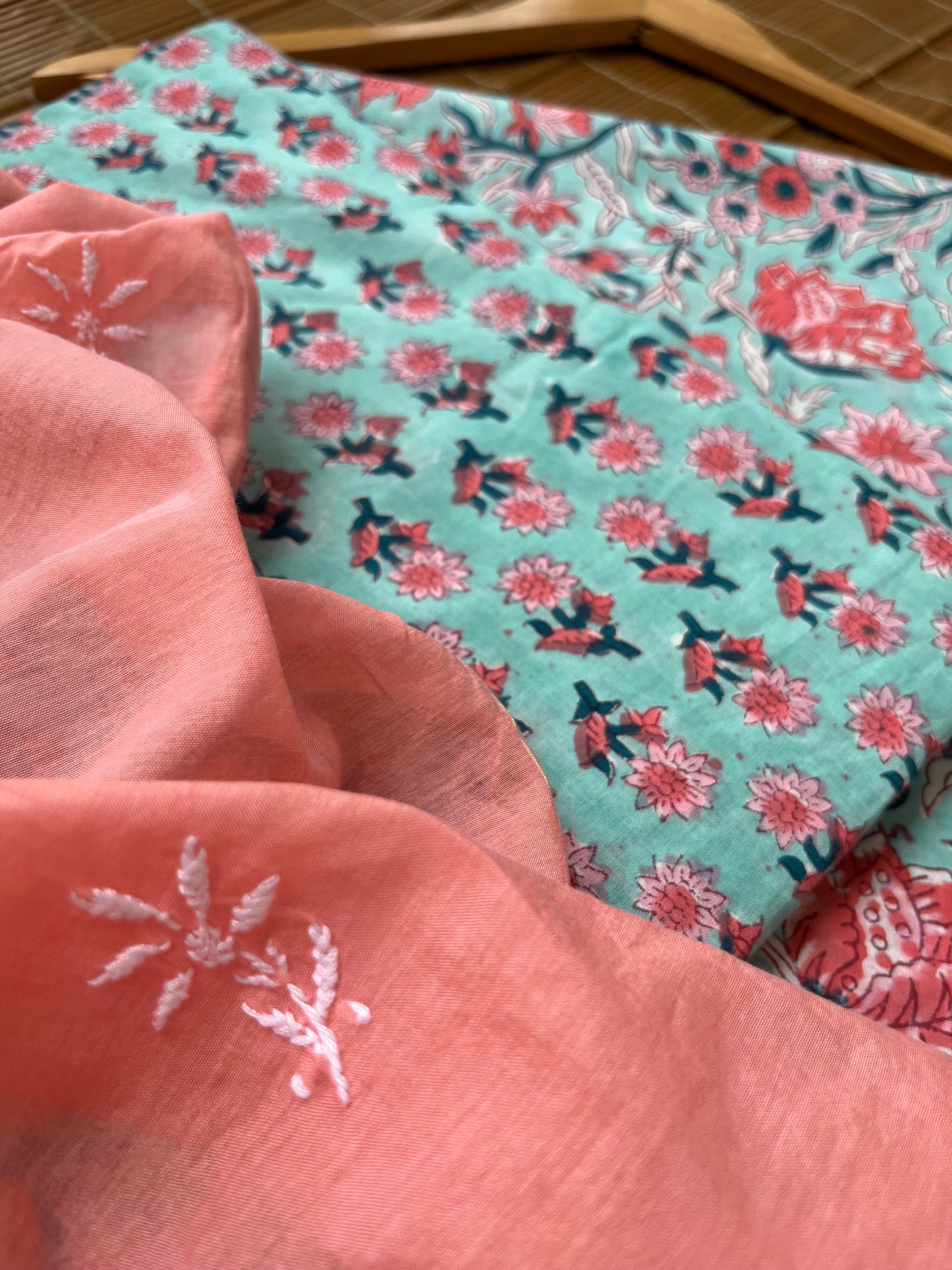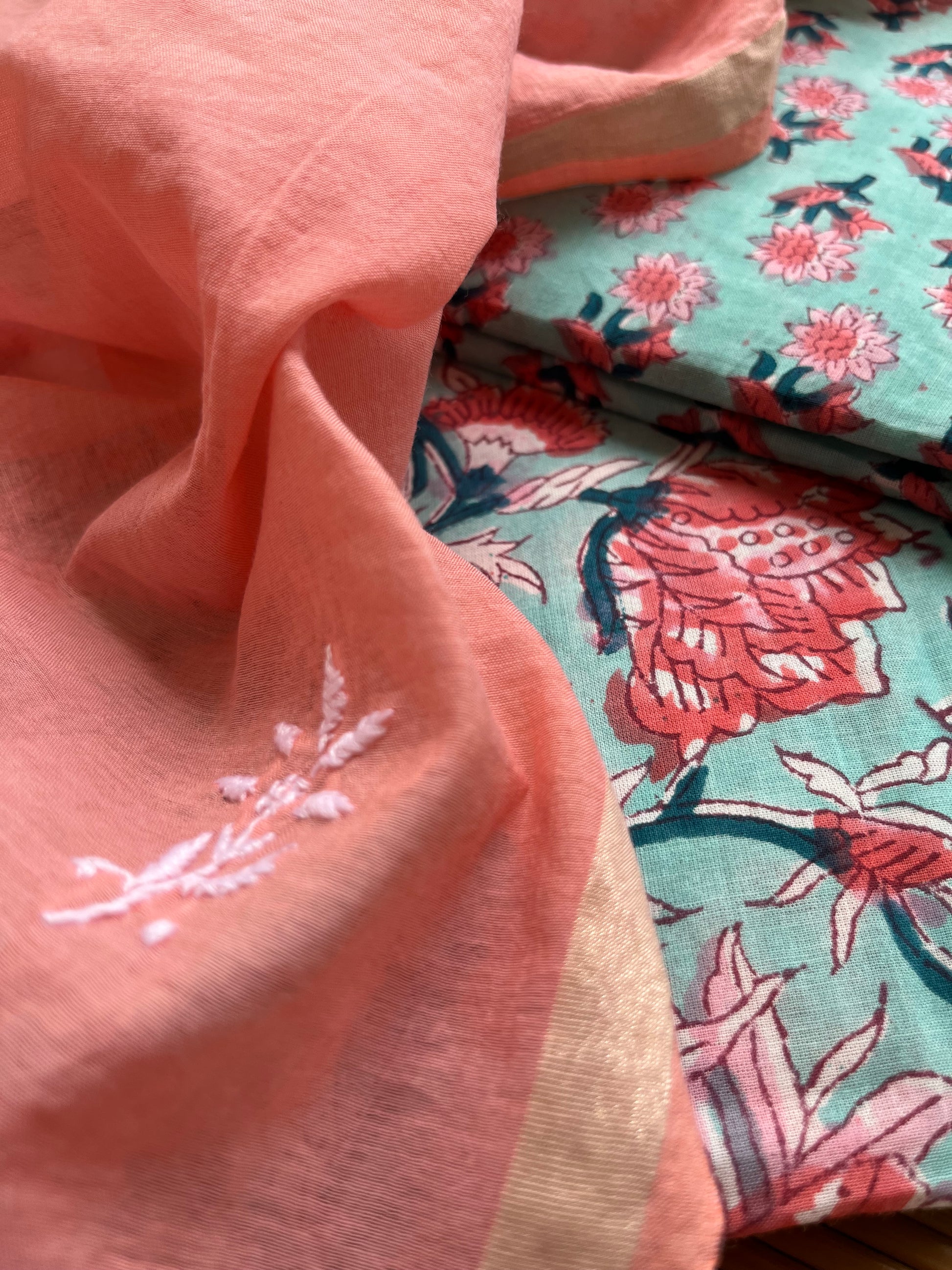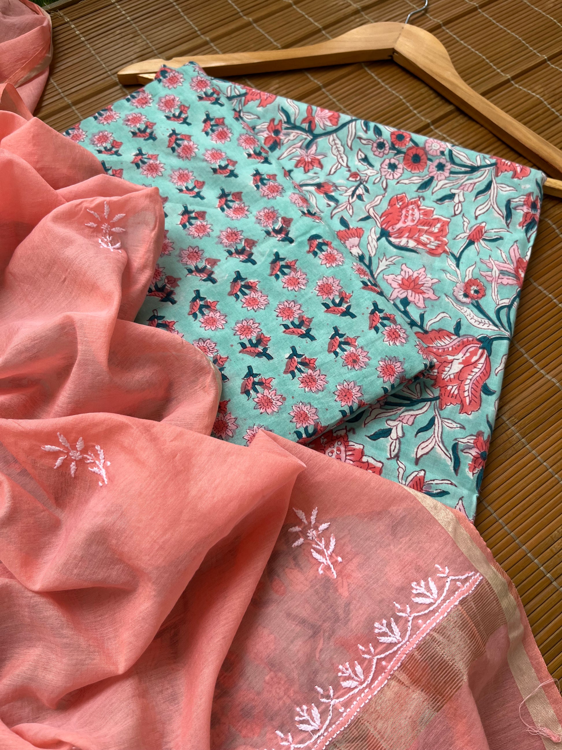 Cotton block print kurta bottom fabric paired with a chanderi chikankari Dupatta
