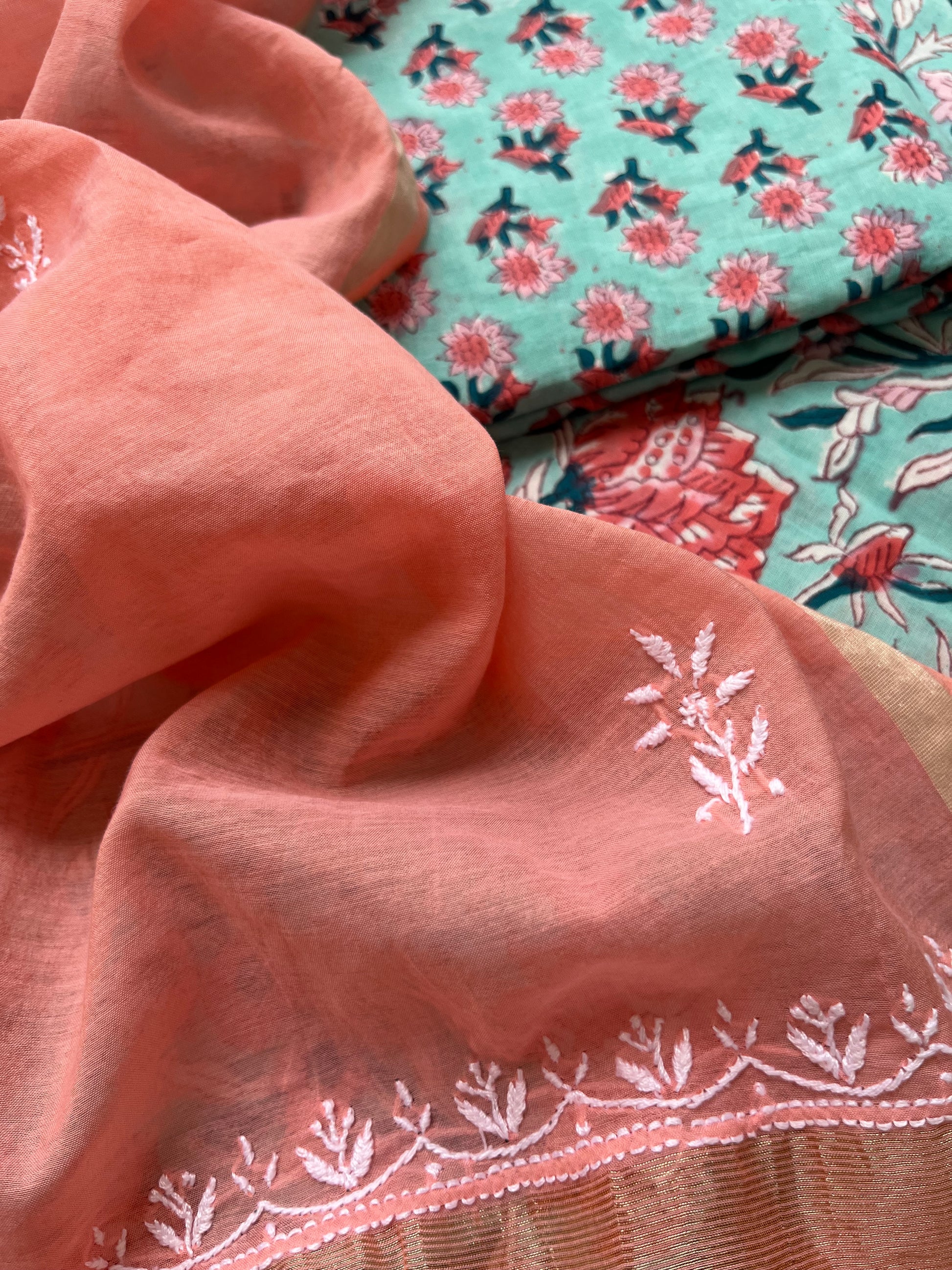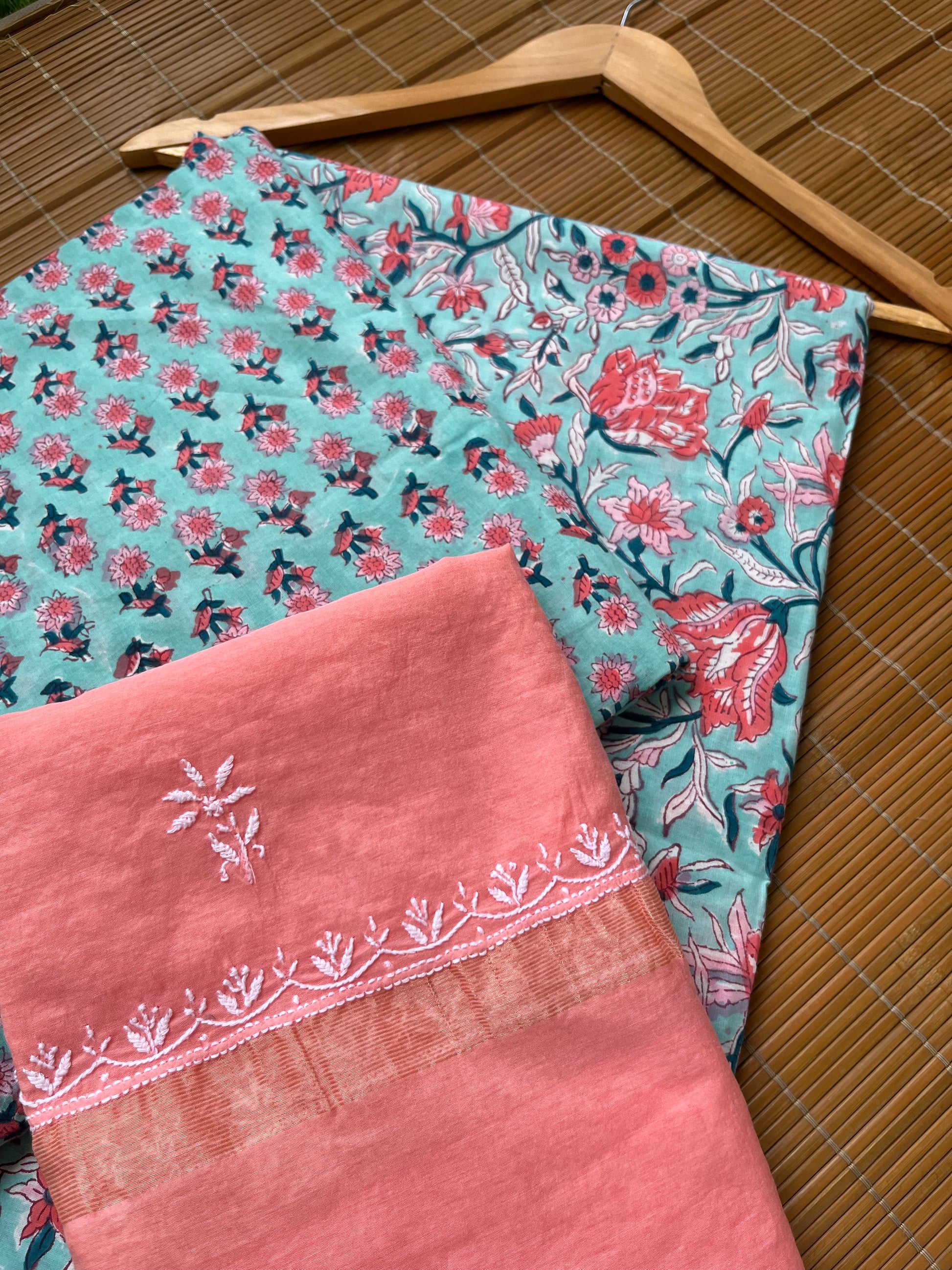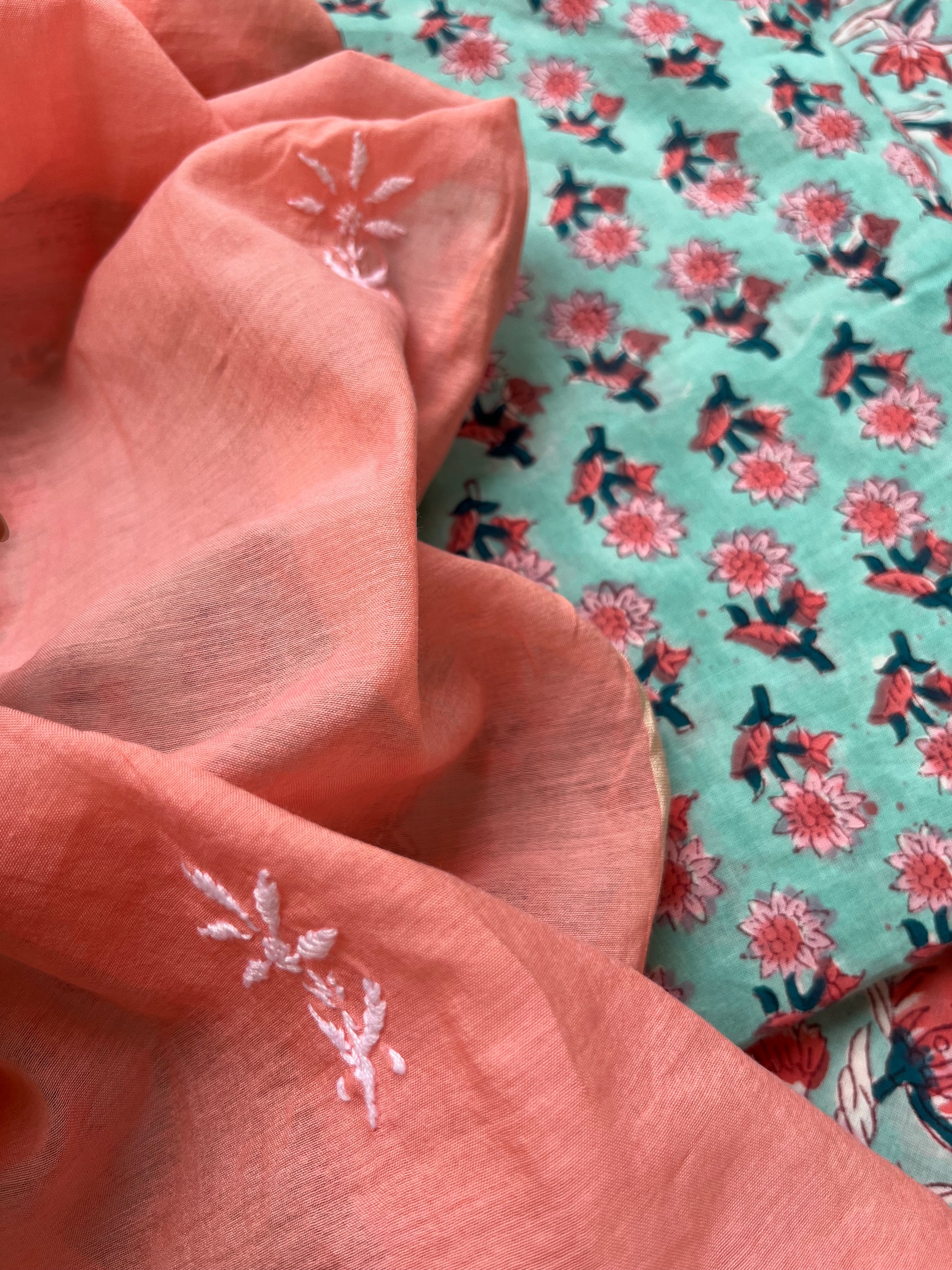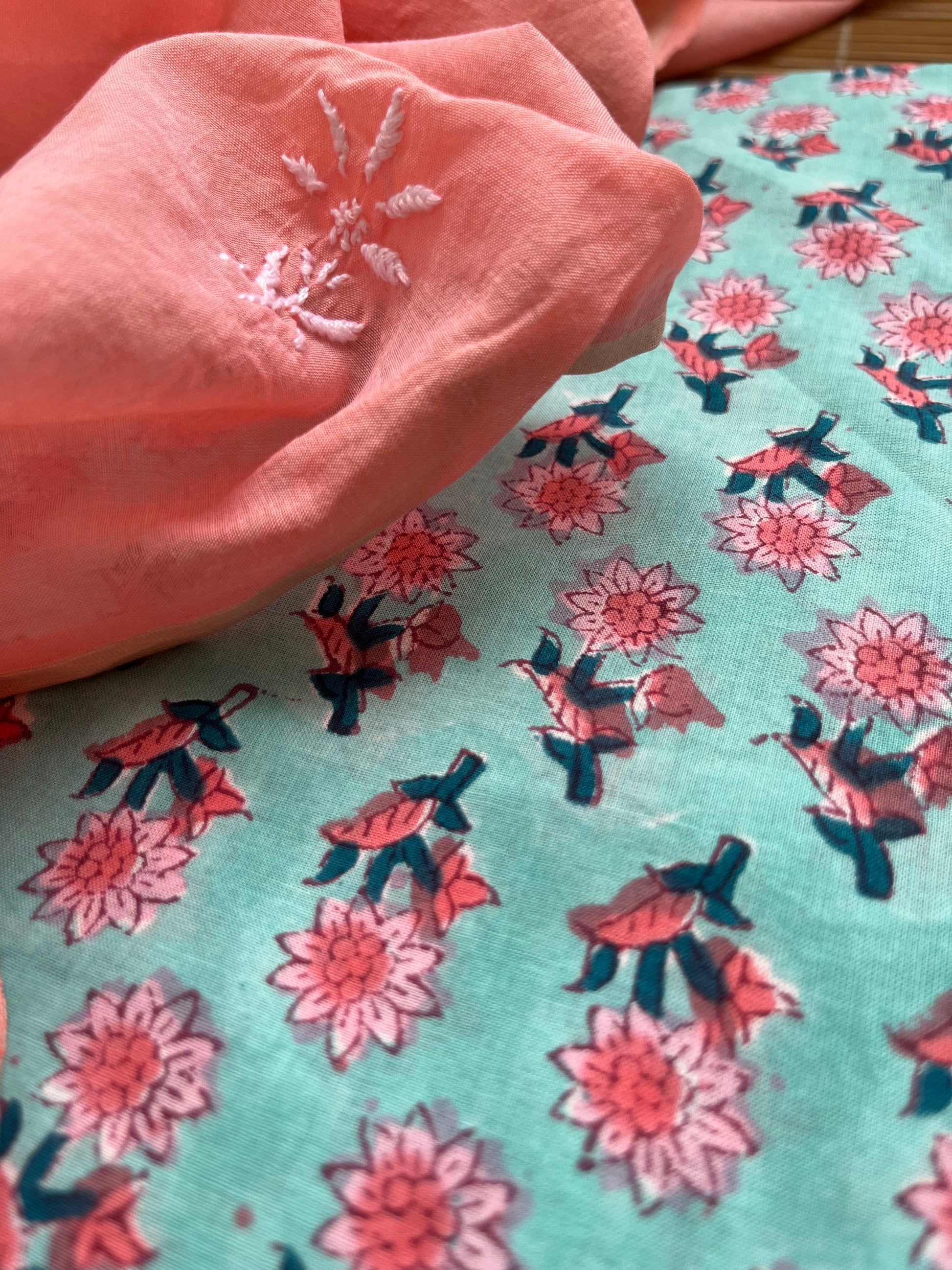Cotton block print kurta bottom fabric paired with a chanderi chikankari Dupatta