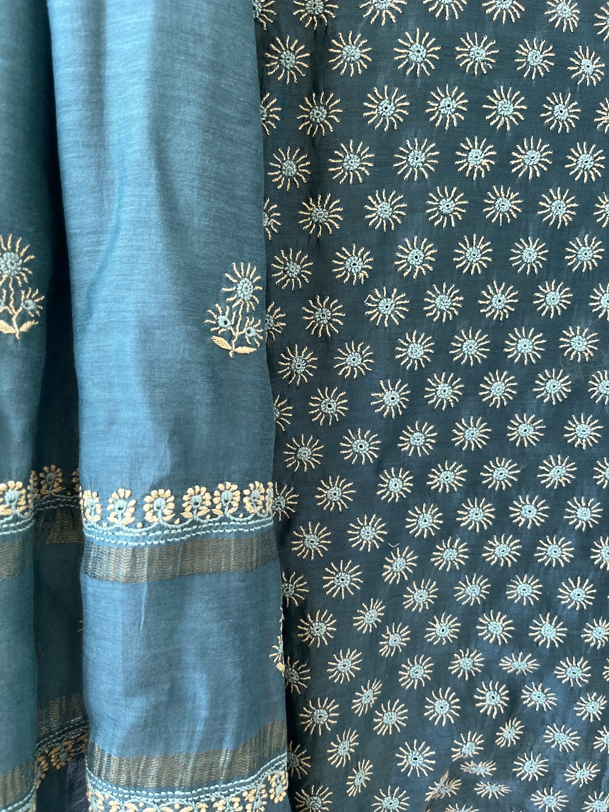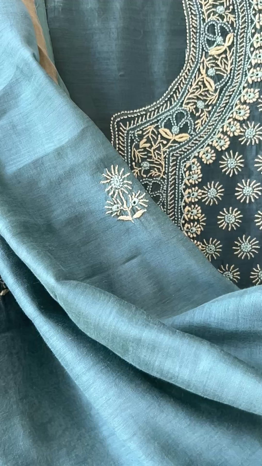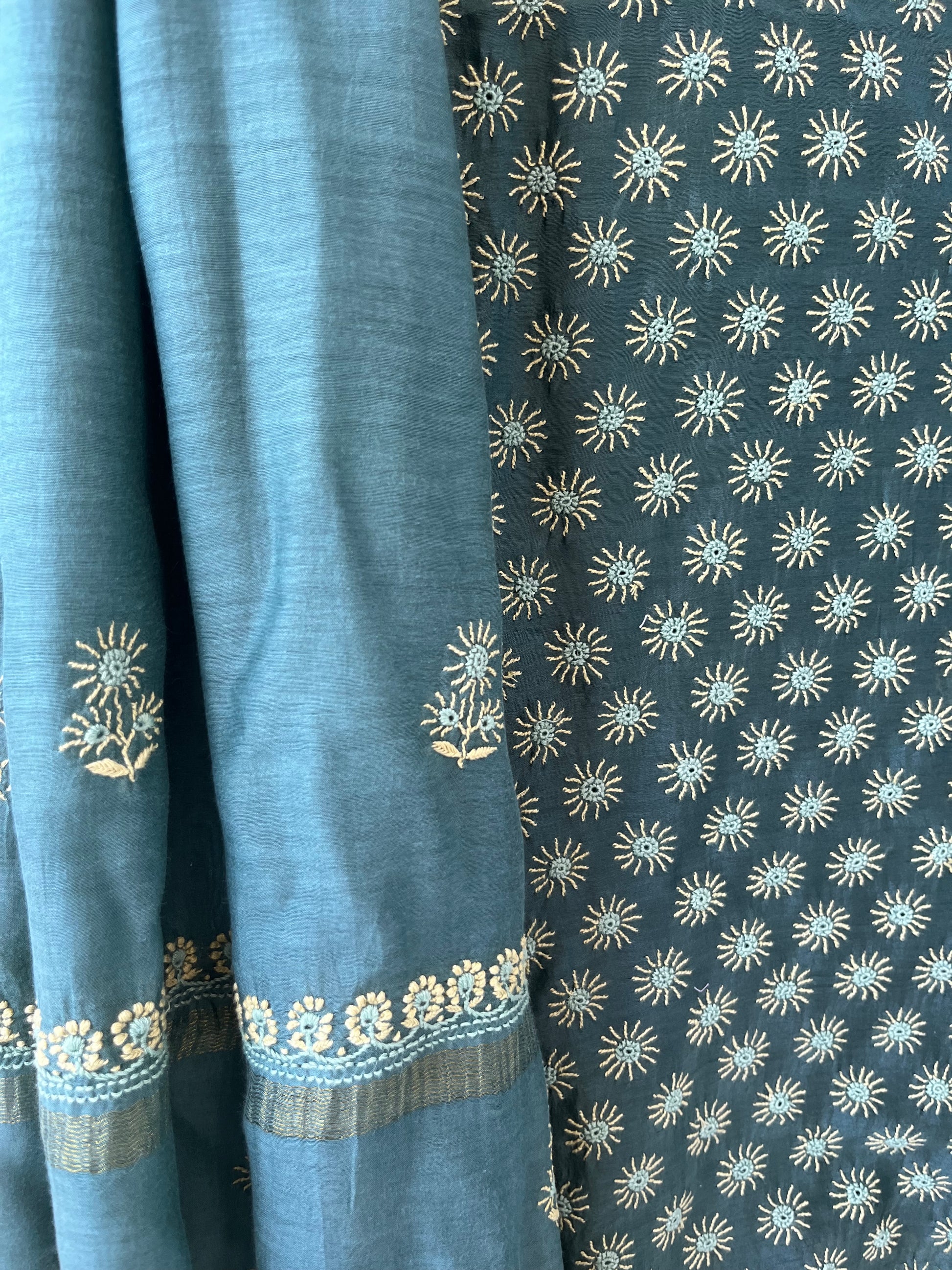 Chanderi Chikankari Kurta and Dupatta. Kurta has work all over front and Dupatta has bel on pall and buties