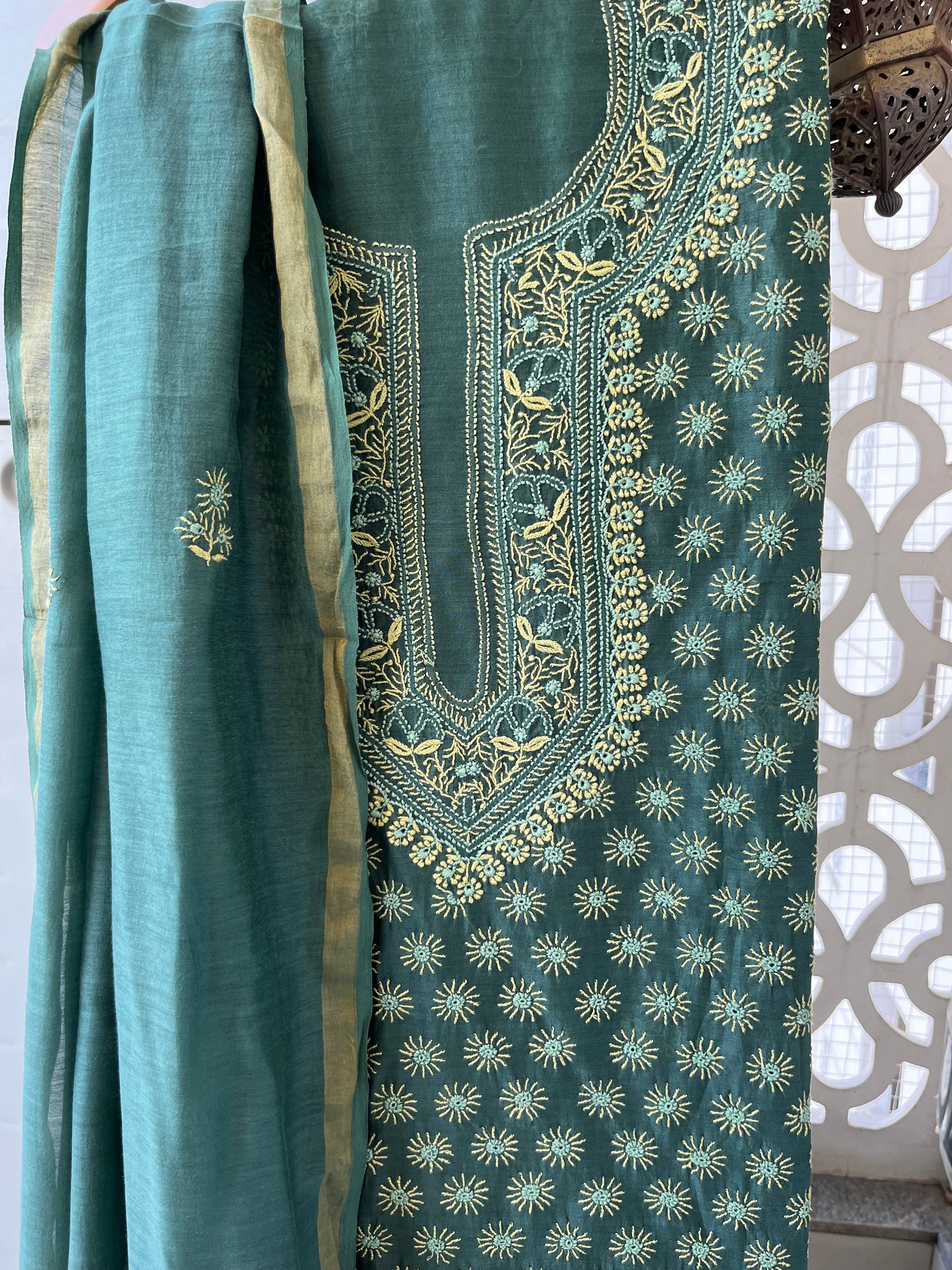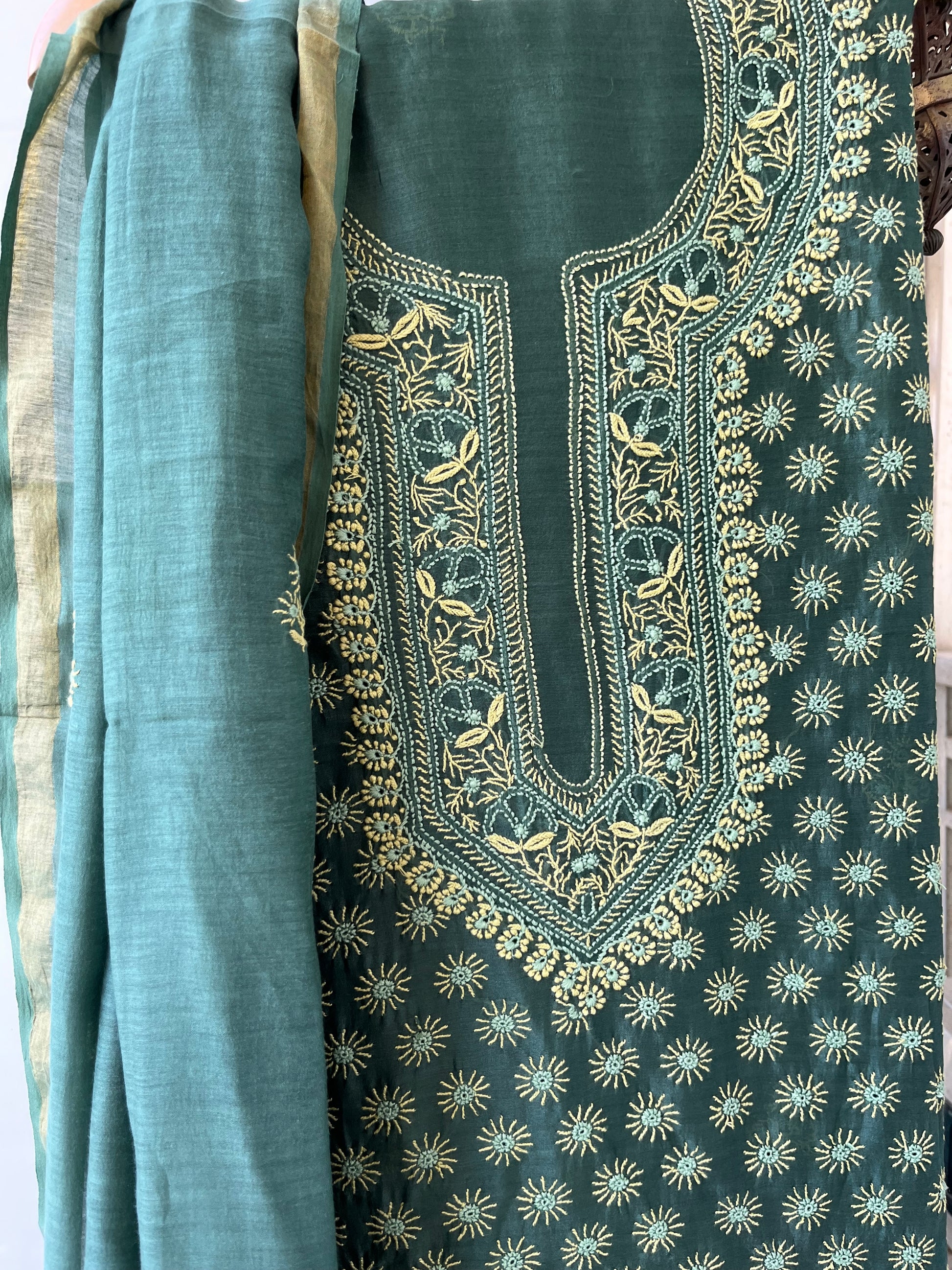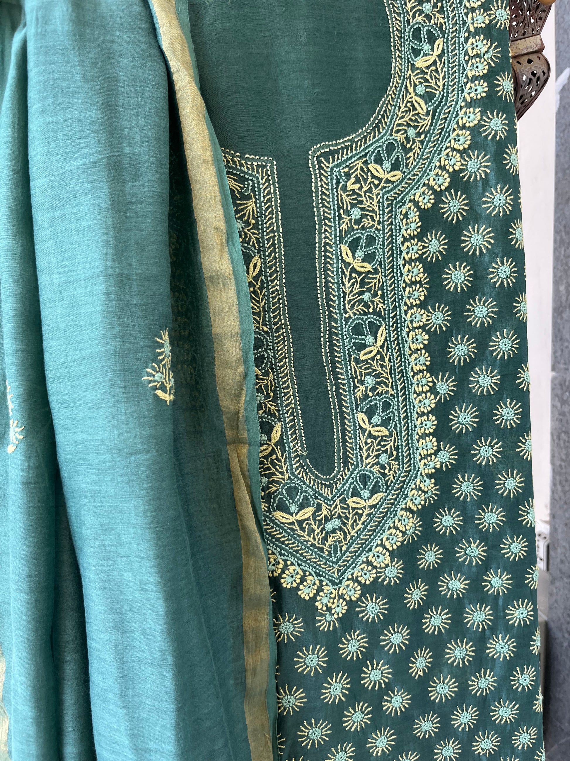 Chanderi Chikankari Kurta and Dupatta. Kurta has work all over front and Dupatta has bel on pall and buties