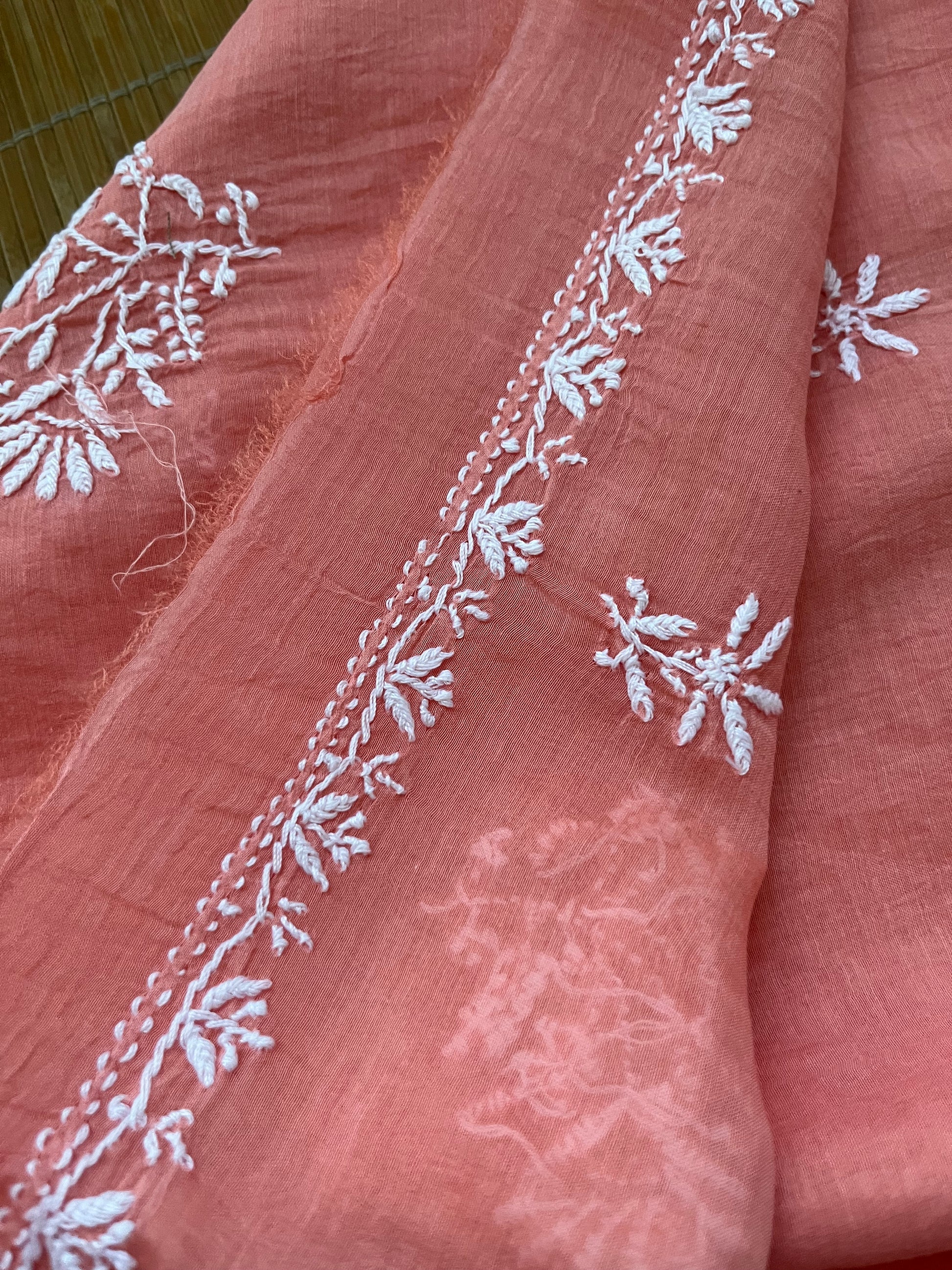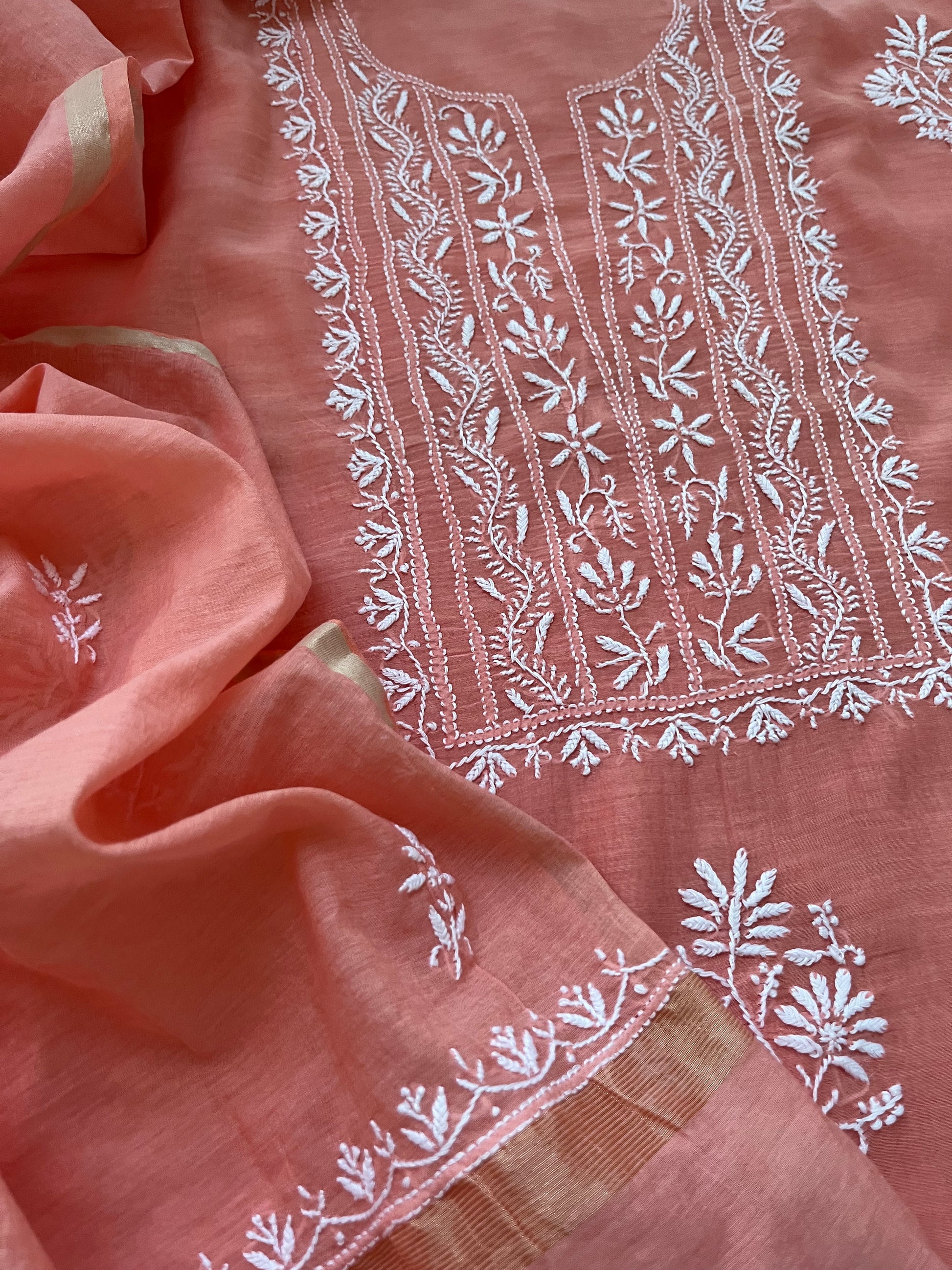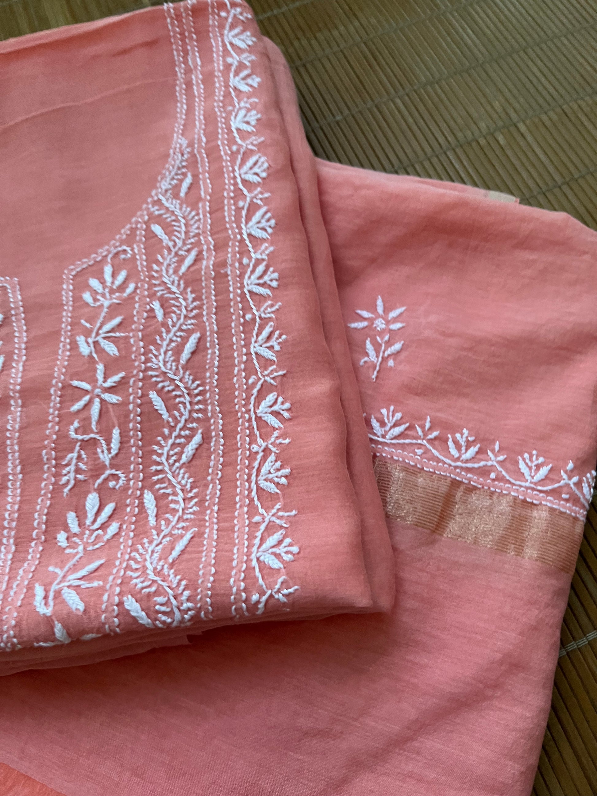 Chanderi Chikankari Kurta and Dupatta. Kurta has work all over front and Dupatta has bel on pallu and buties