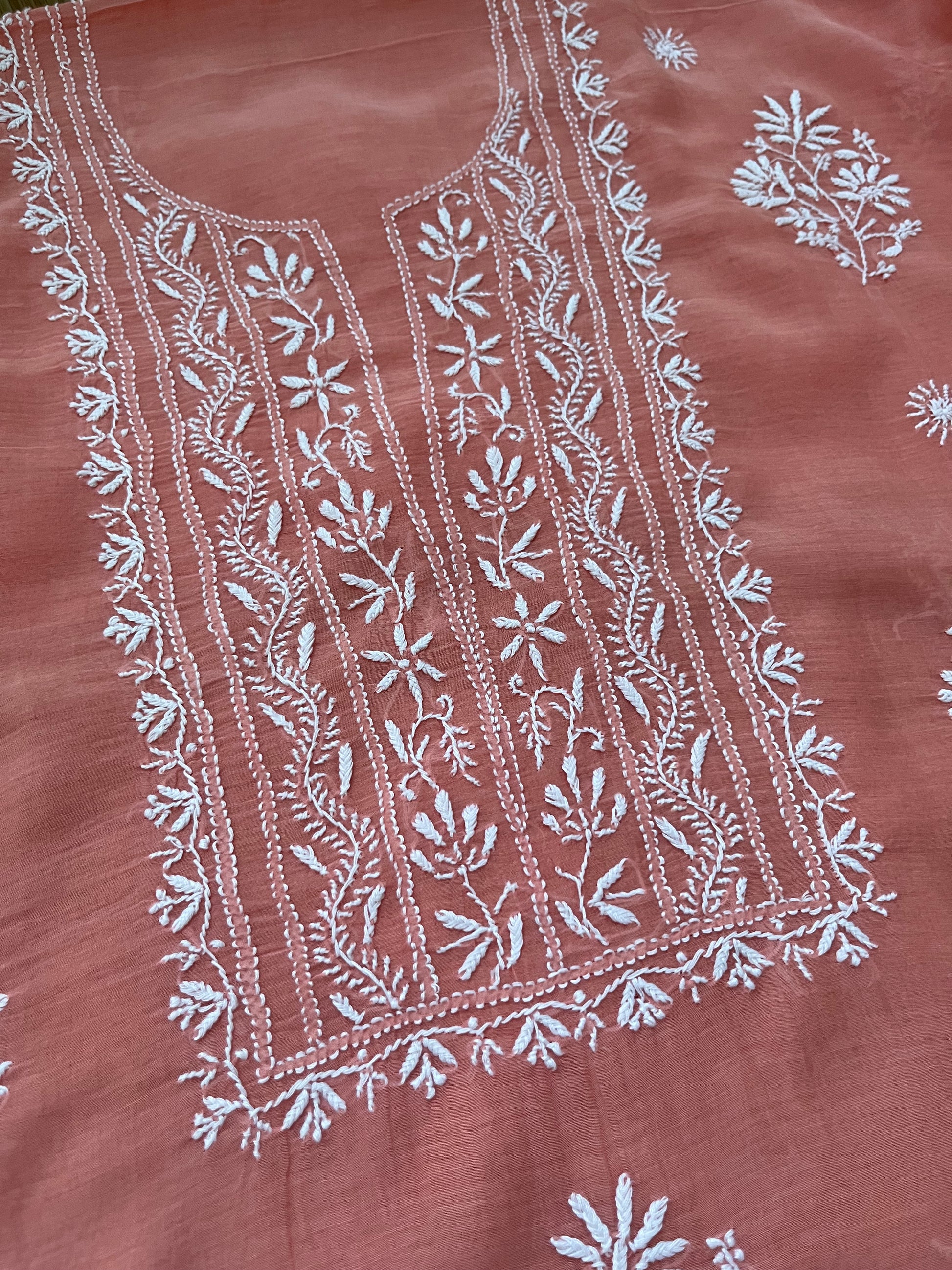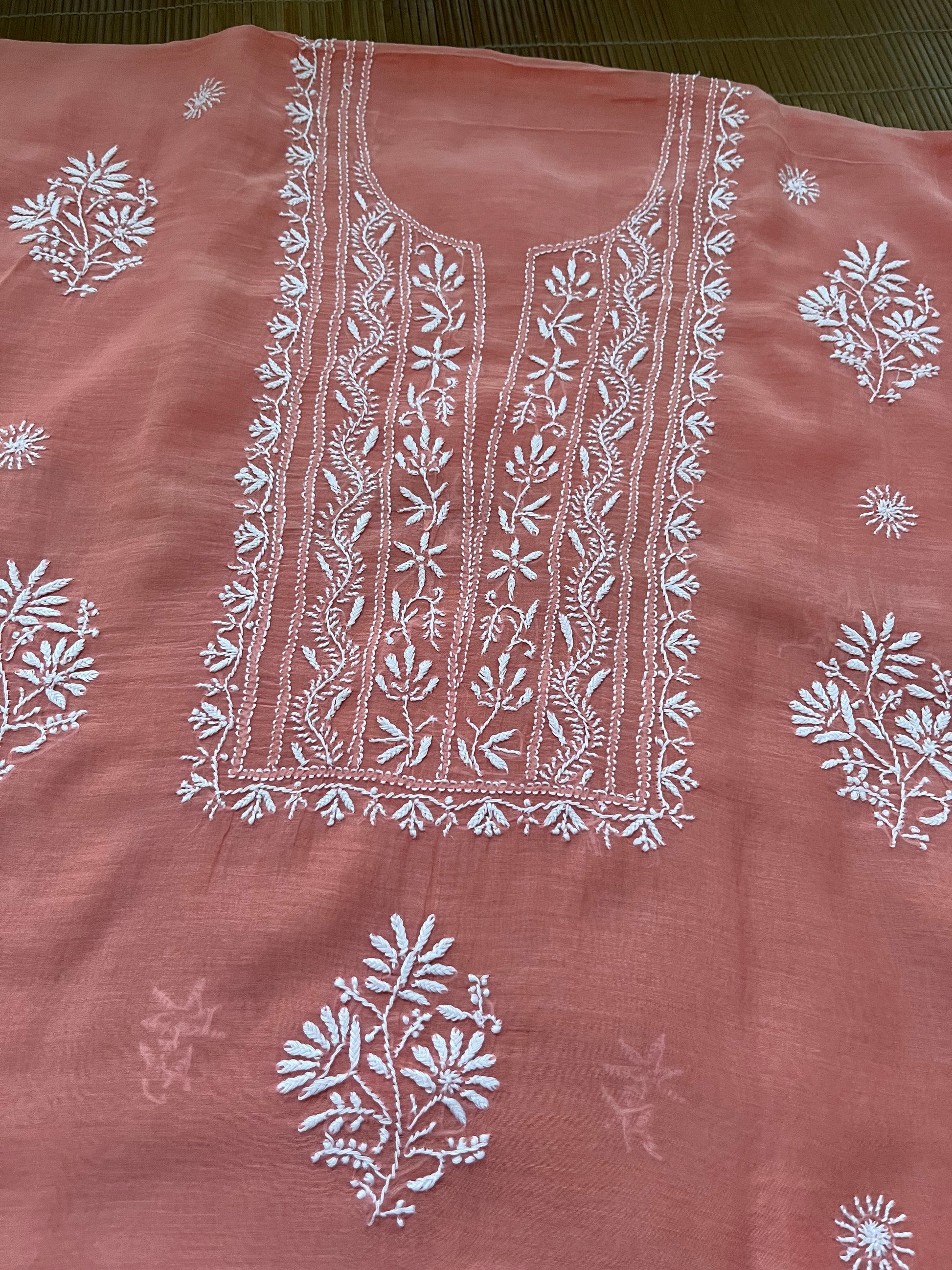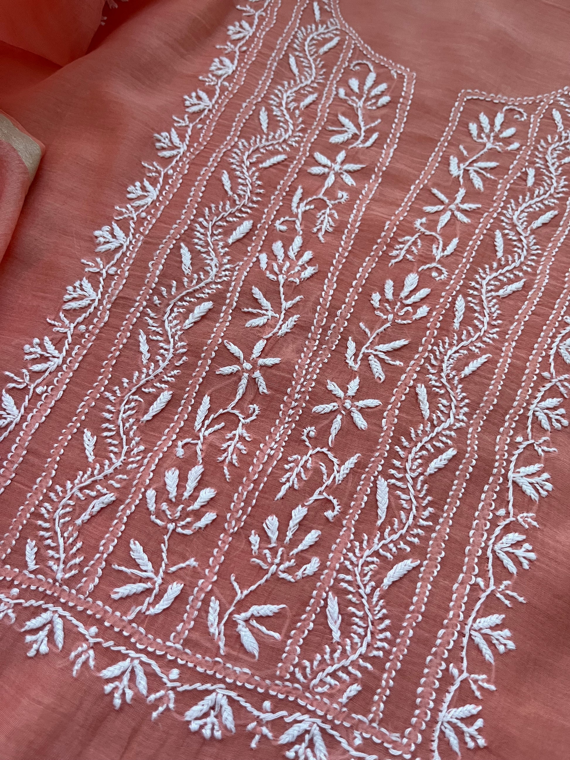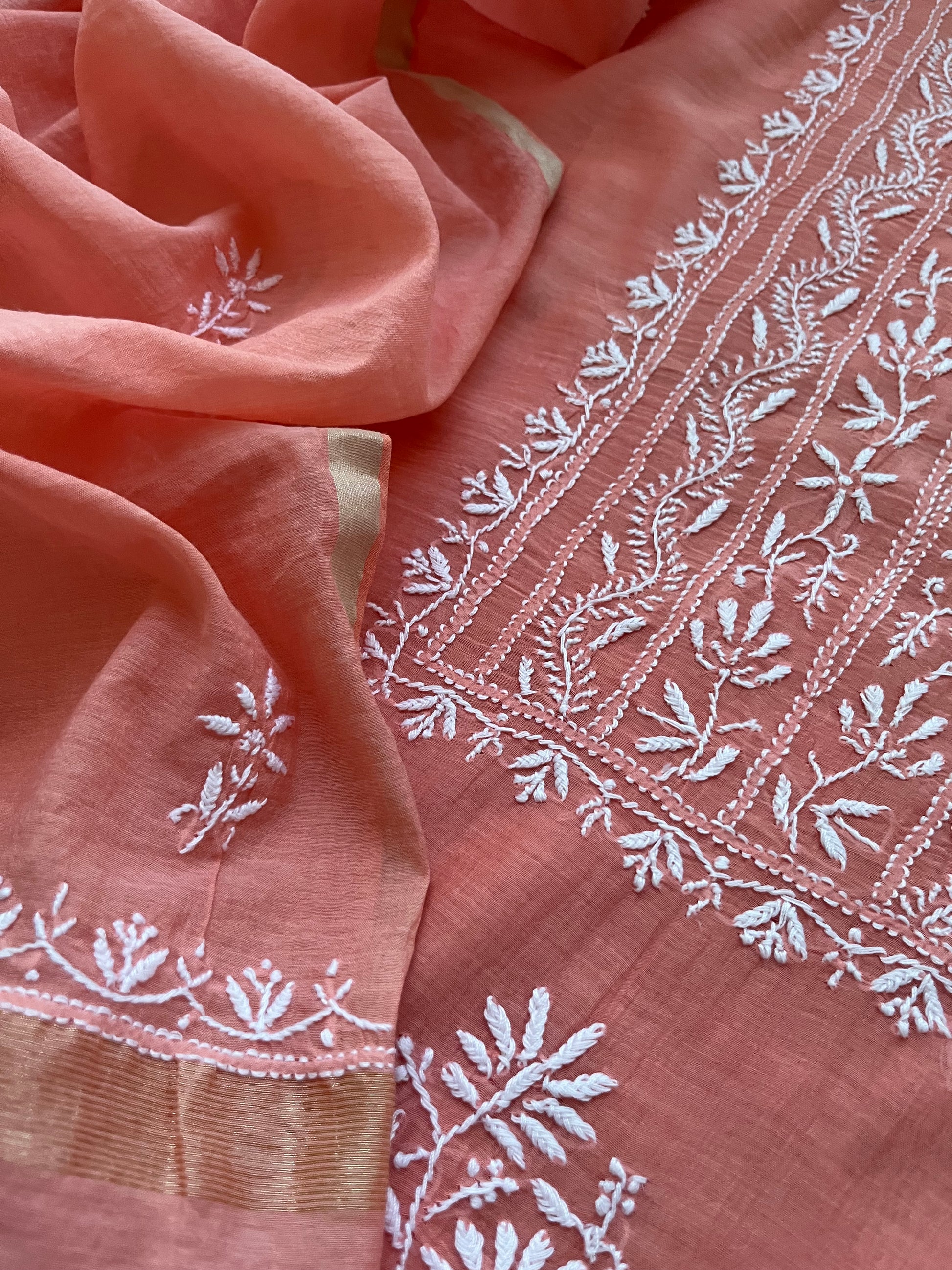 Chanderi Chikankari Kurta and Dupatta. Kurta has work all over front and Dupatta has bel on pallu and buties