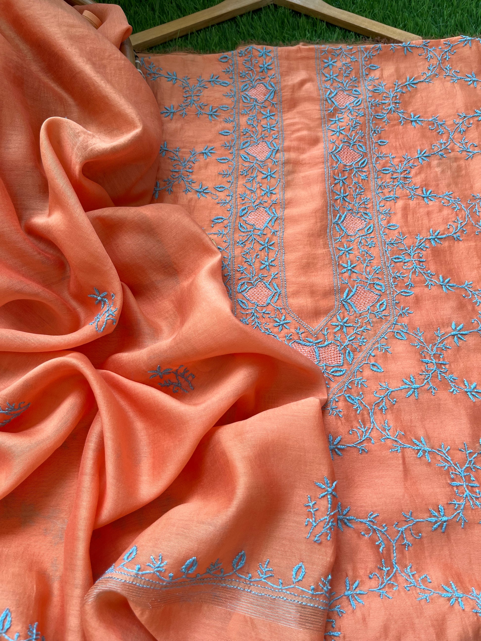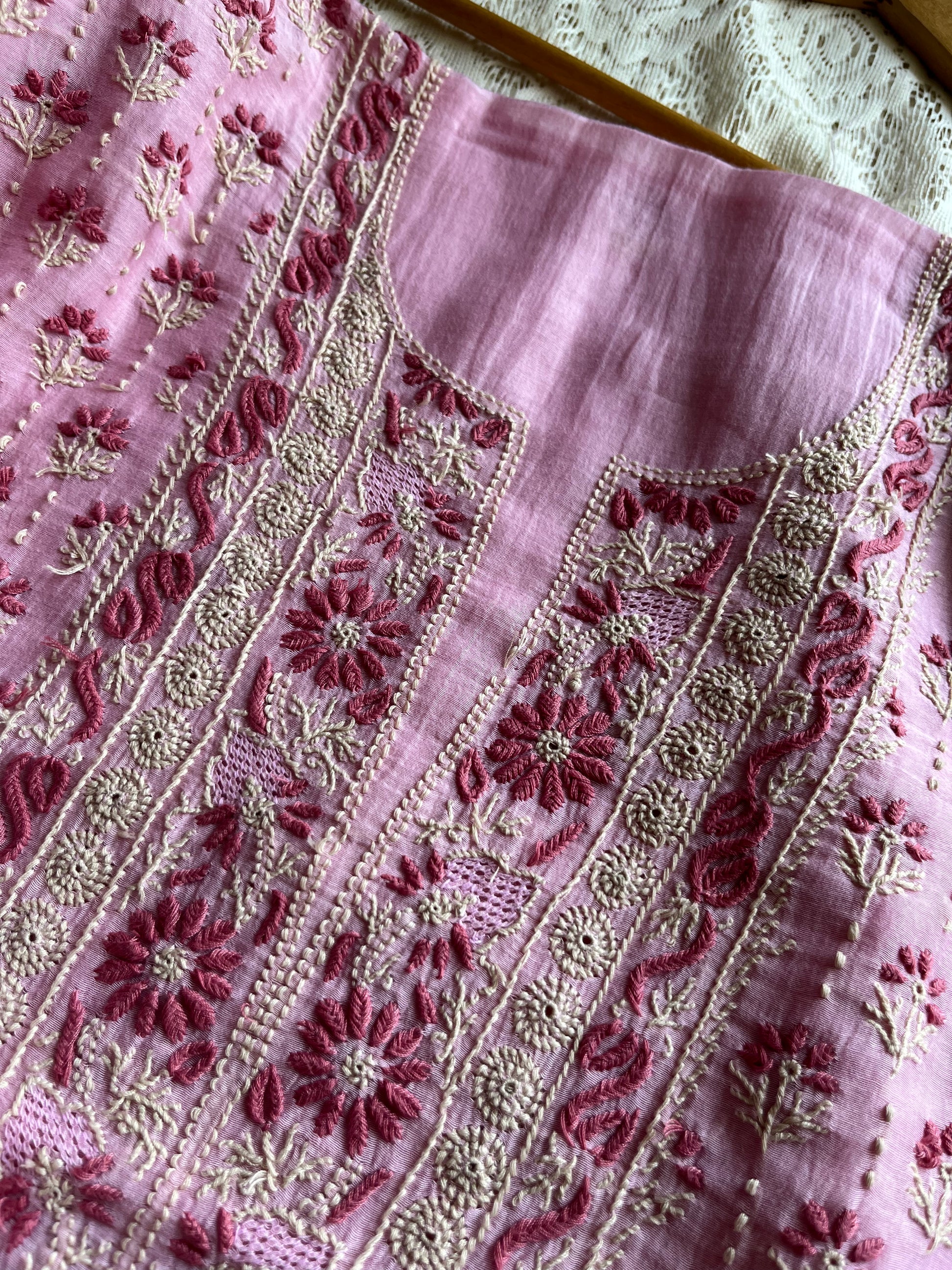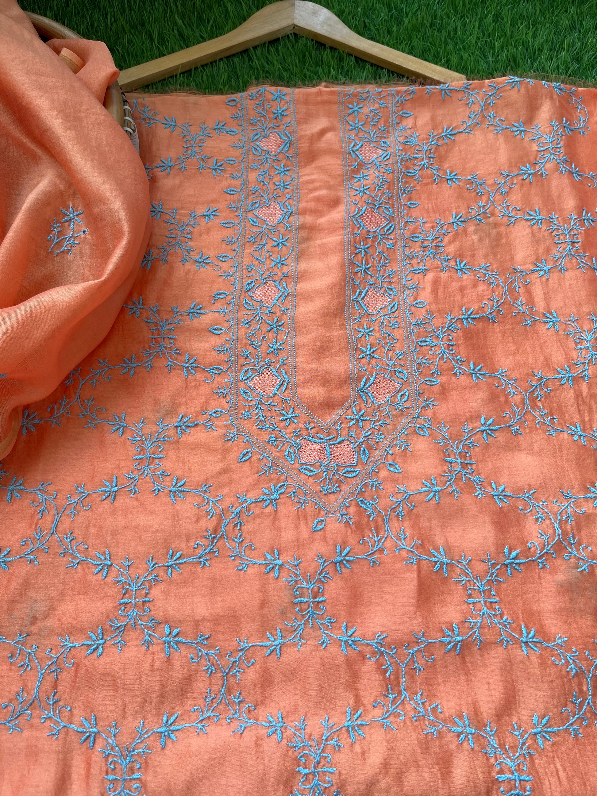 Chanderi chikankari kurta dupatta. Kurta has work all over front sleeves has hemline and boities .