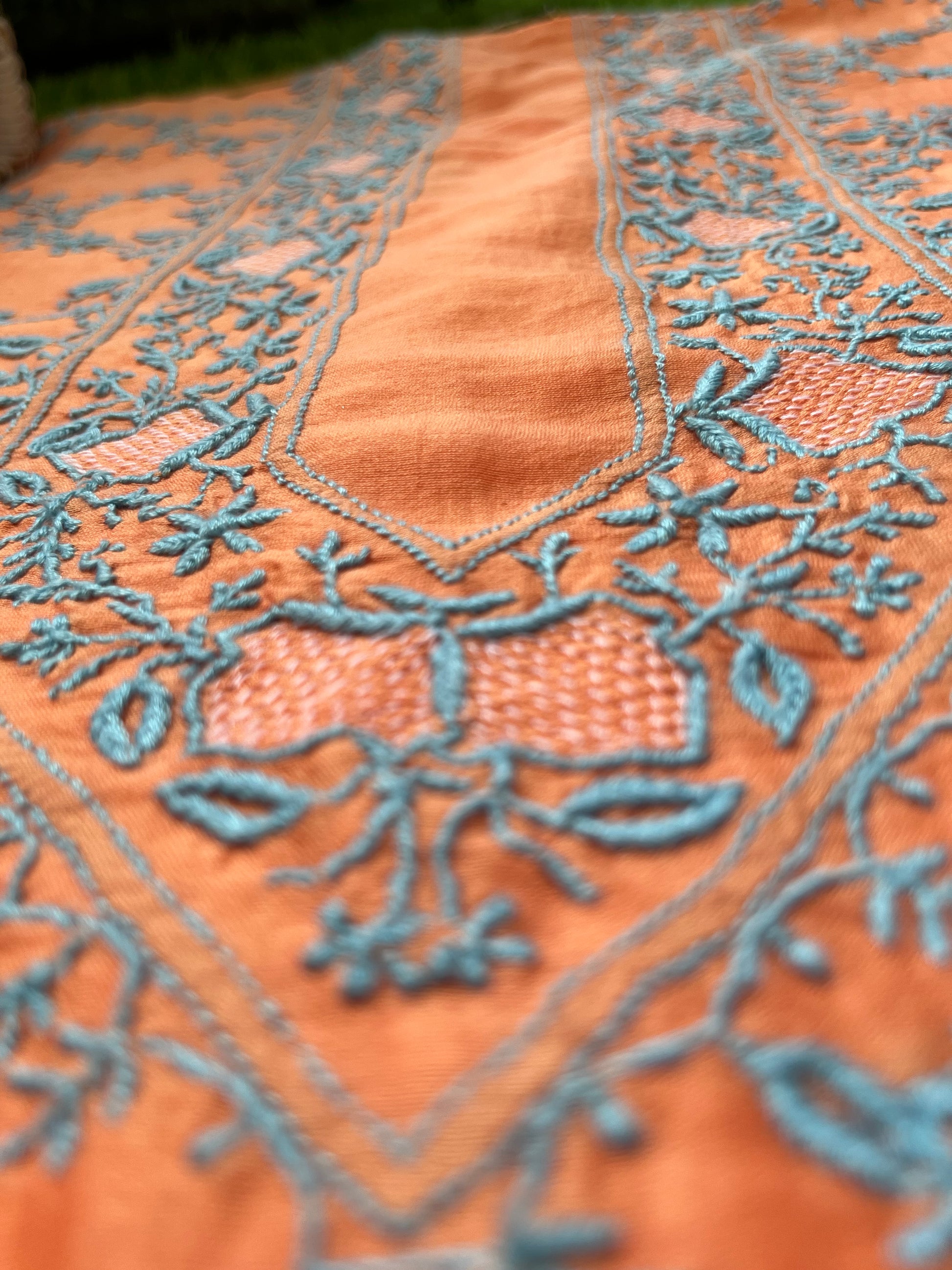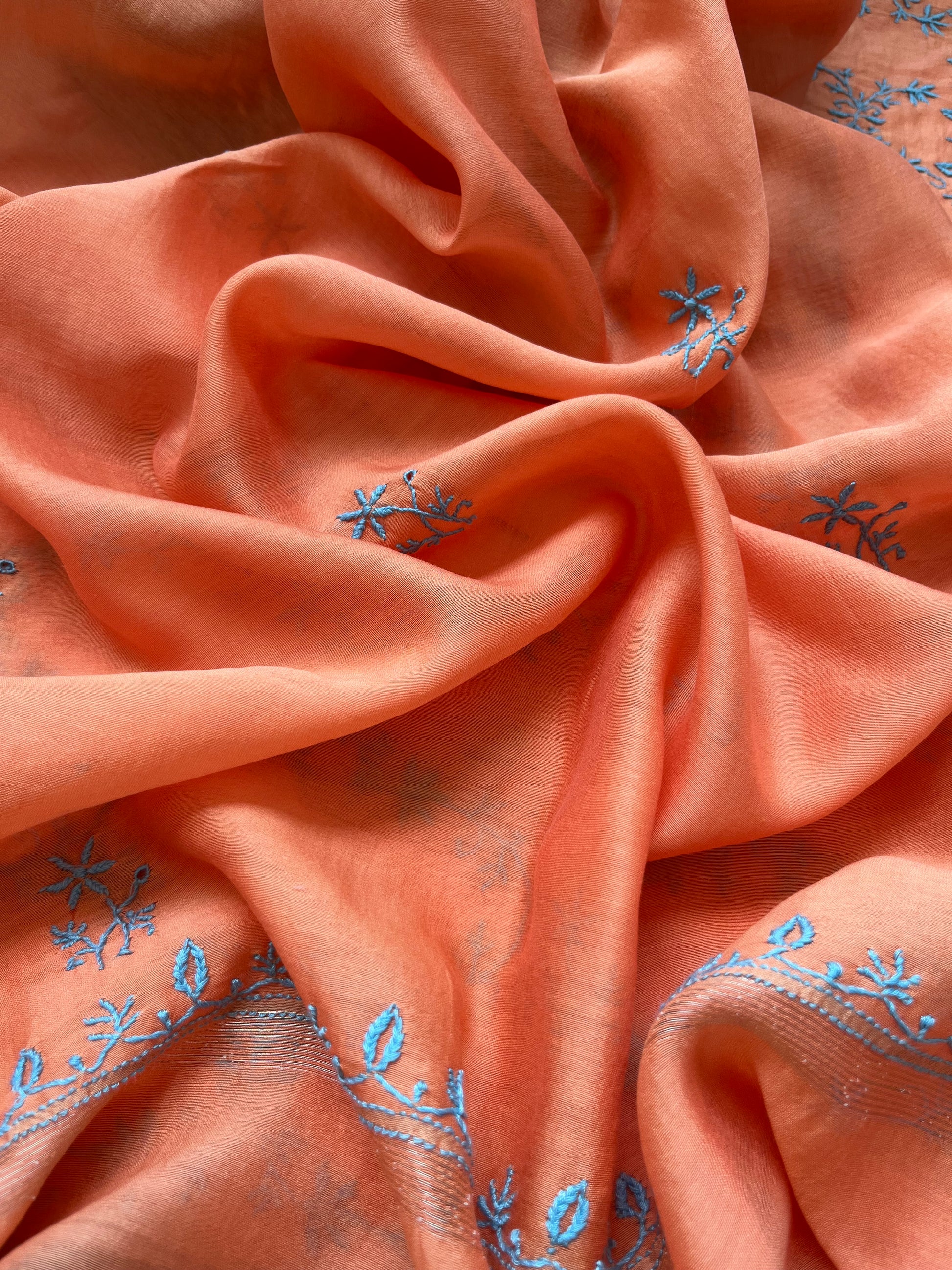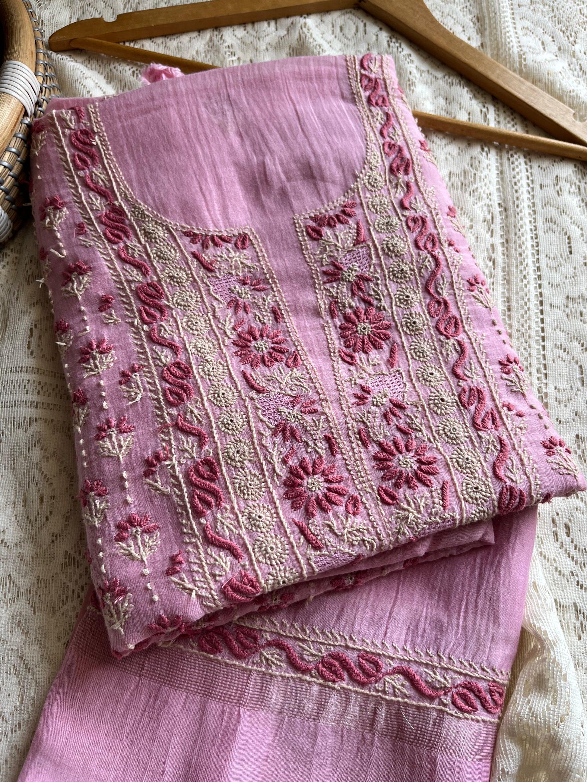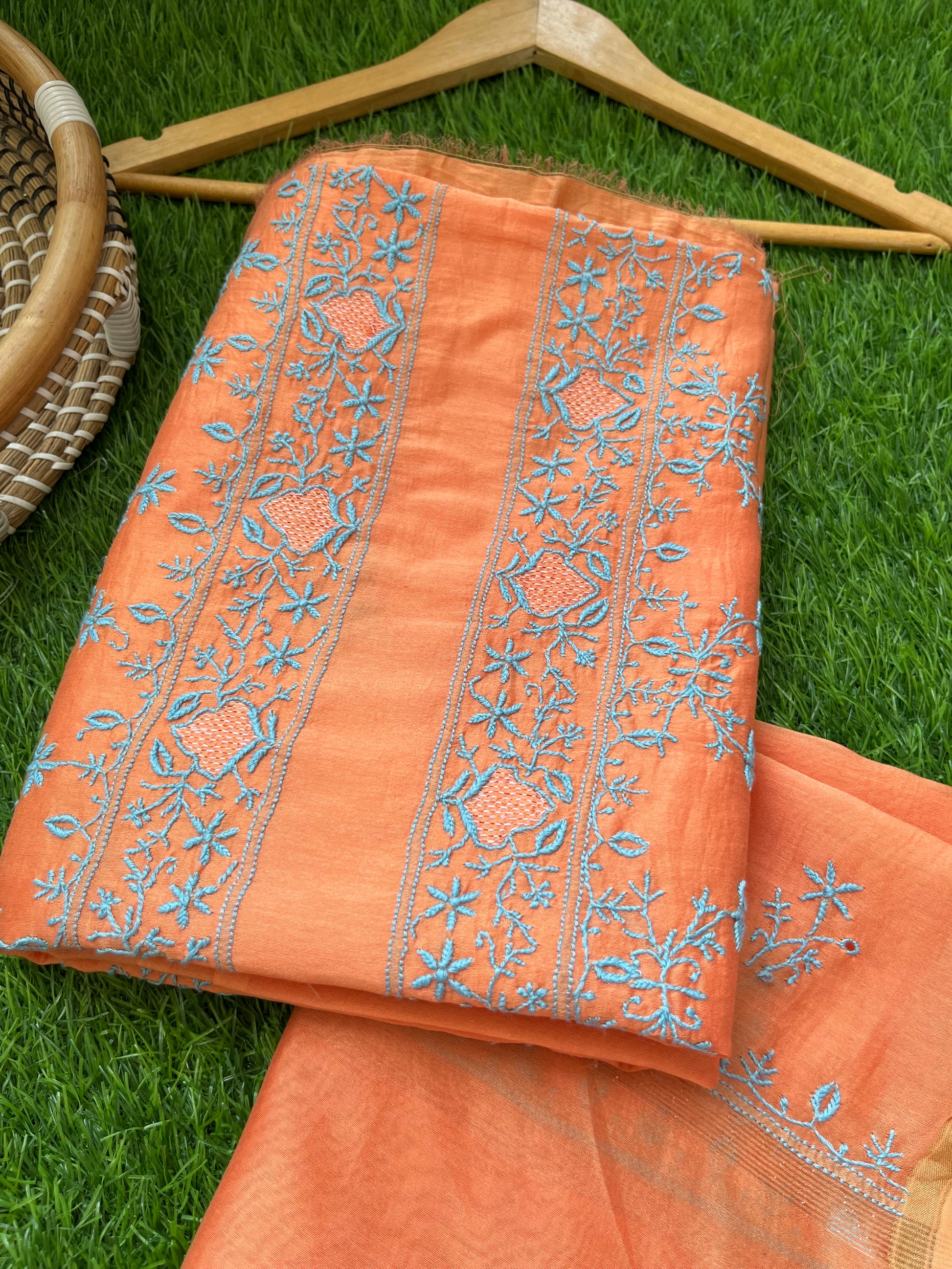 Chanderi chikankari kurta dupatta. Kurta has work all over front sleeves has hemline and boities .