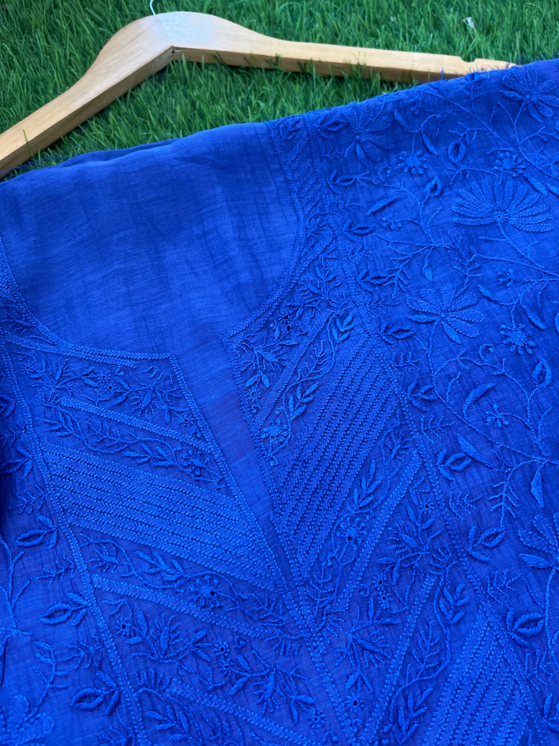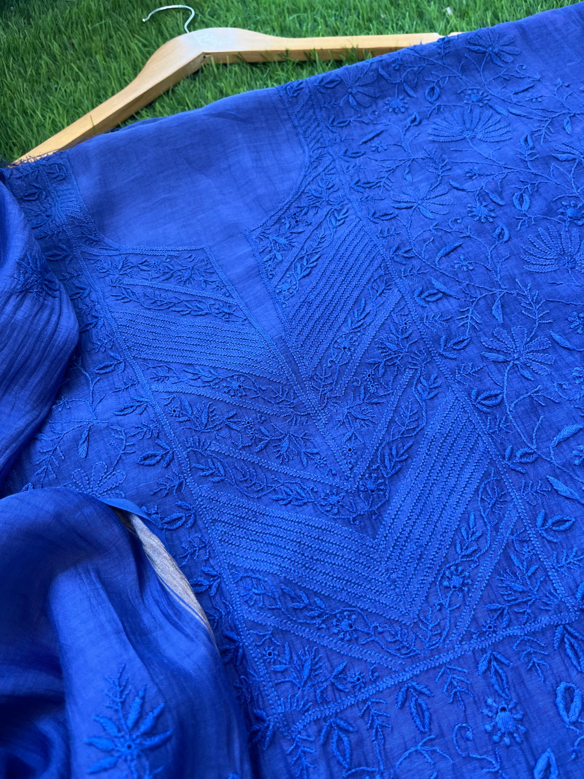 Chanderi chikankari kurta dupatta. Kurta has work all over front sleeves has hemline and boities .
