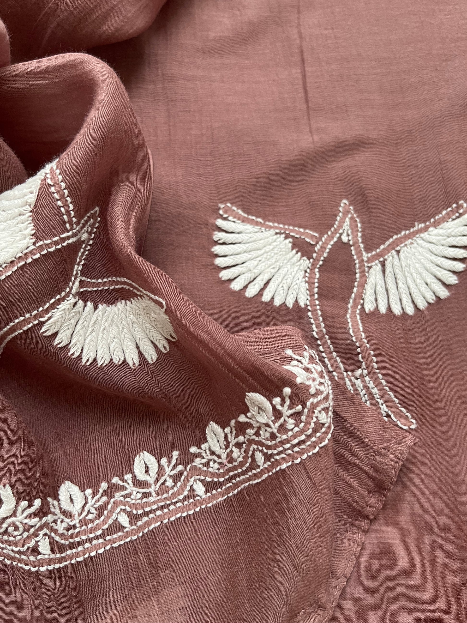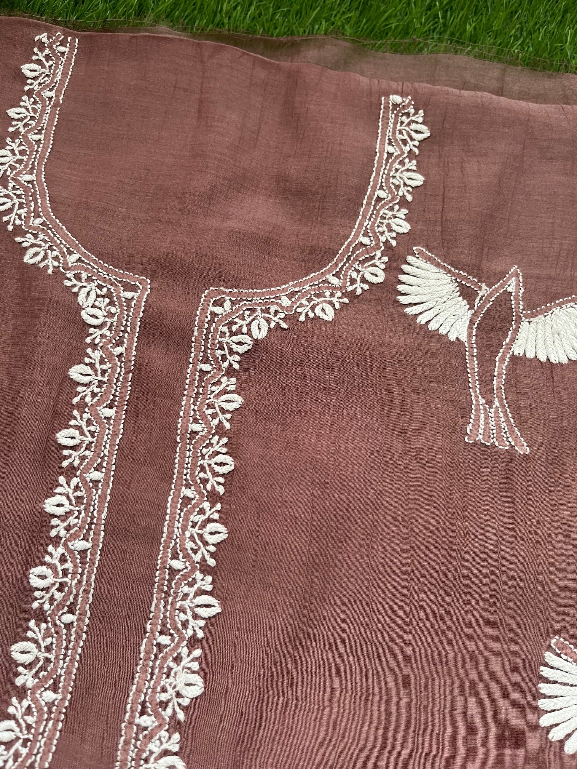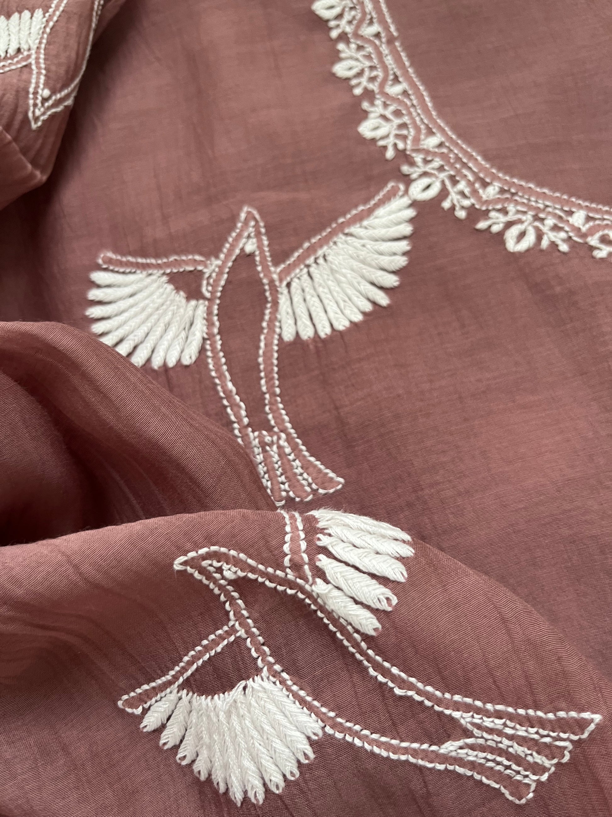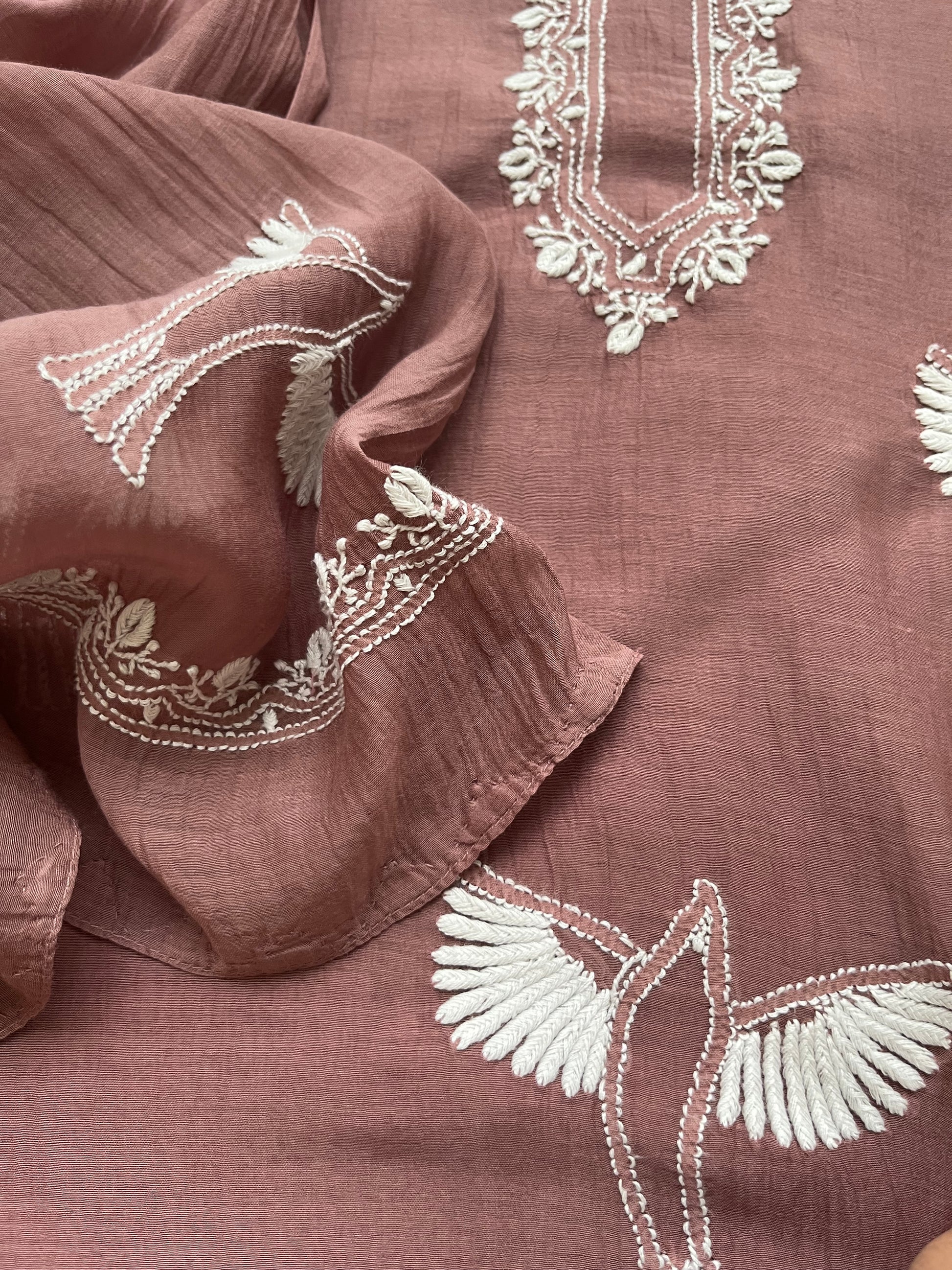 Chanderi chikankari kurta dupatta. Kurta has chidiya all over front sleeves has motifs and bel.