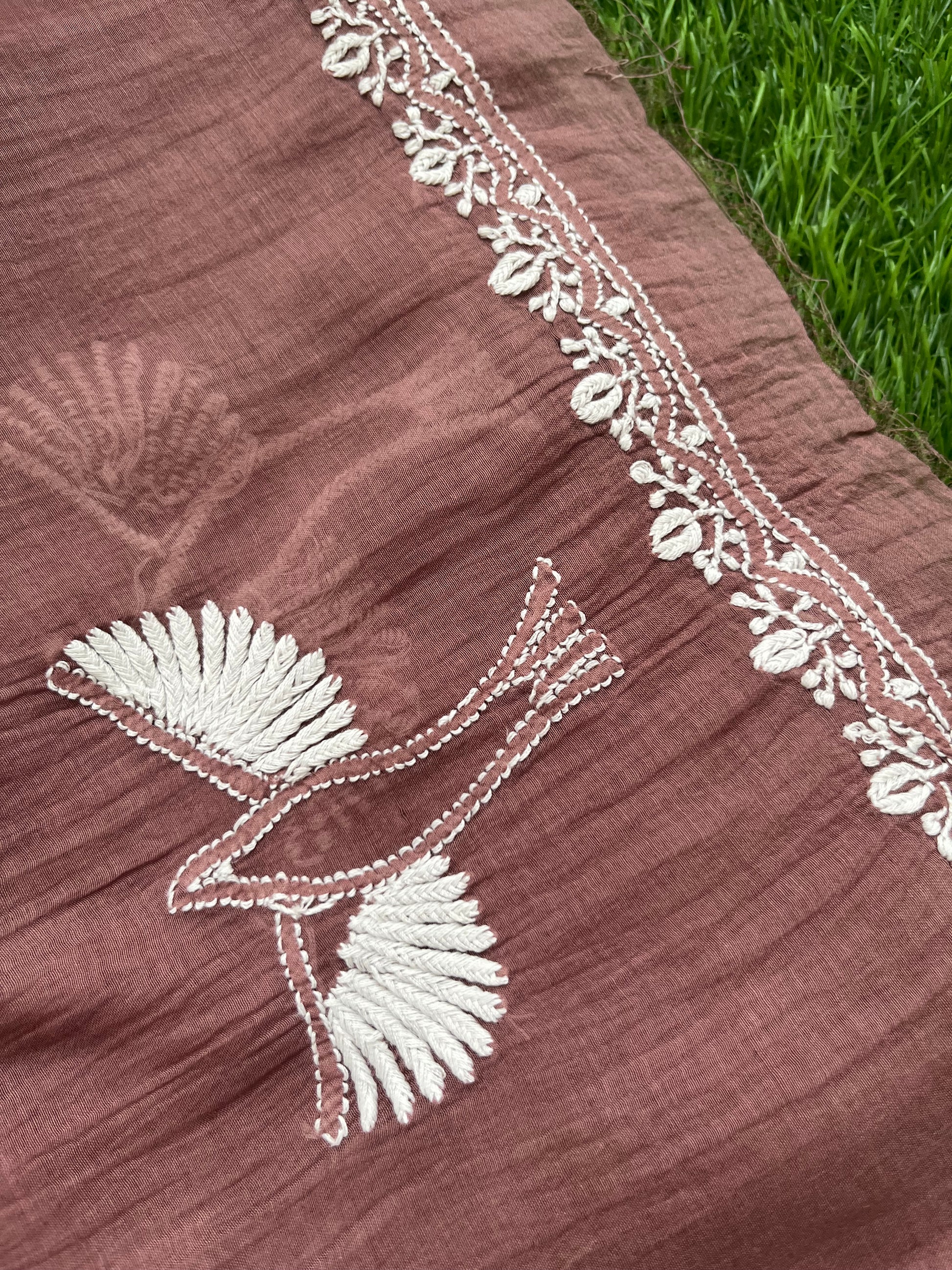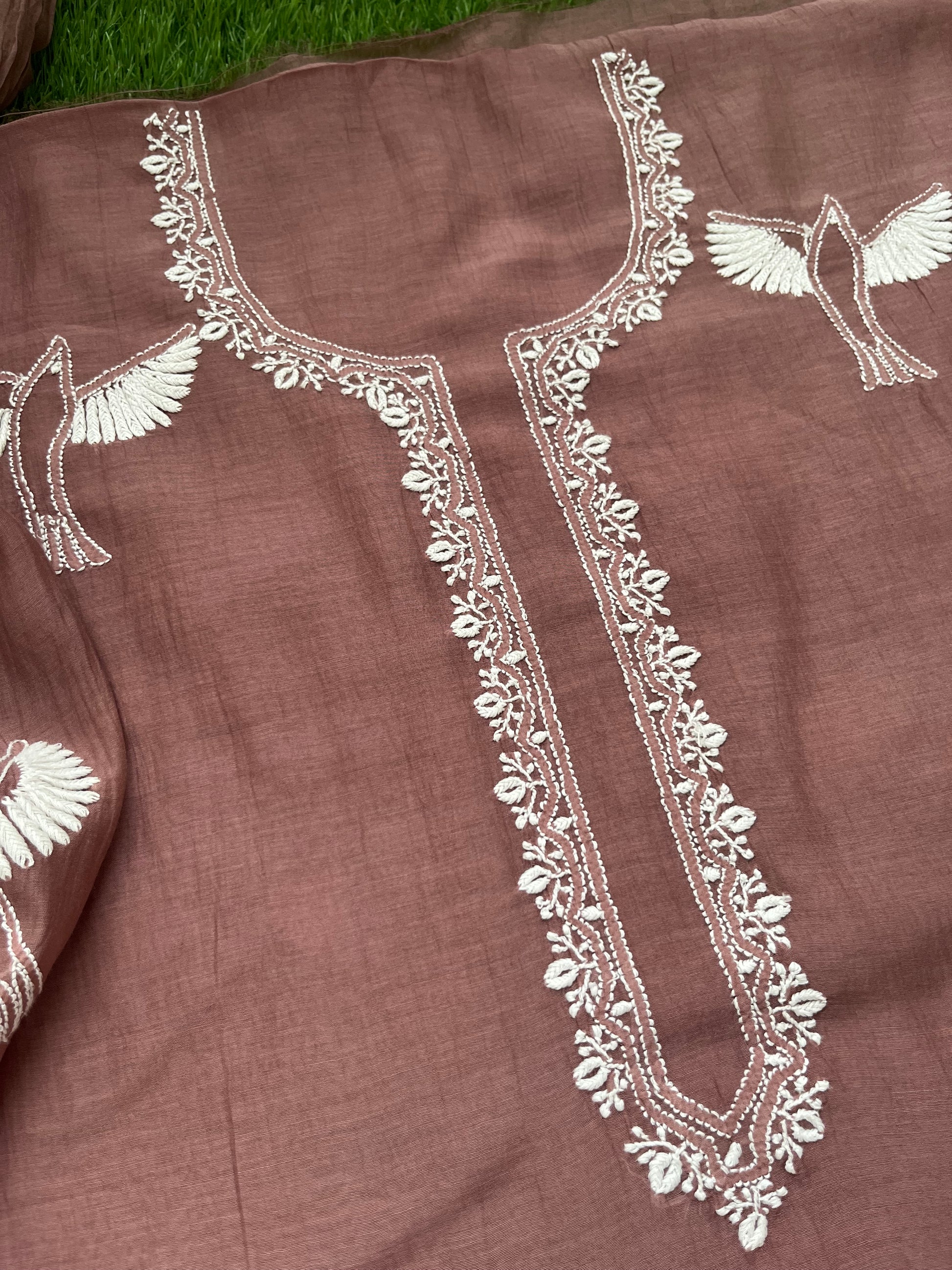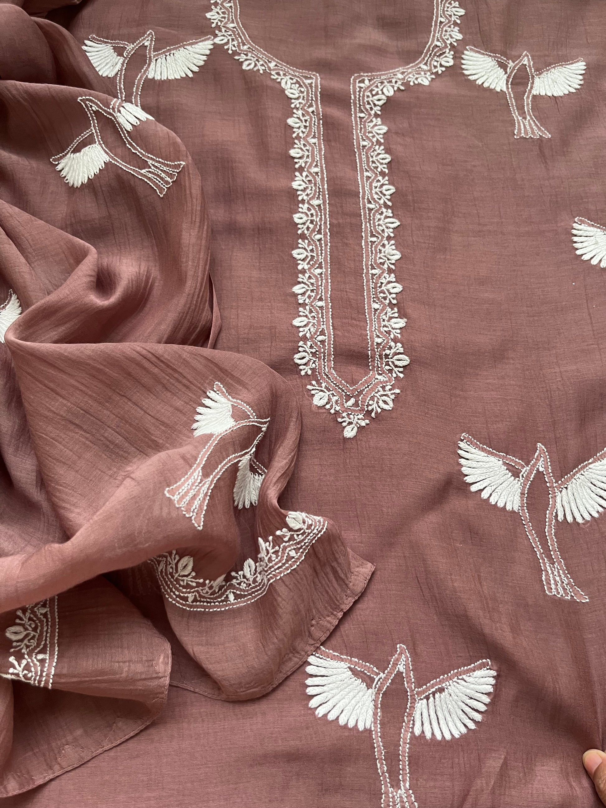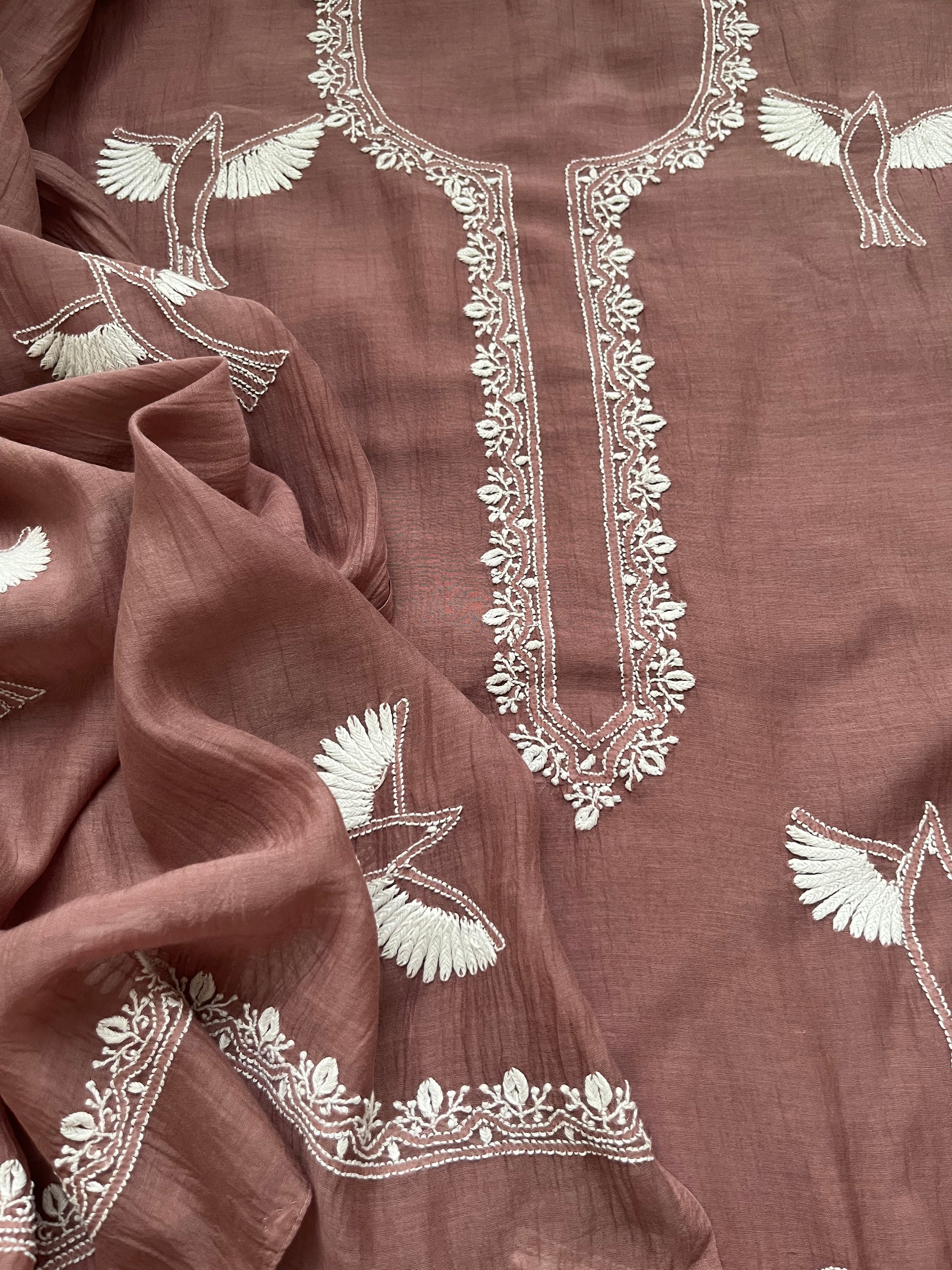 Chanderi chikankari kurta dupatta. Kurta has chidiya all over front sleeves has motifs and bel.