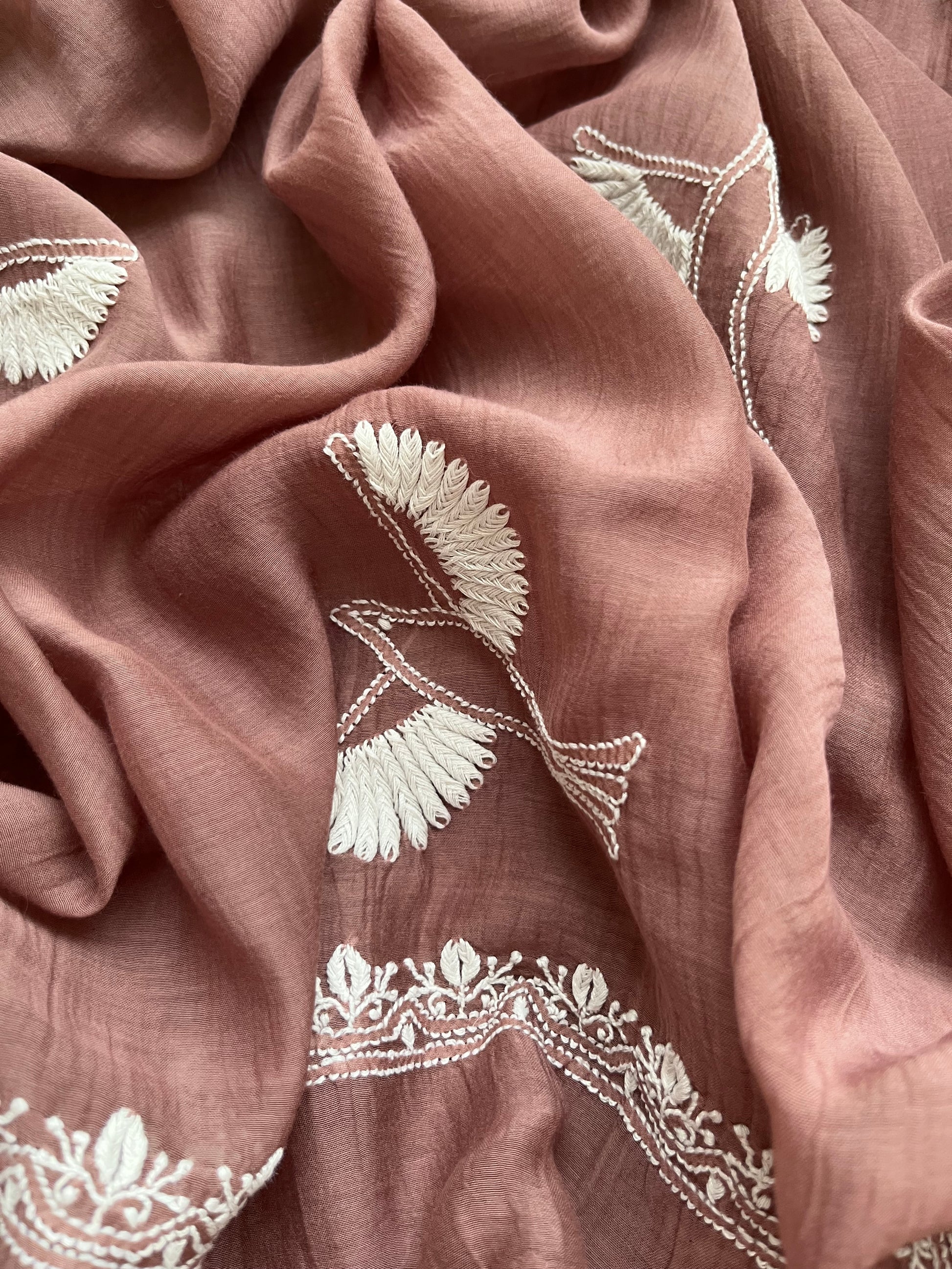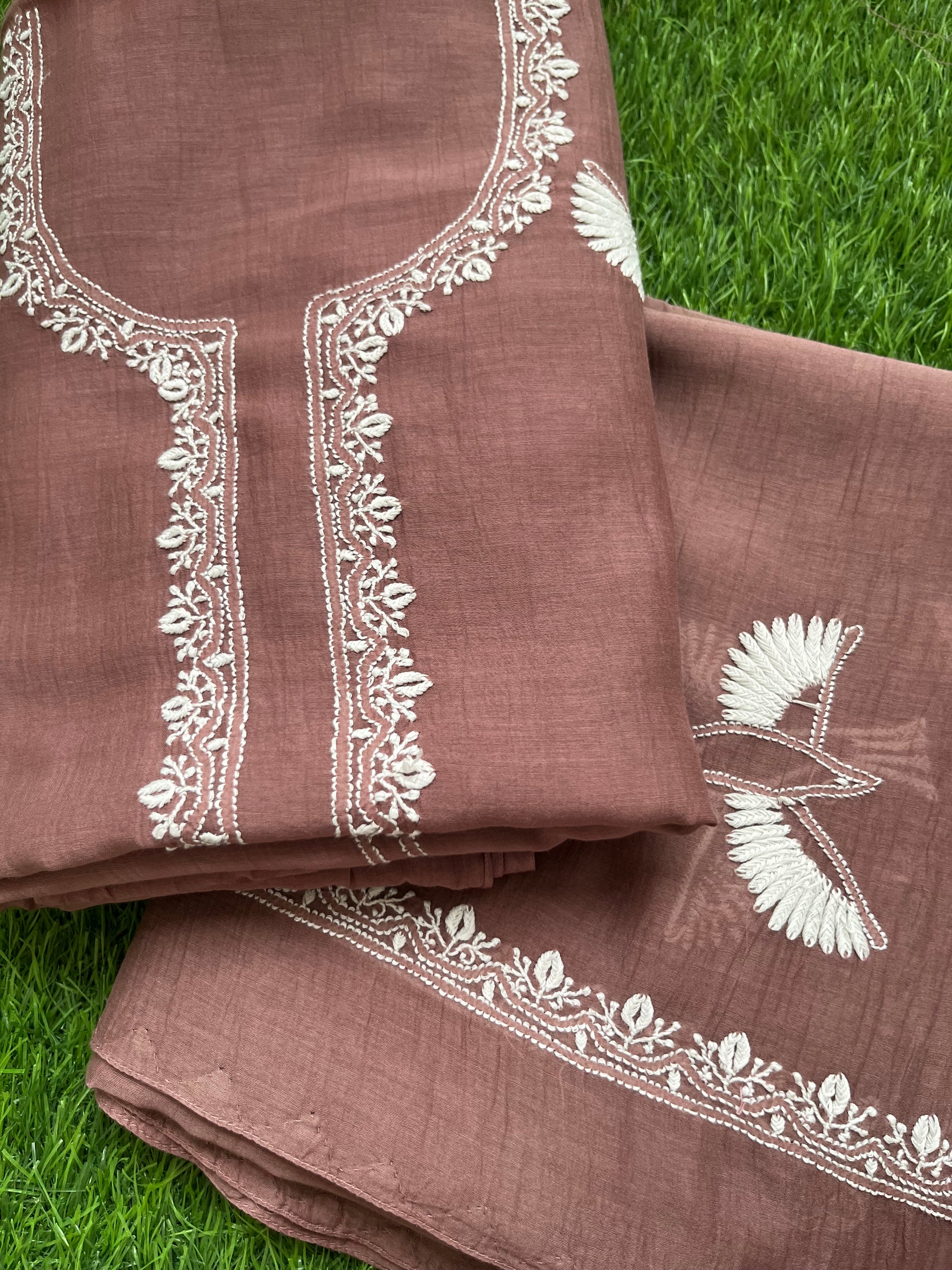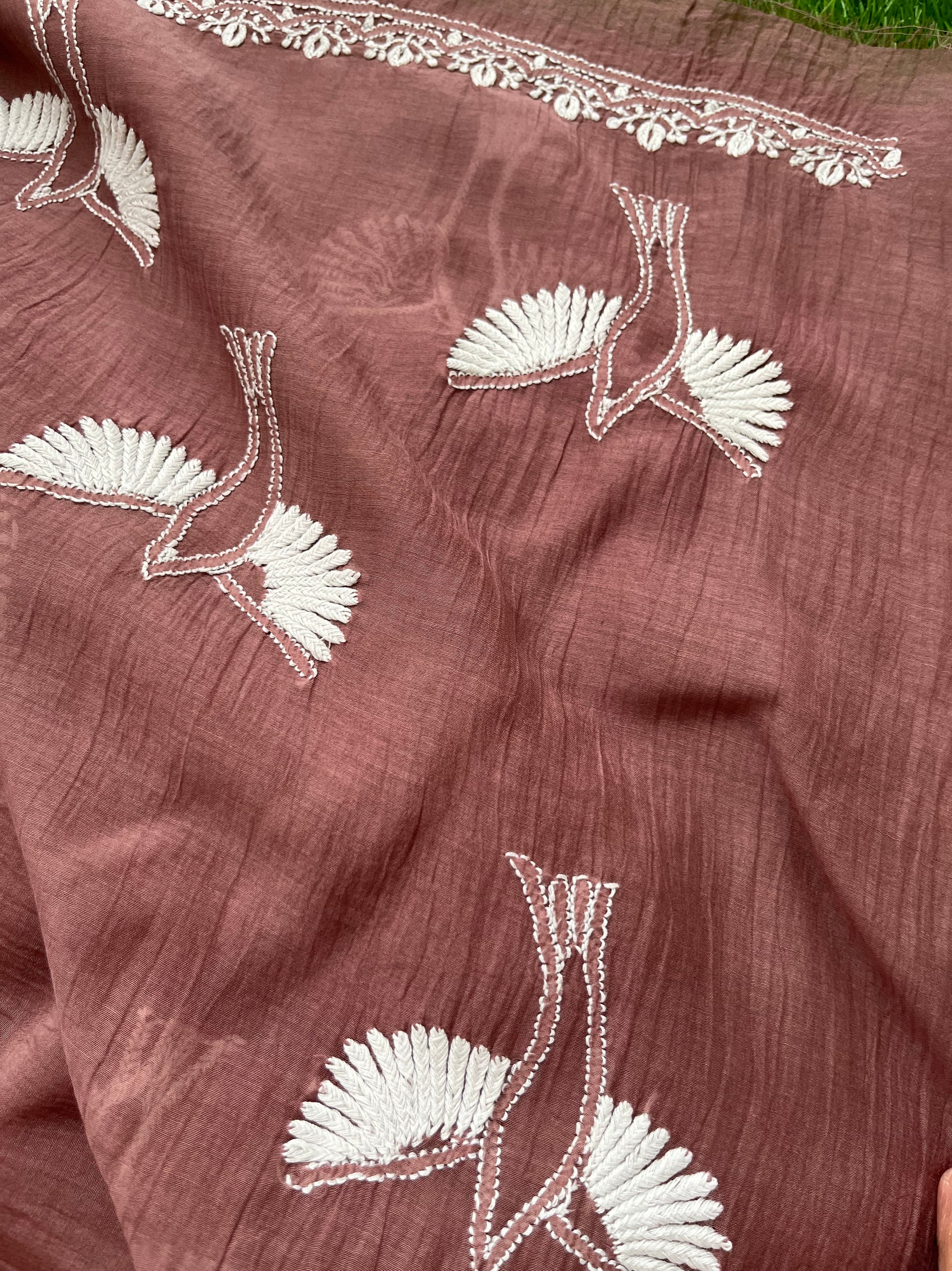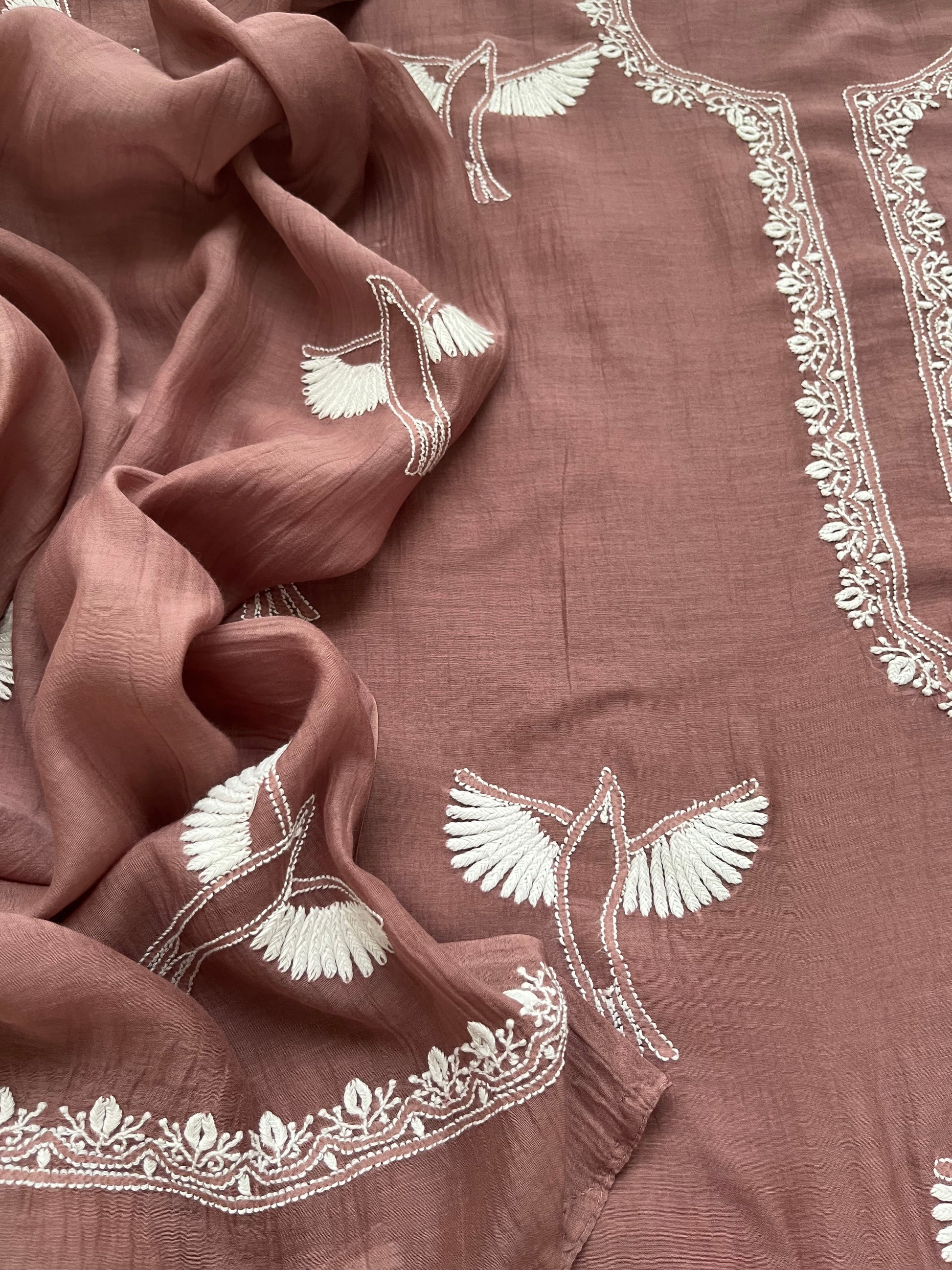 Chanderi chikankari kurta dupatta. Kurta has chidiya all over front sleeves has motifs and bel.