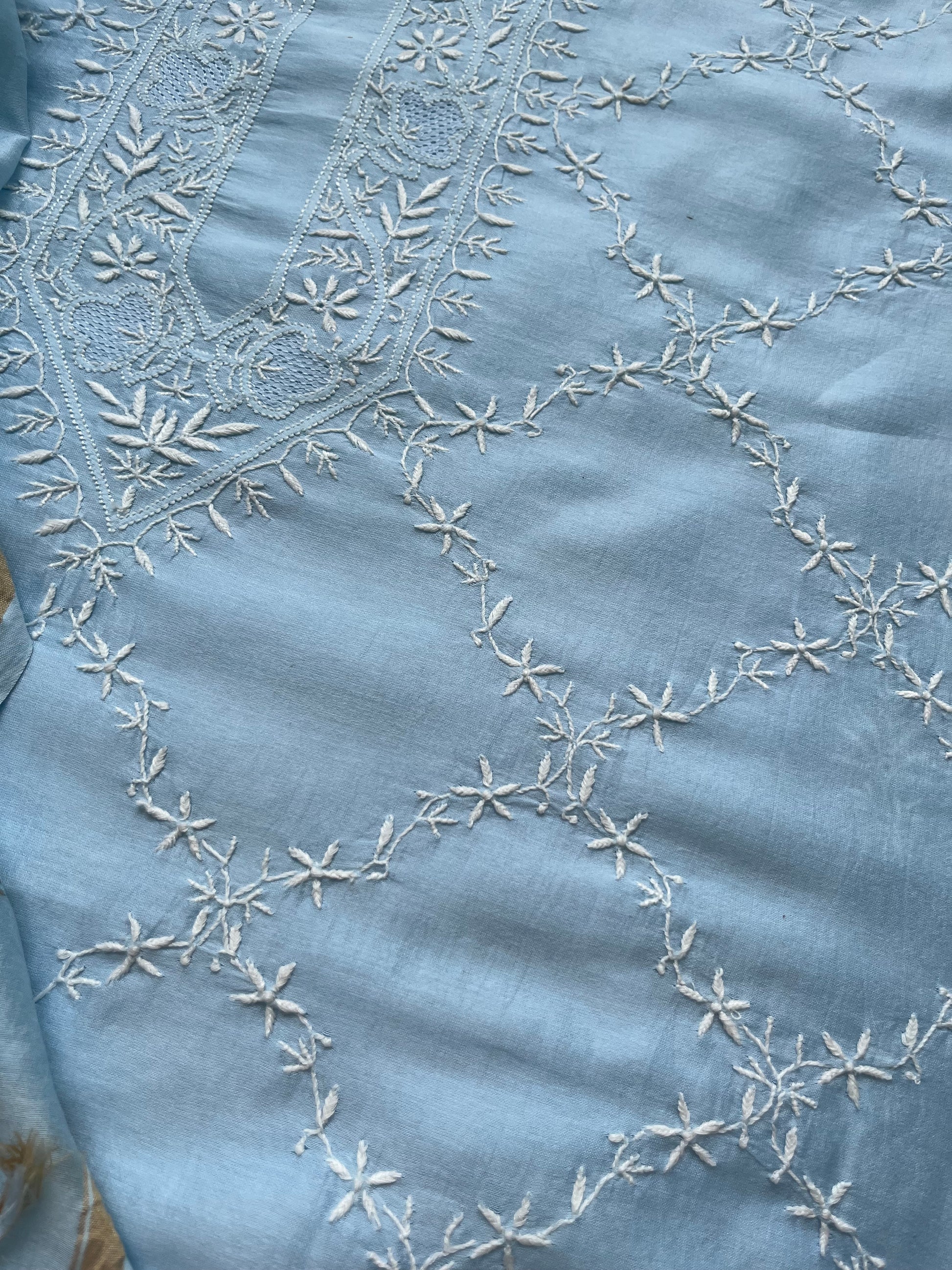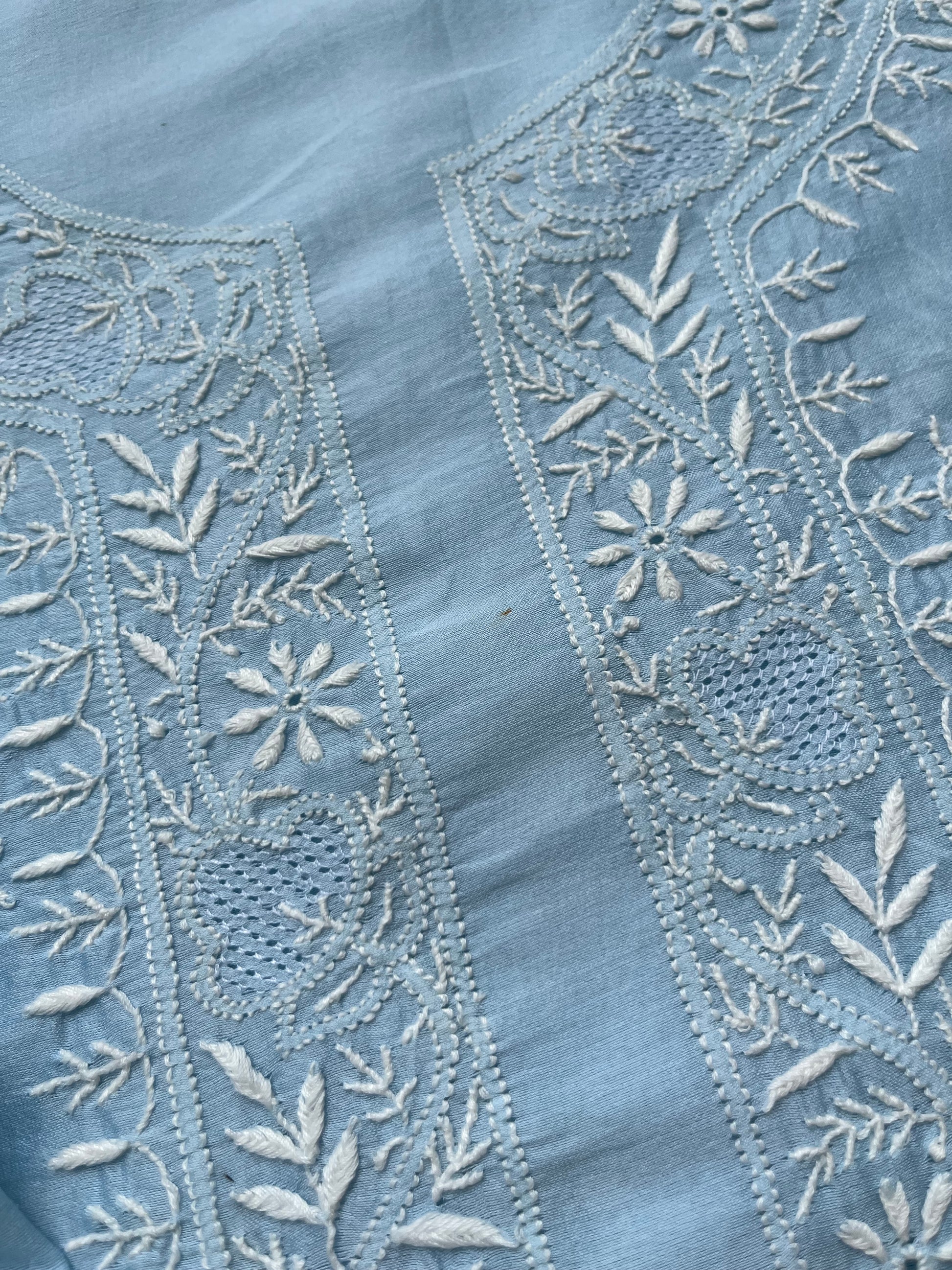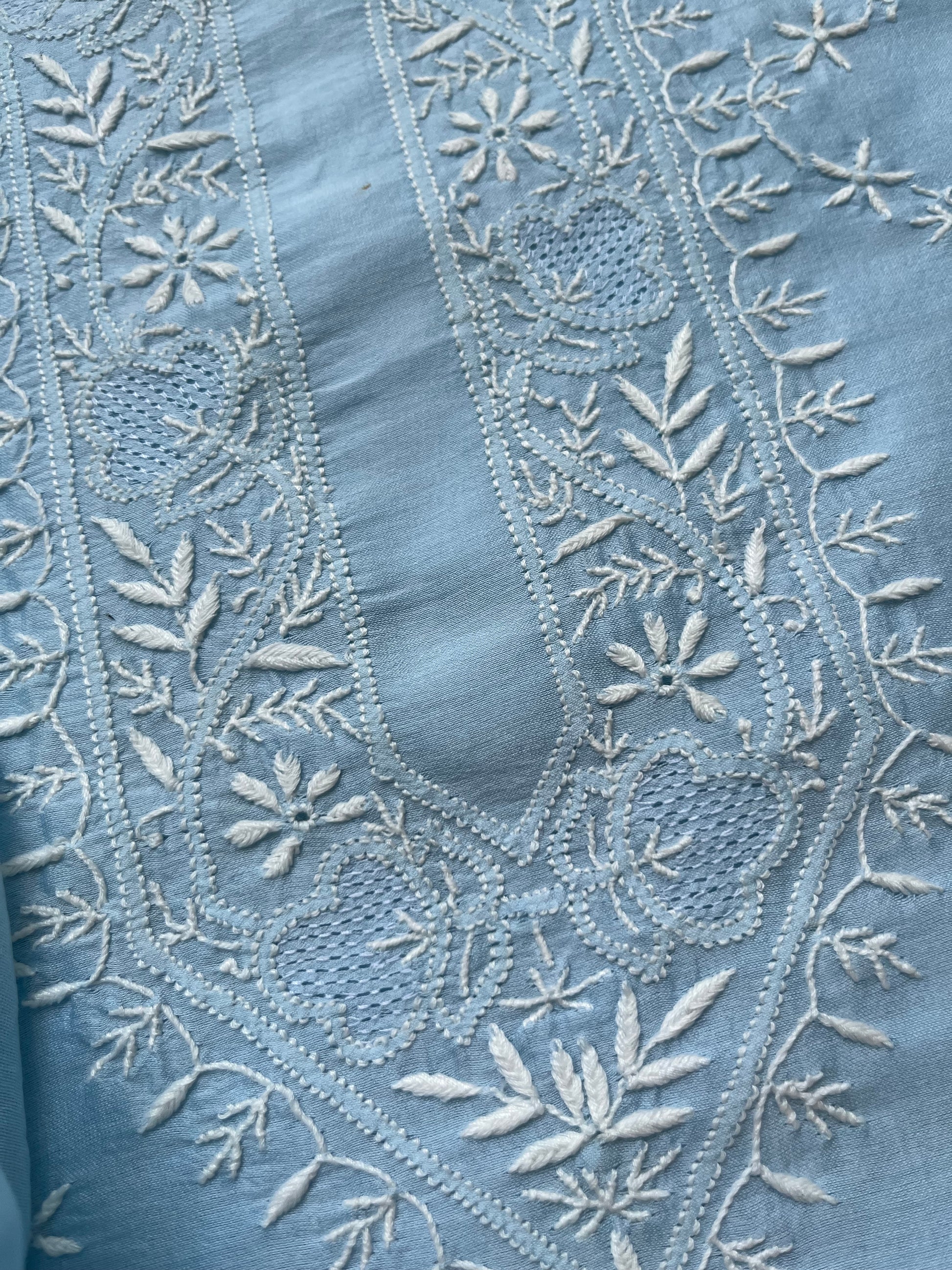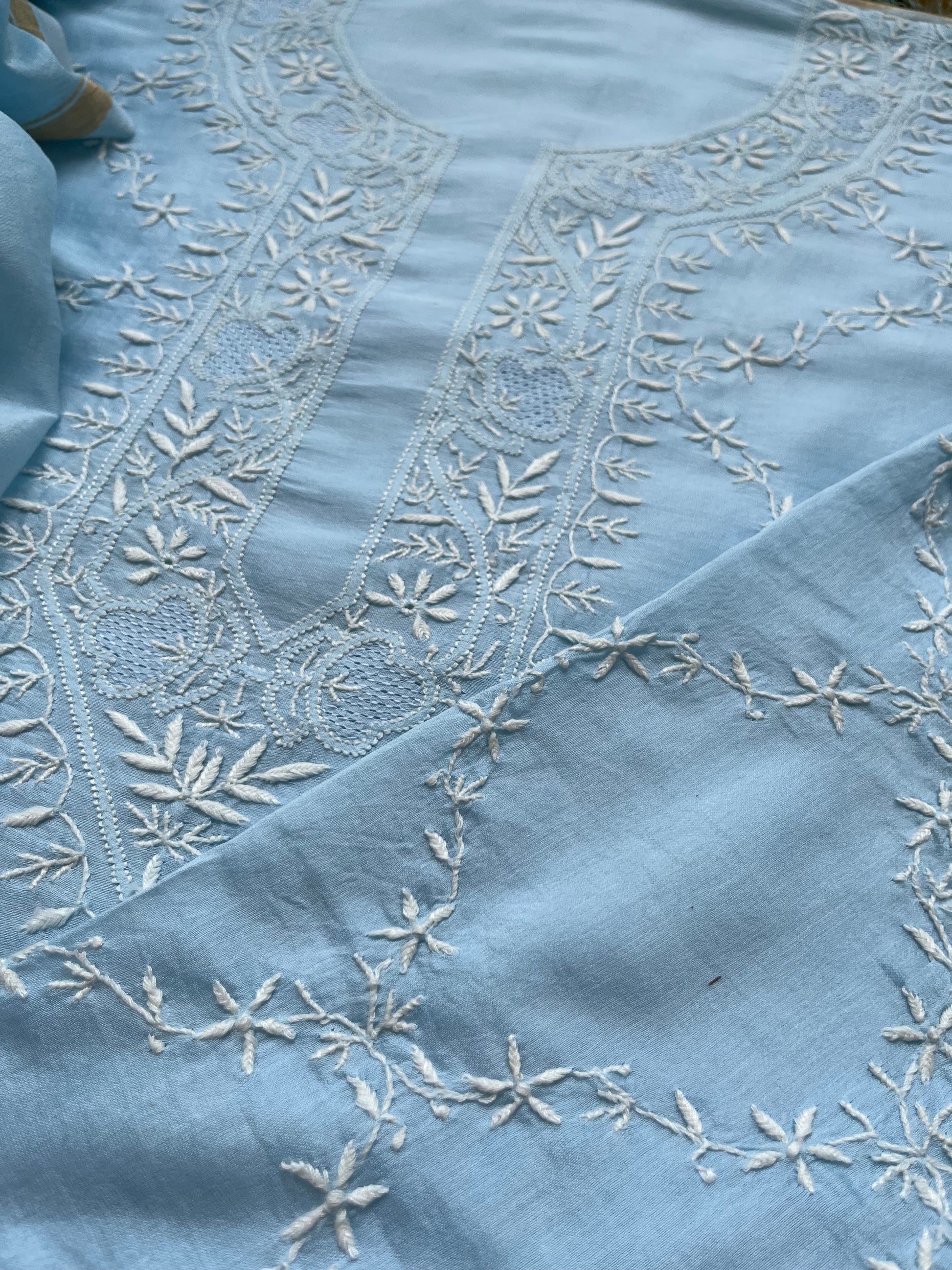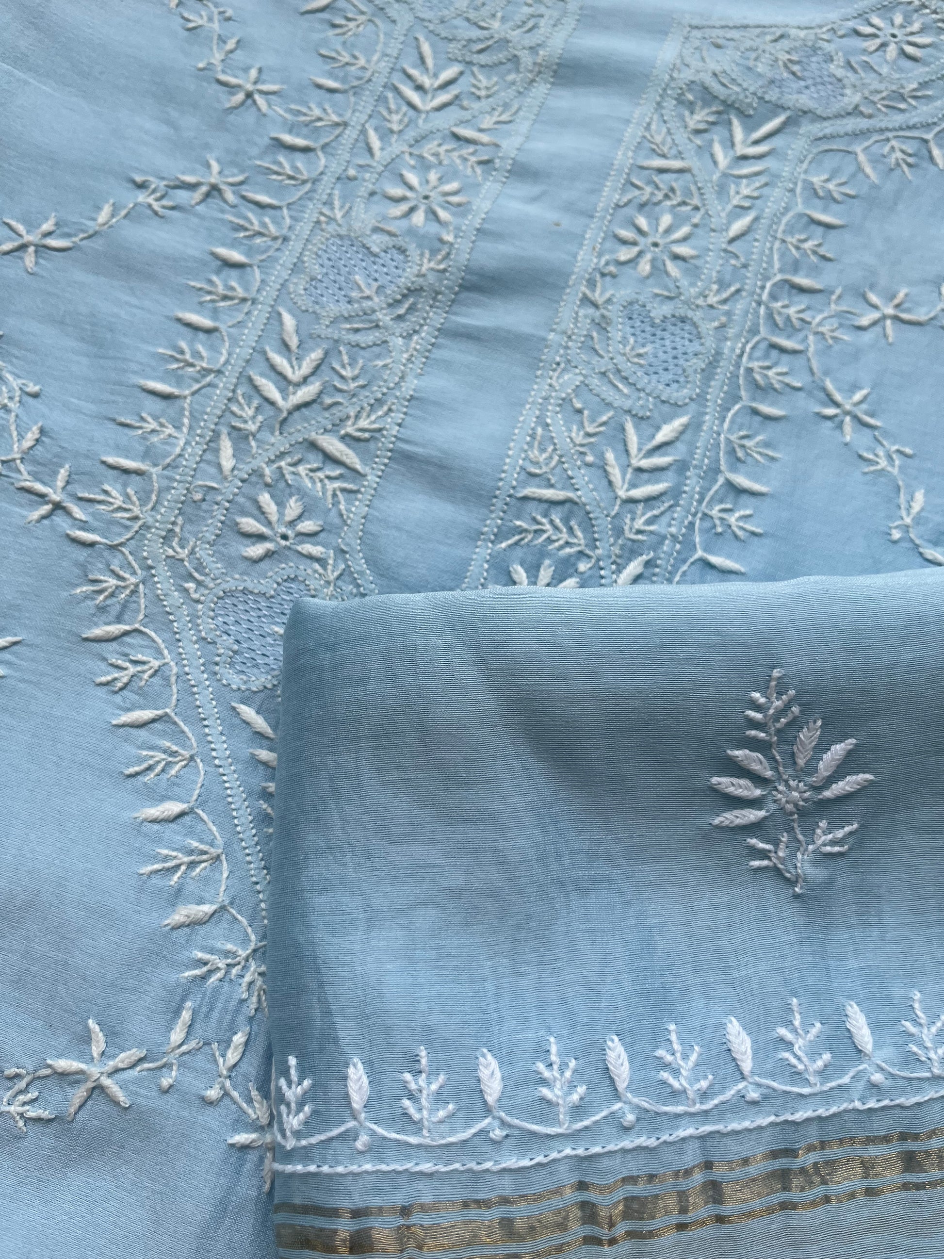 Chanderi chikankari kurta dupatta. Kurta has work all over front sleeves has hemline and boities .