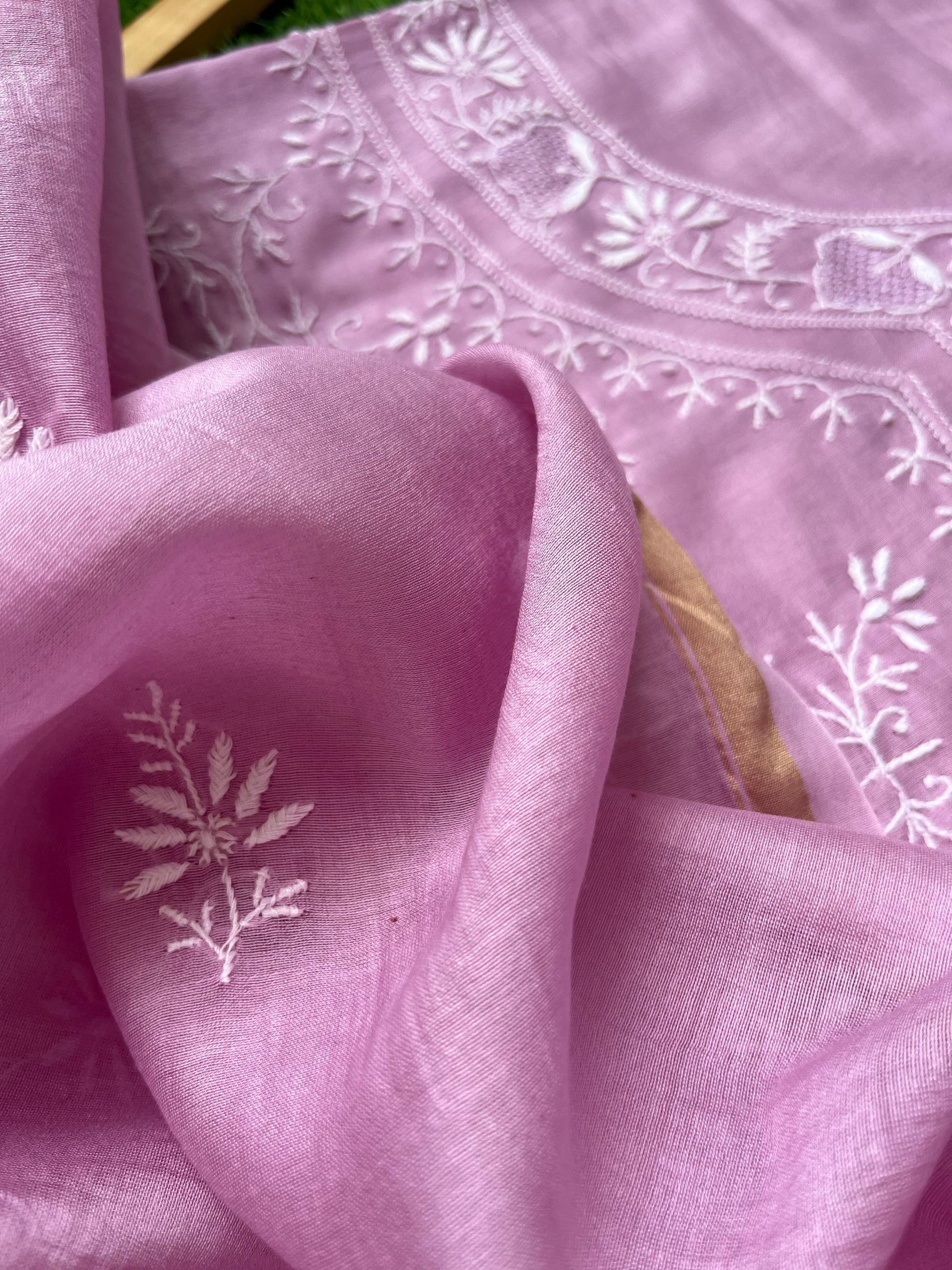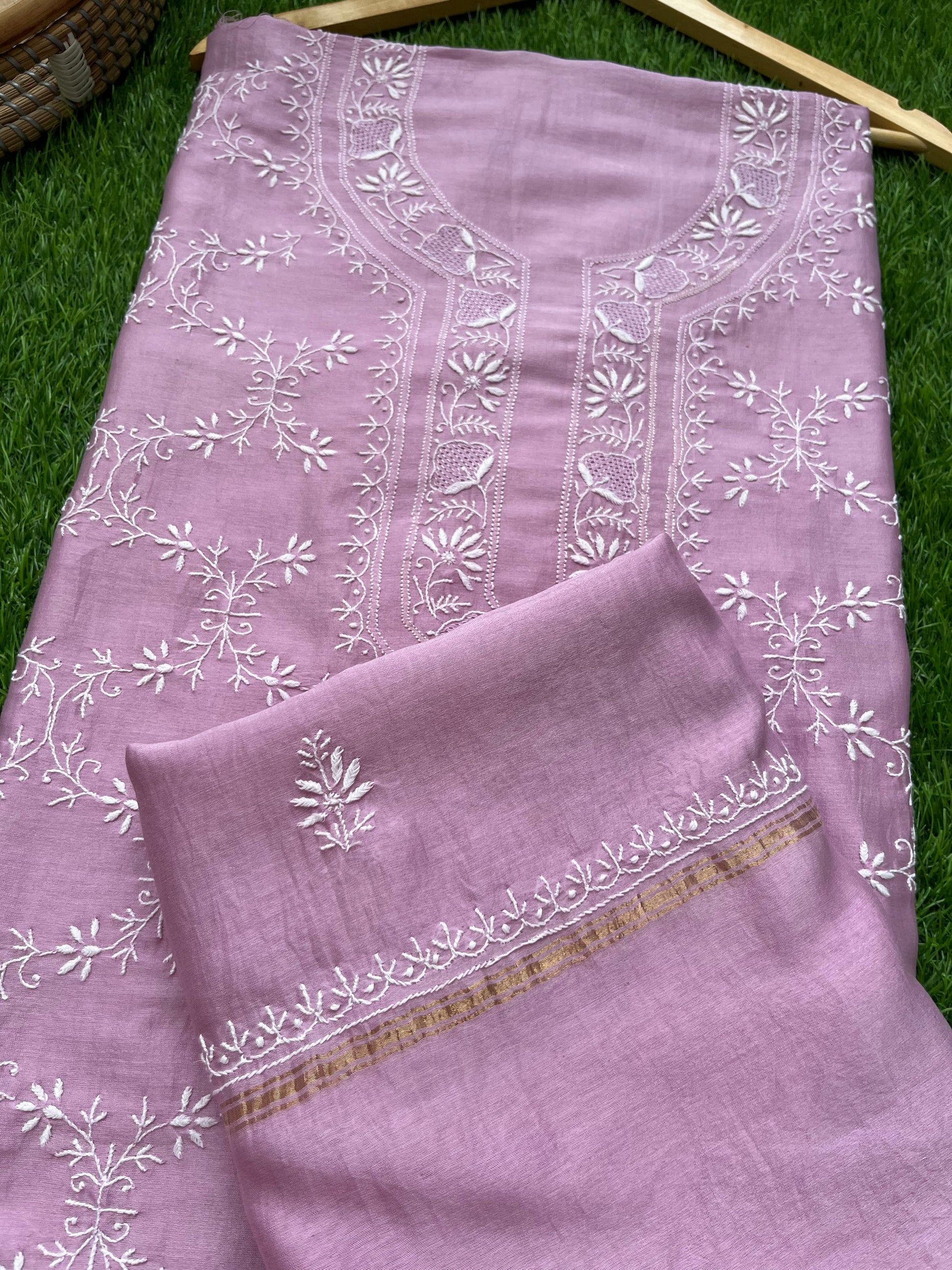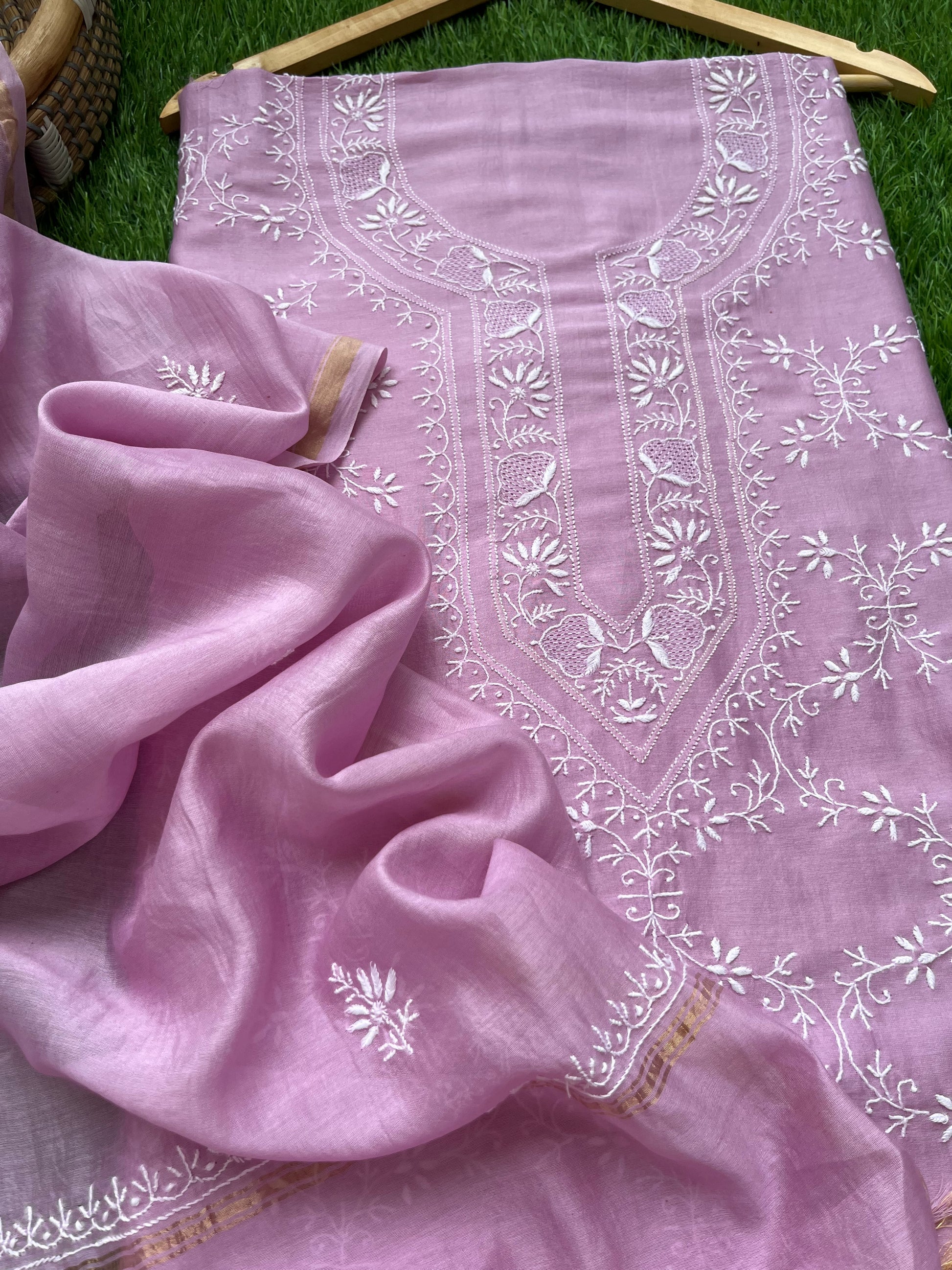 Chanderi chikankari kurta dupatta. Kurta has work all over front sleeves has hemline and boities .