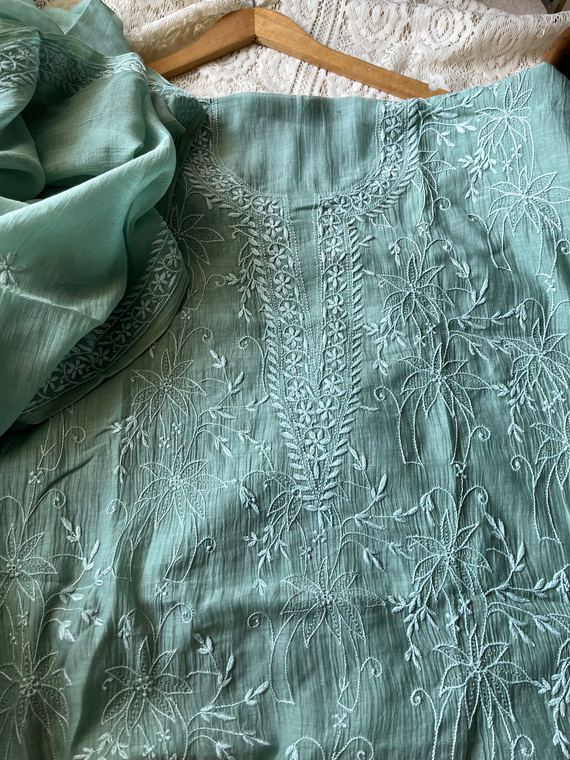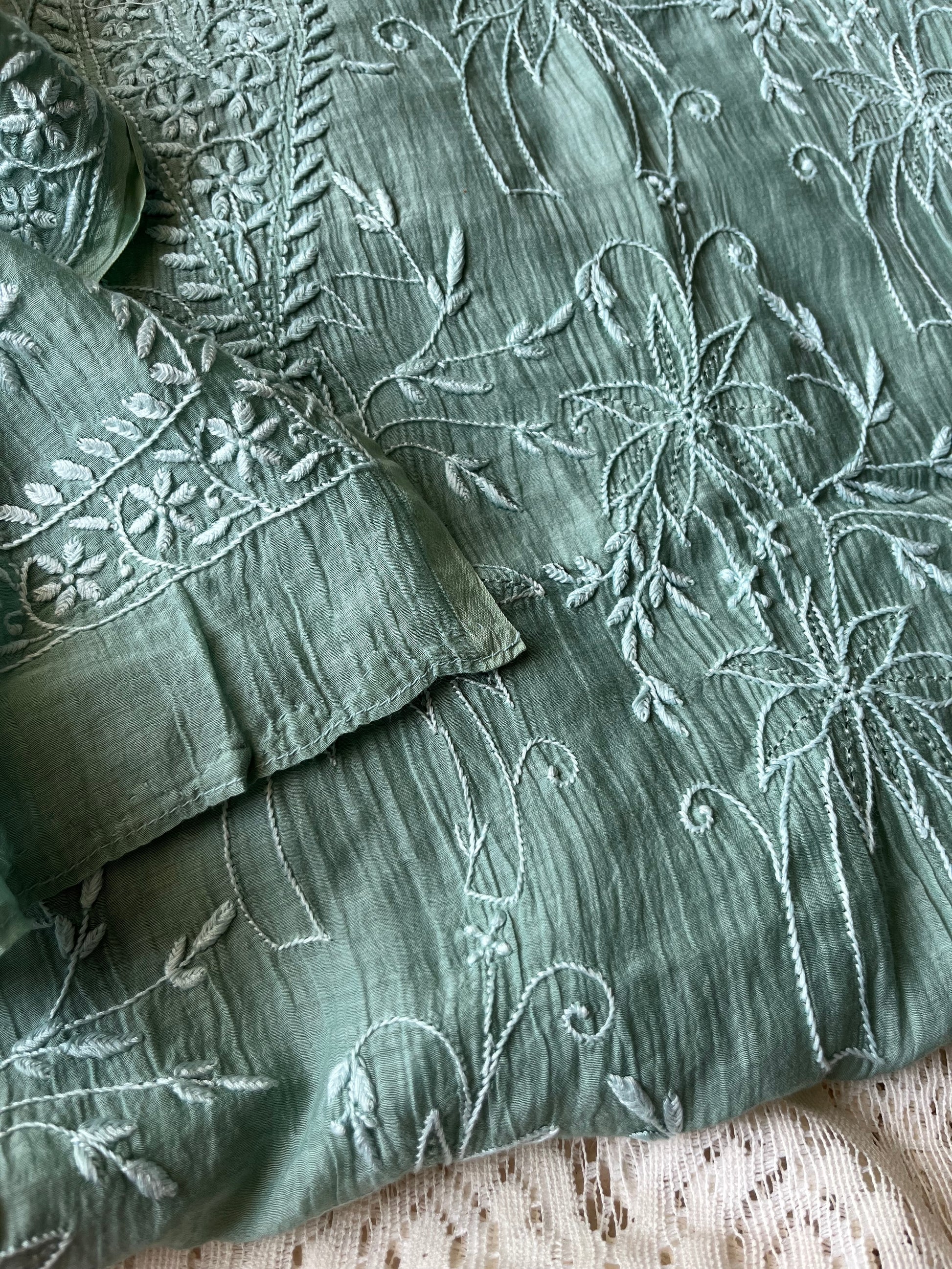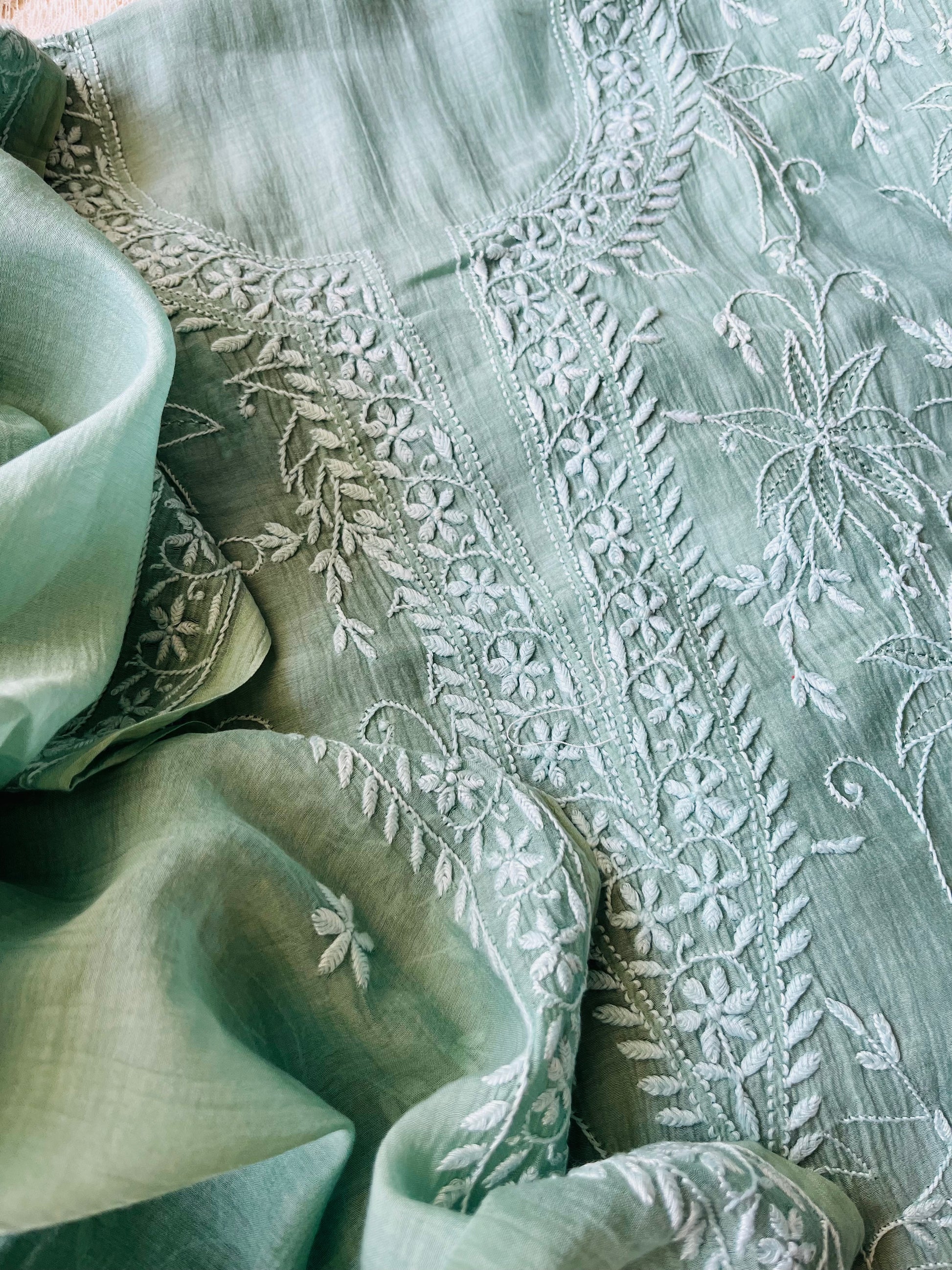 Light as a morning breeze, sheer yet soulful, the Chanderi base becomes a canvas for delicate Chikankari motifs, patiently hand-embroidered—each stitch holding time, tradition, and quiet devotion.