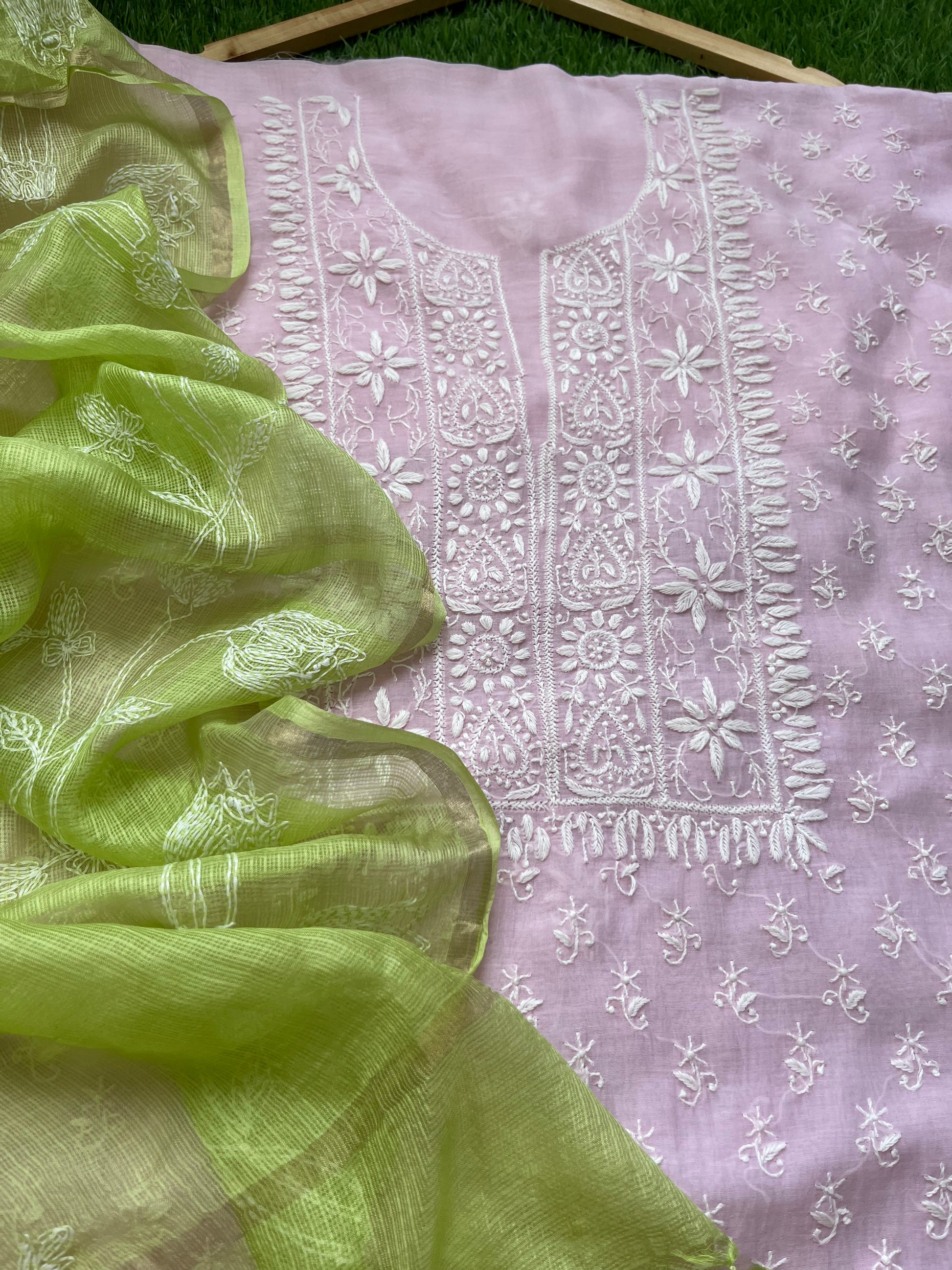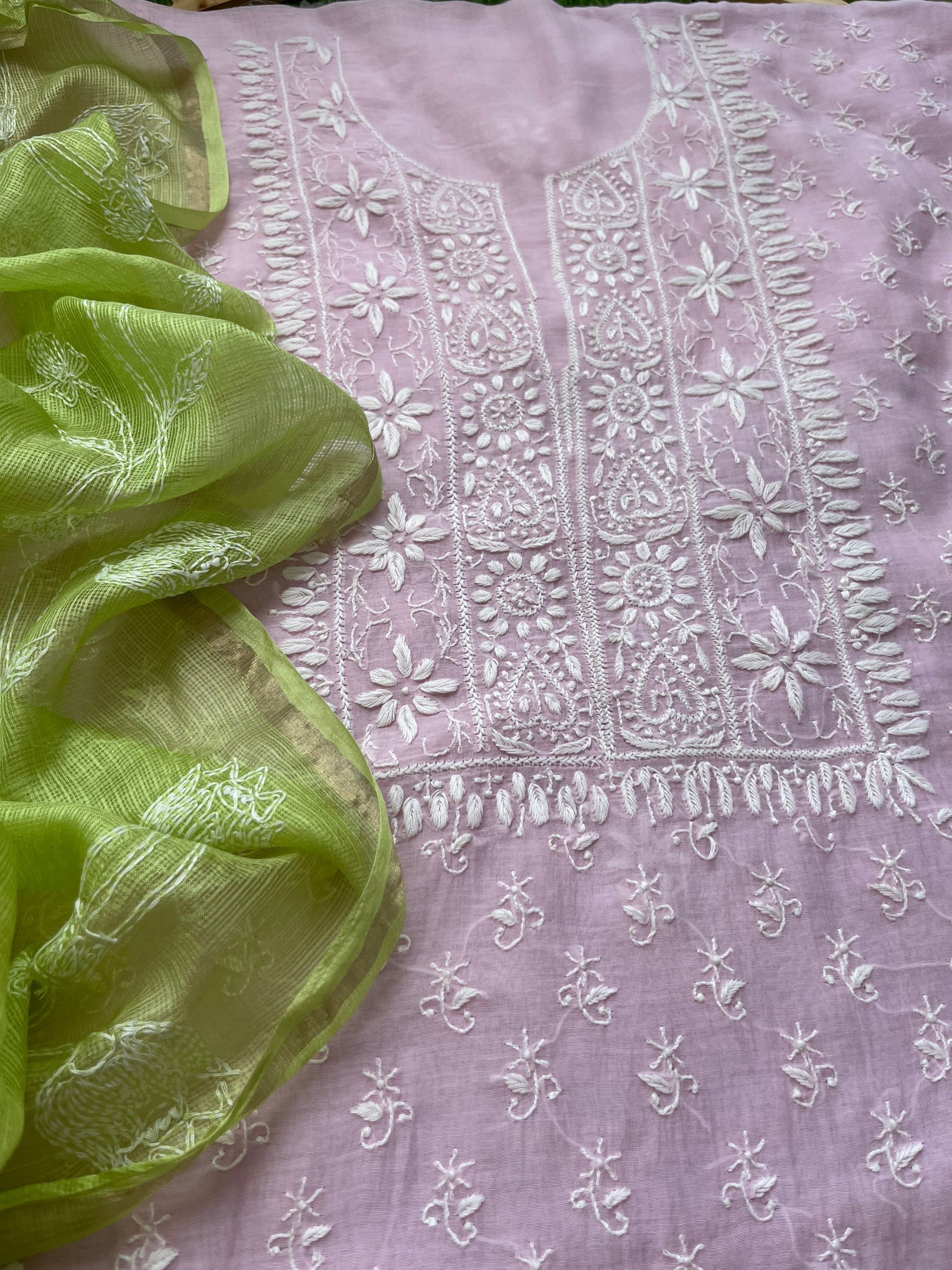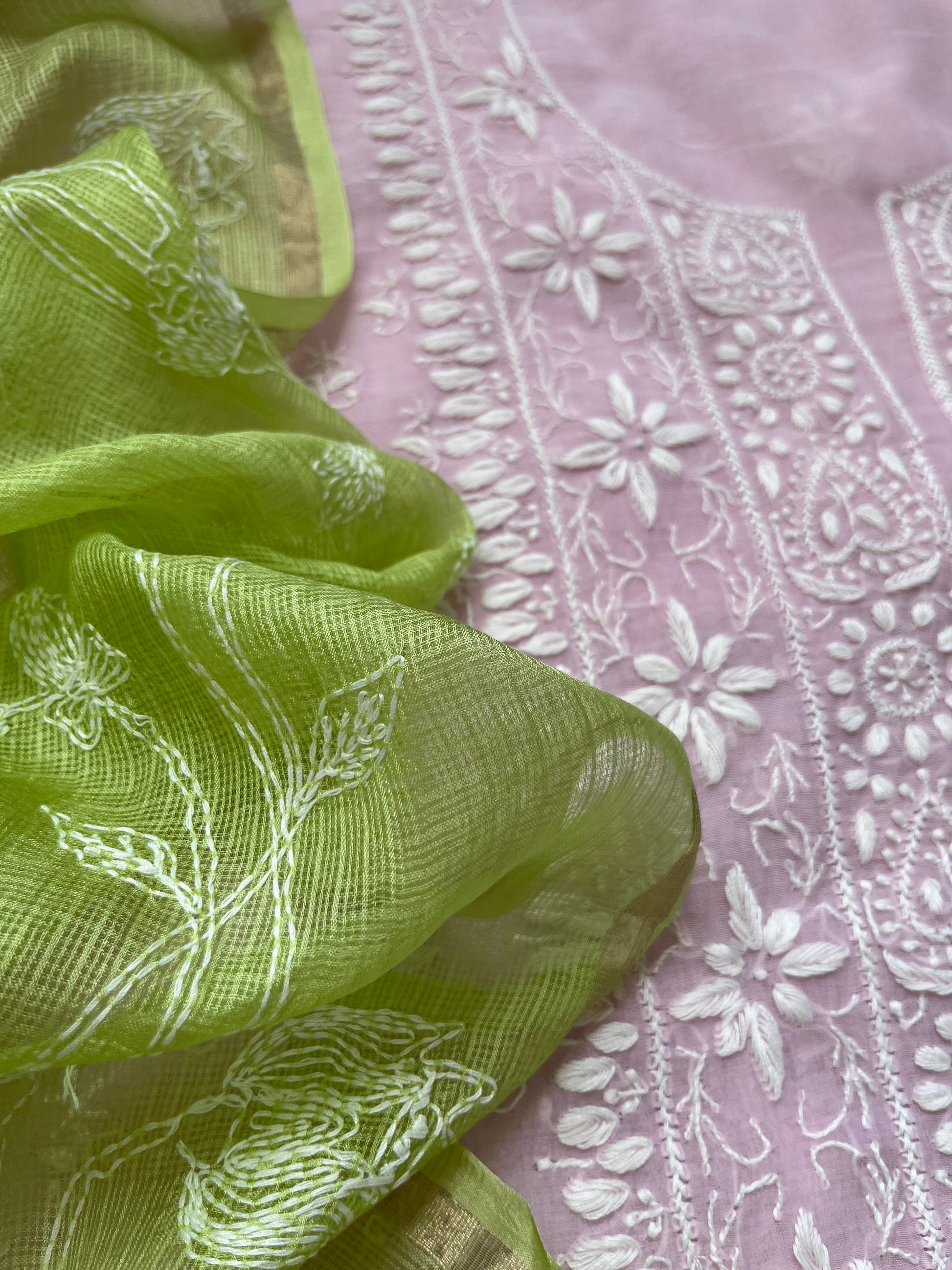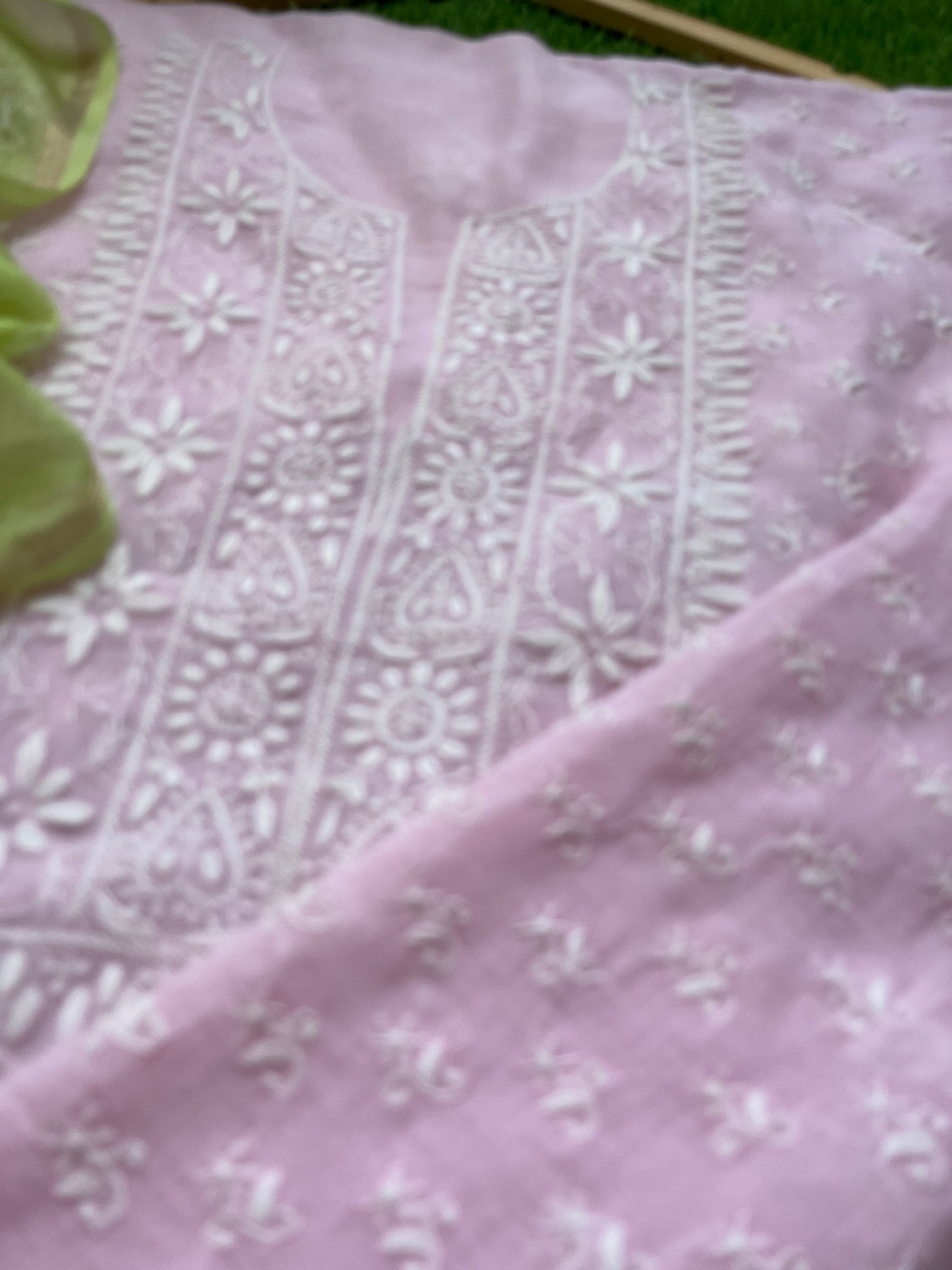 Chanderi chikankari kurta. Kurta has worl all over front sleeves has hemline and boities .with a kota silk tepchi work dupatta