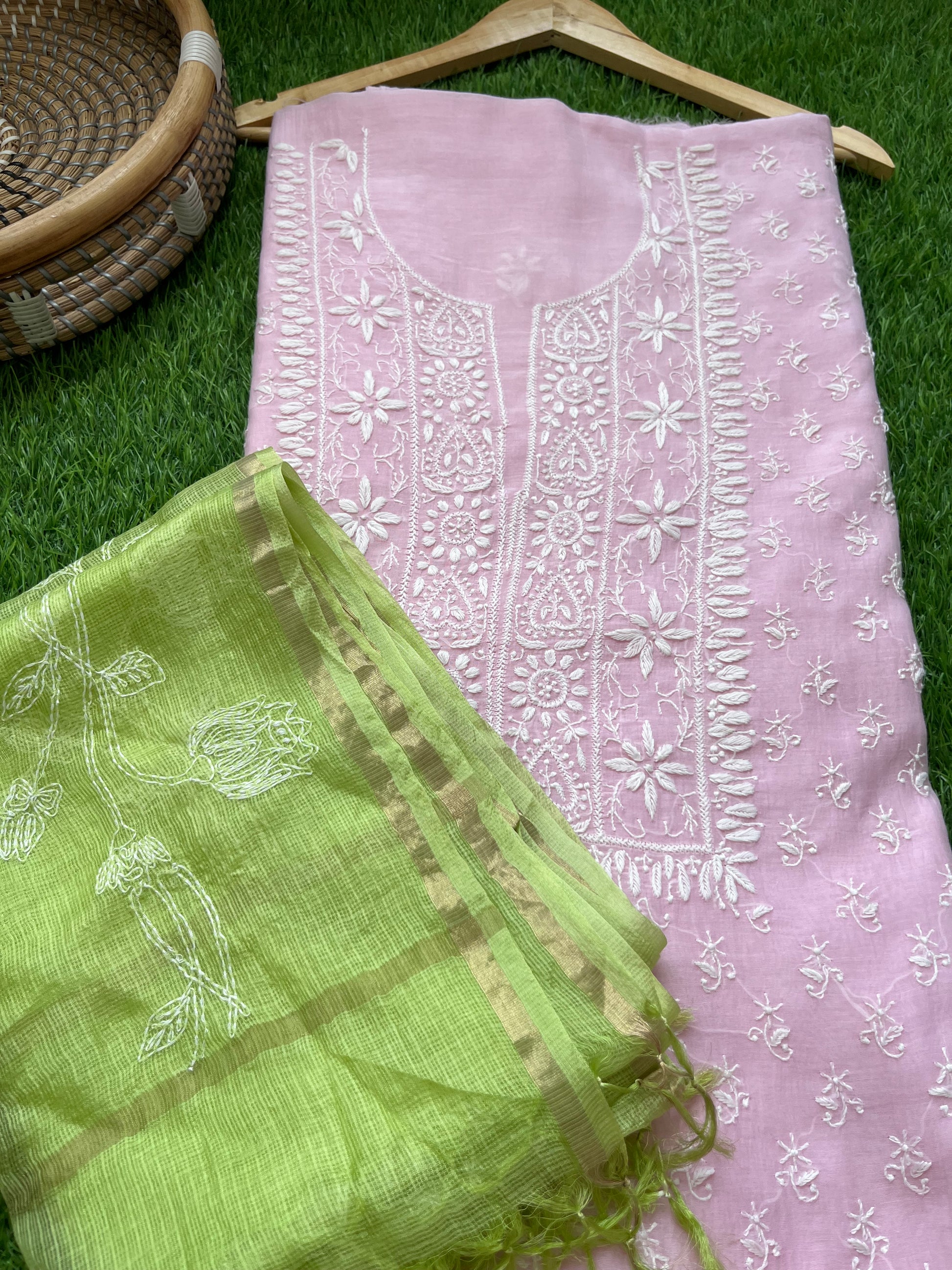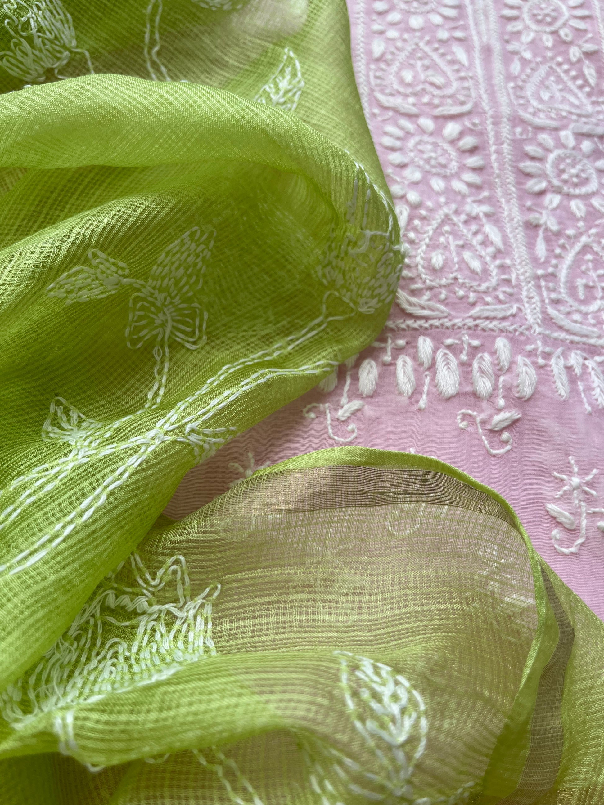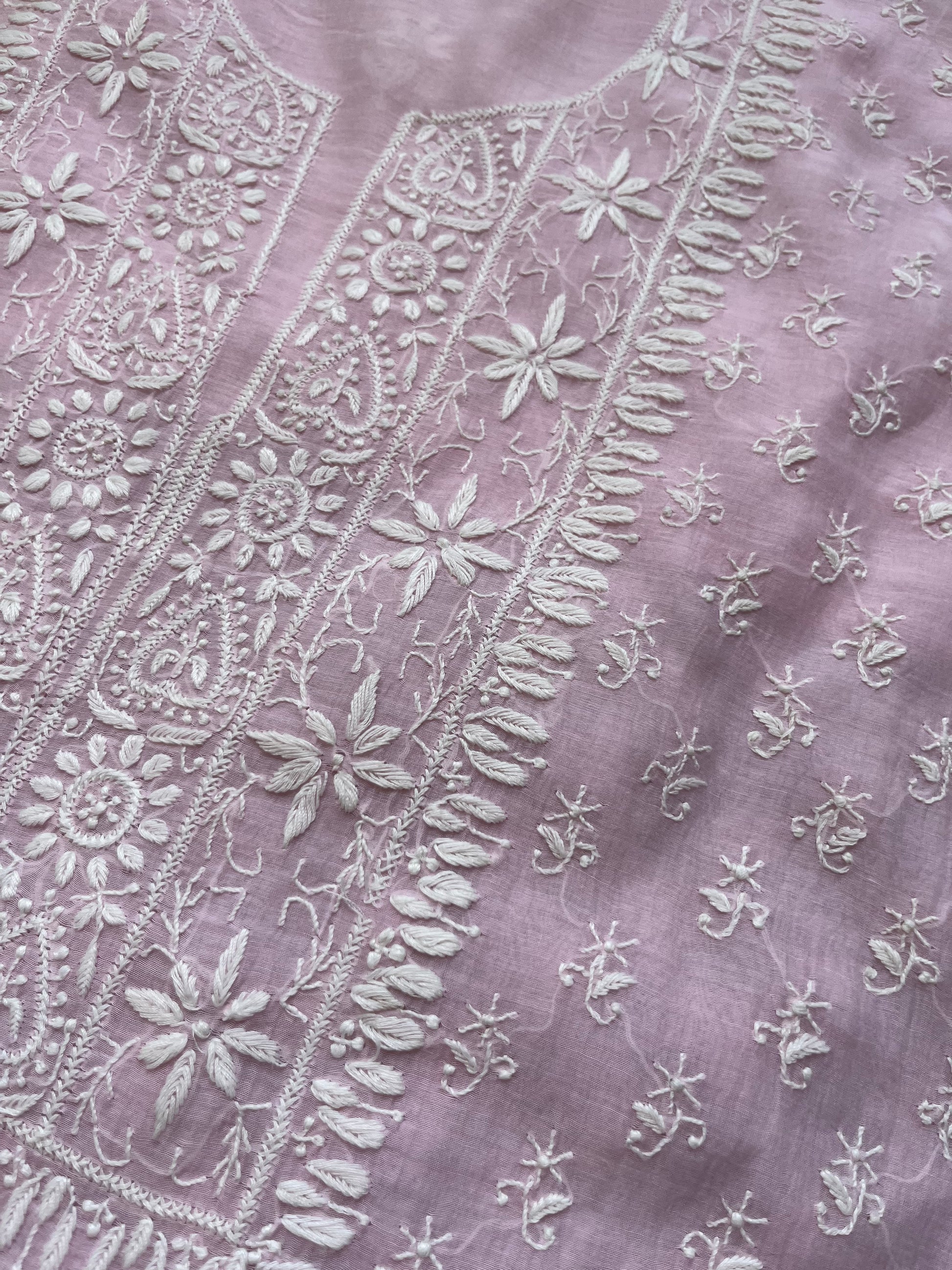 Chanderi chikankari kurta. Kurta has worl all over front sleeves has hemline and boities .with a kota silk tepchi work dupatta