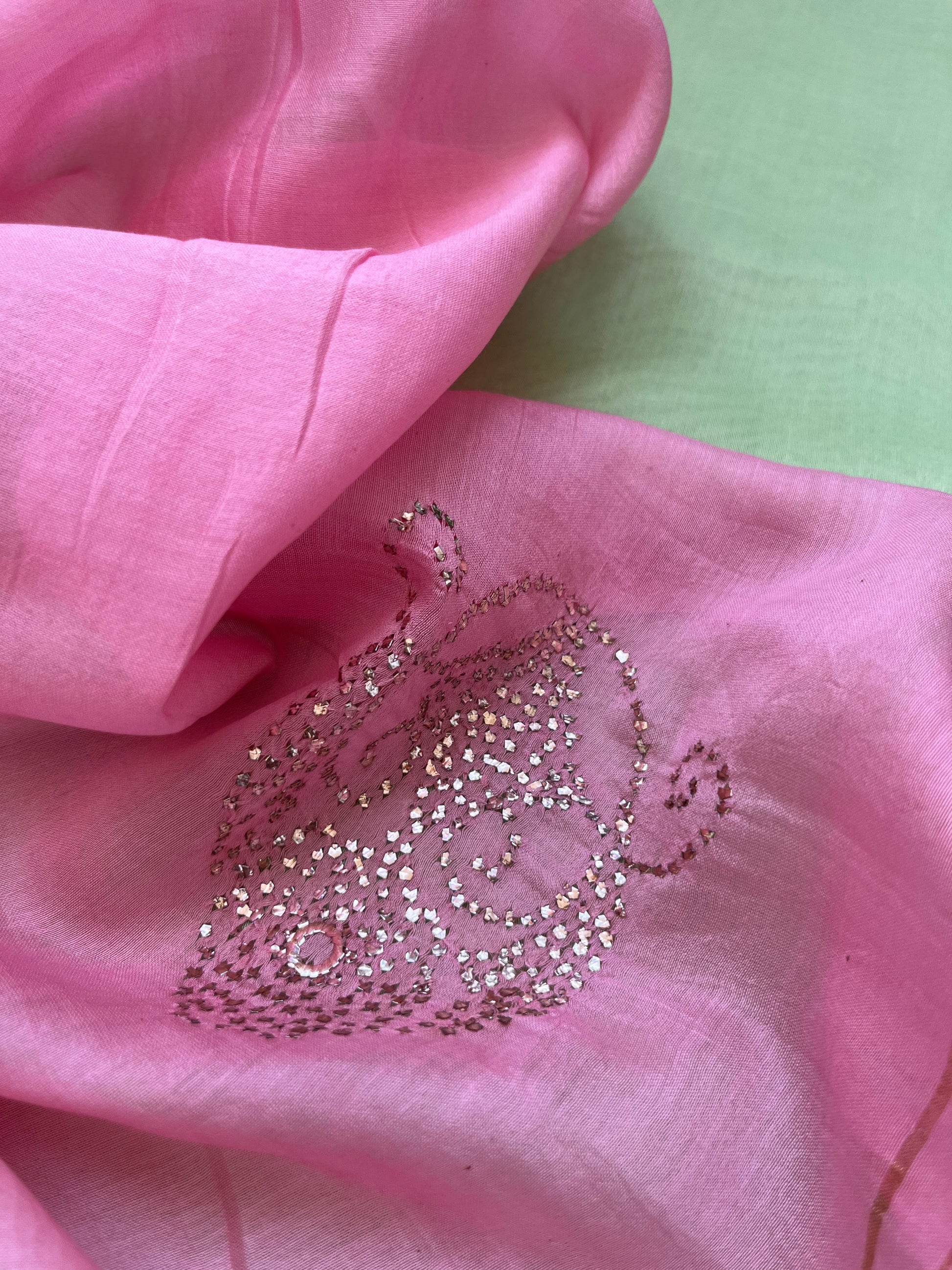 Mukaish, also known as badla work, is a traditional Lucknowi technique where tiny pieces of metal are carefully inserted and twisted into the fabric by hand. Each dot catches the light like a little star — creating that subtle shimmer we all love.