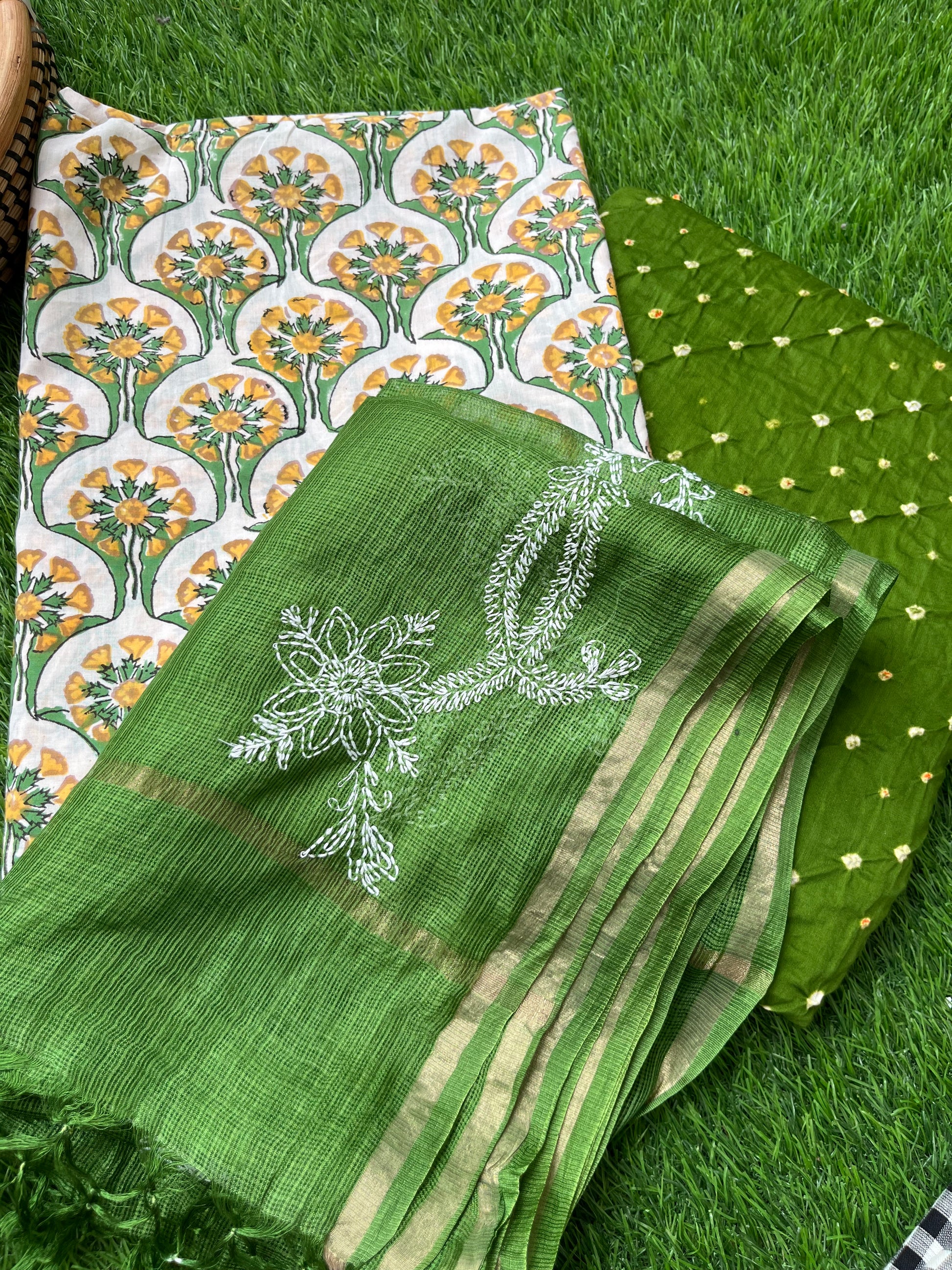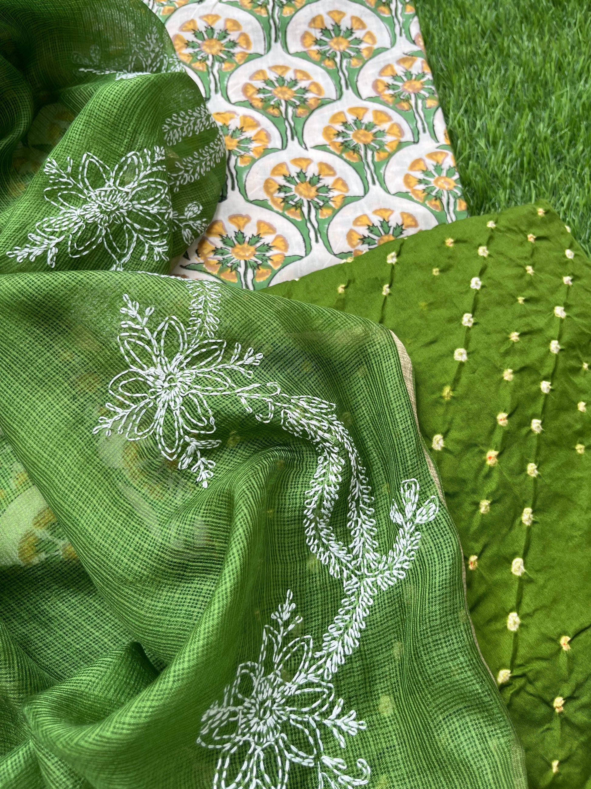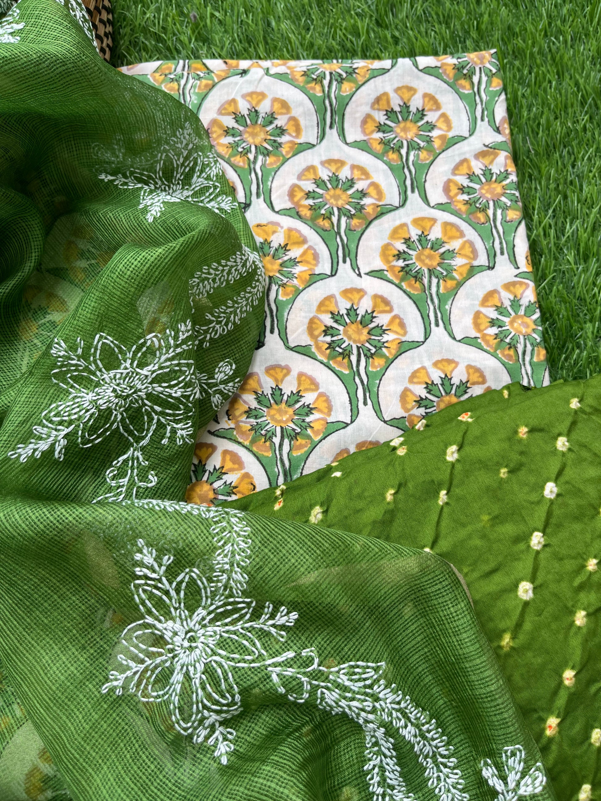 Chikankari kota silk Dupatta and block print kurta bandhani bottom Fabric