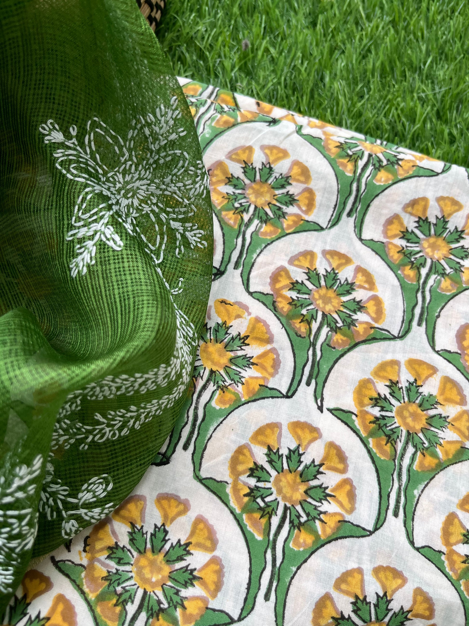 Cotton block print kurta bandhanj bottom fabric is paired with a kota silk chikankari Dupatta