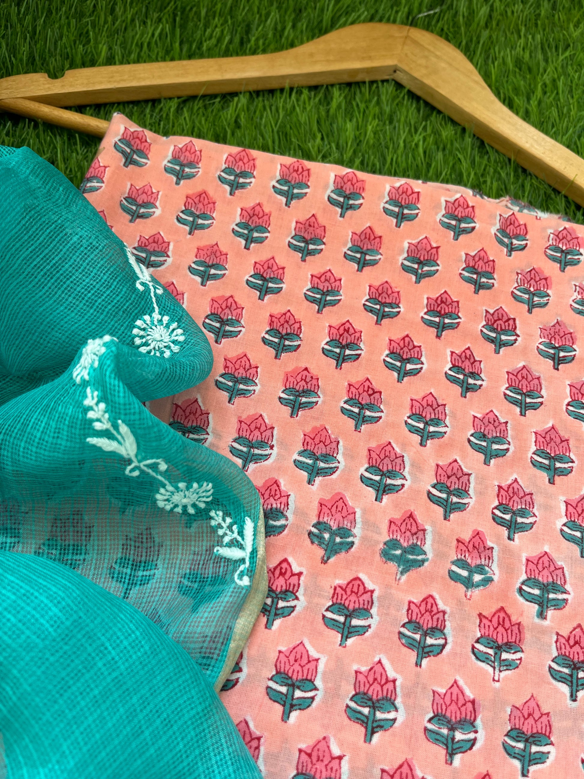 Cotton block print kurta fabric is paired with a kota silk chikankari Dupatta