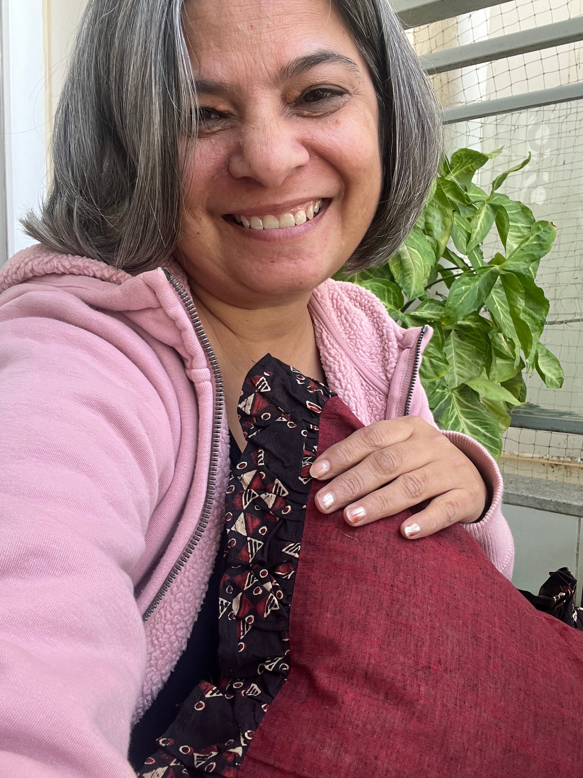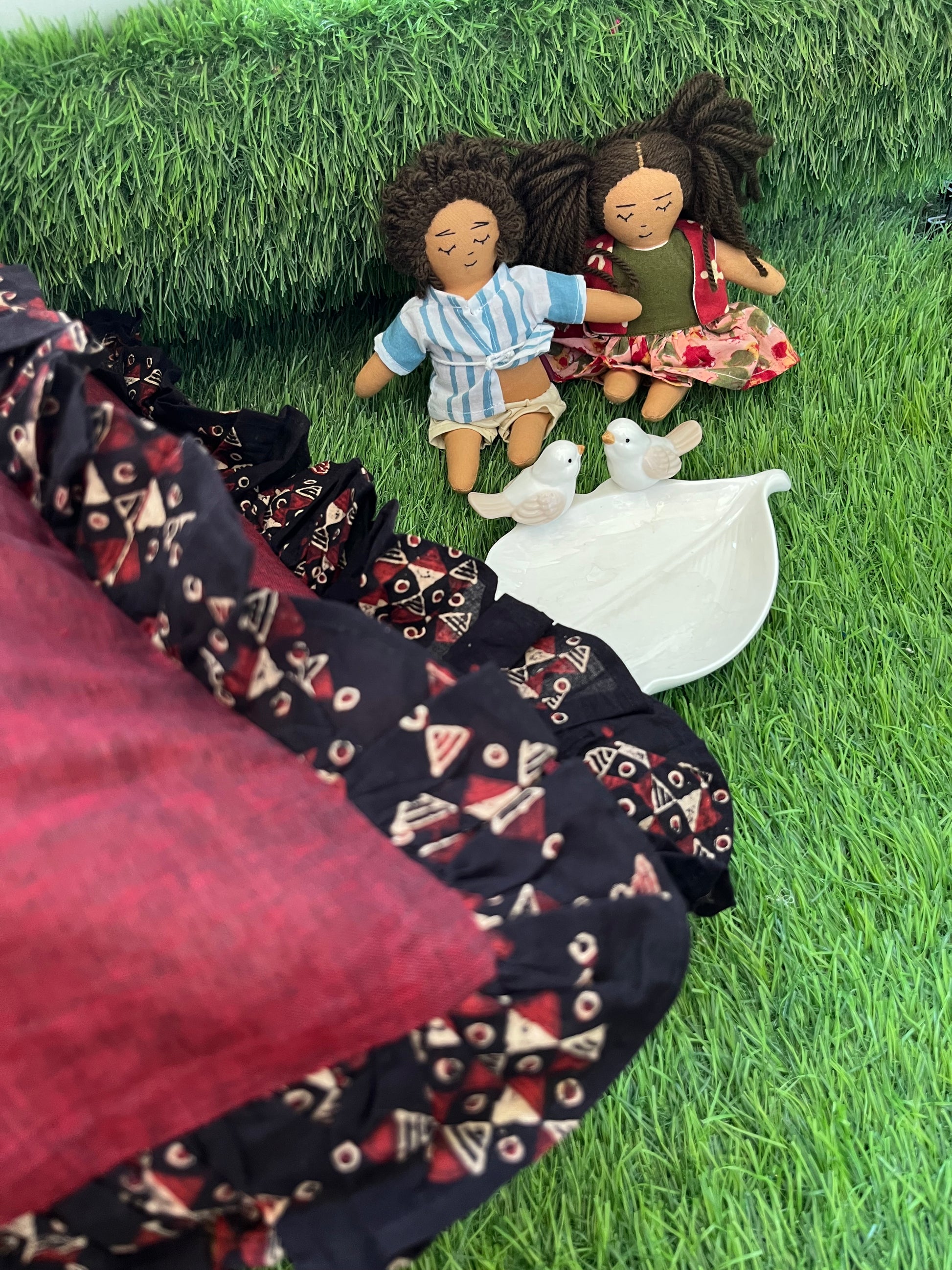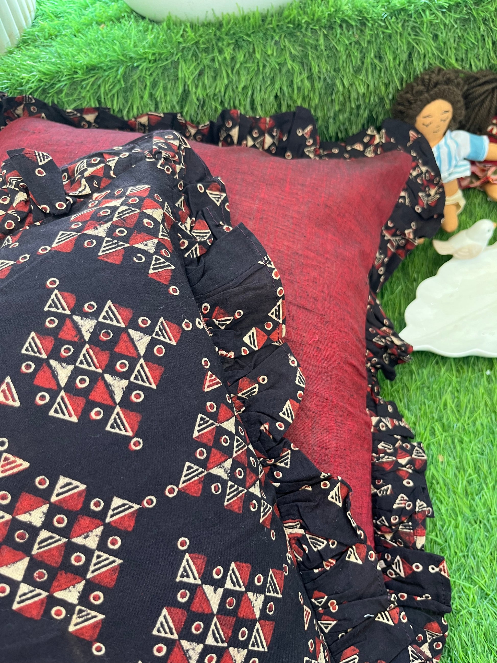set of 3 cushion covers 2 plain with ajrkh print frills and one ajrakh print cushion cover