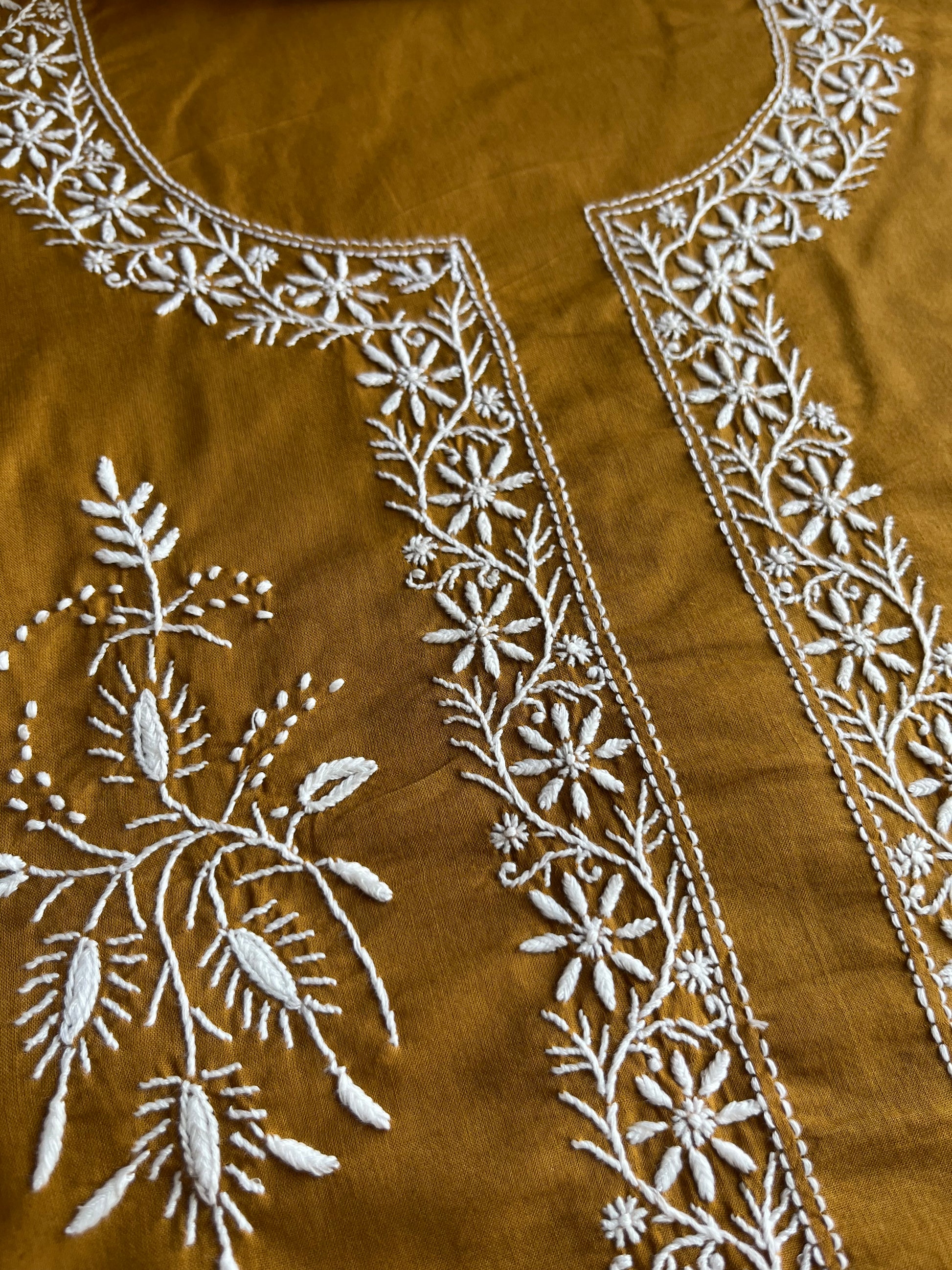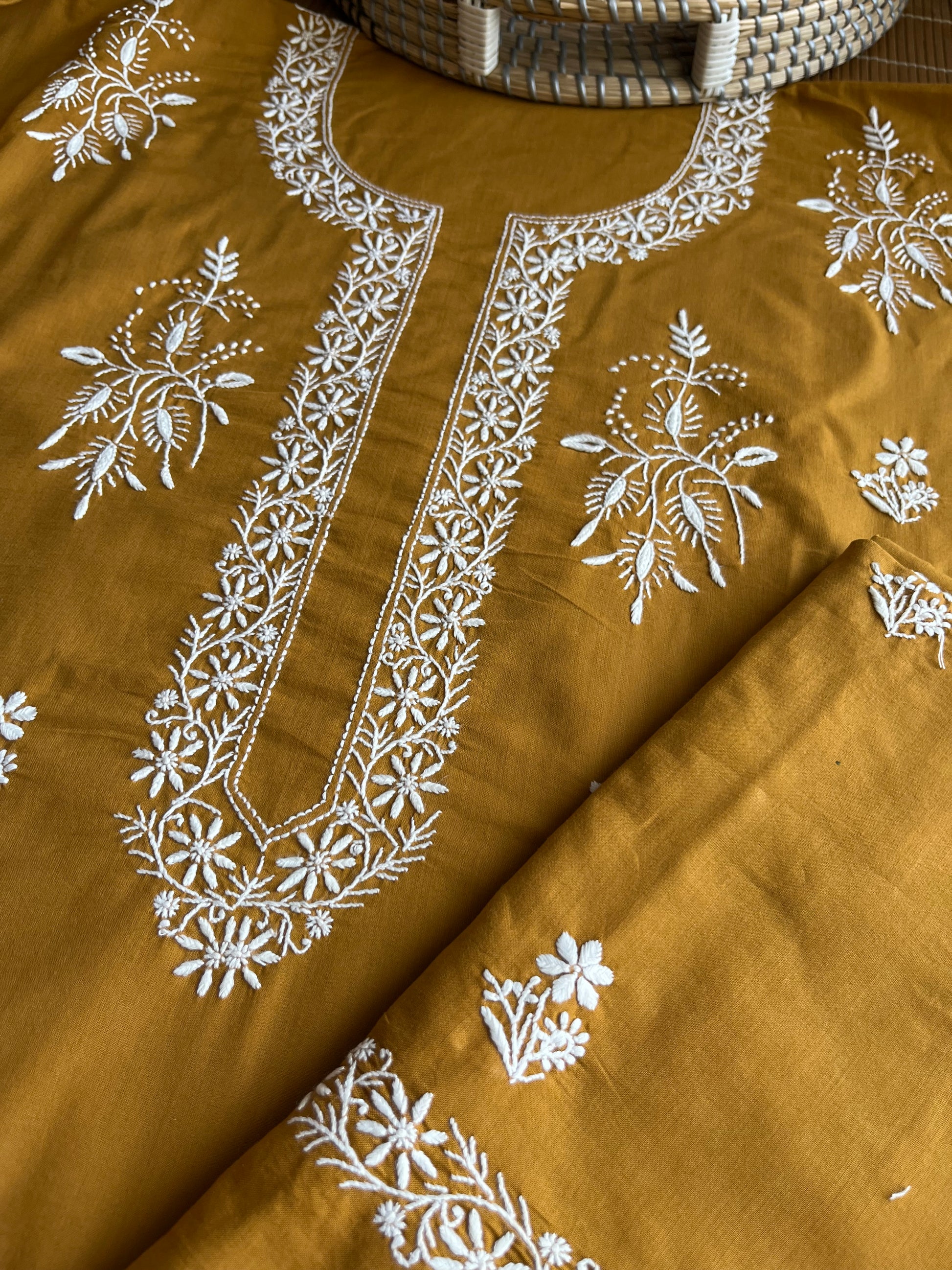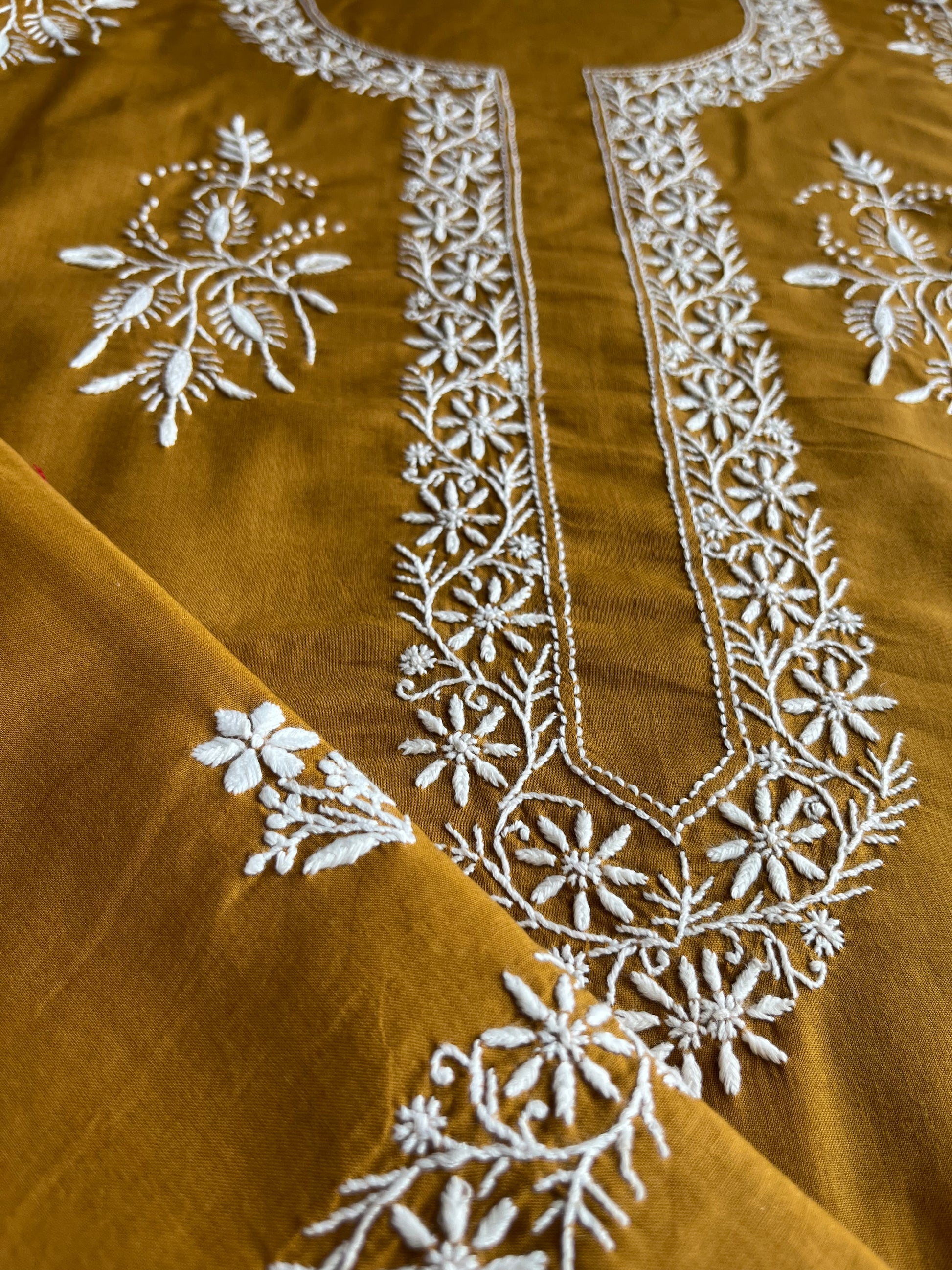 kurta has a delicate neckline with motifs all over front … there is work on sleeves and big motif at back