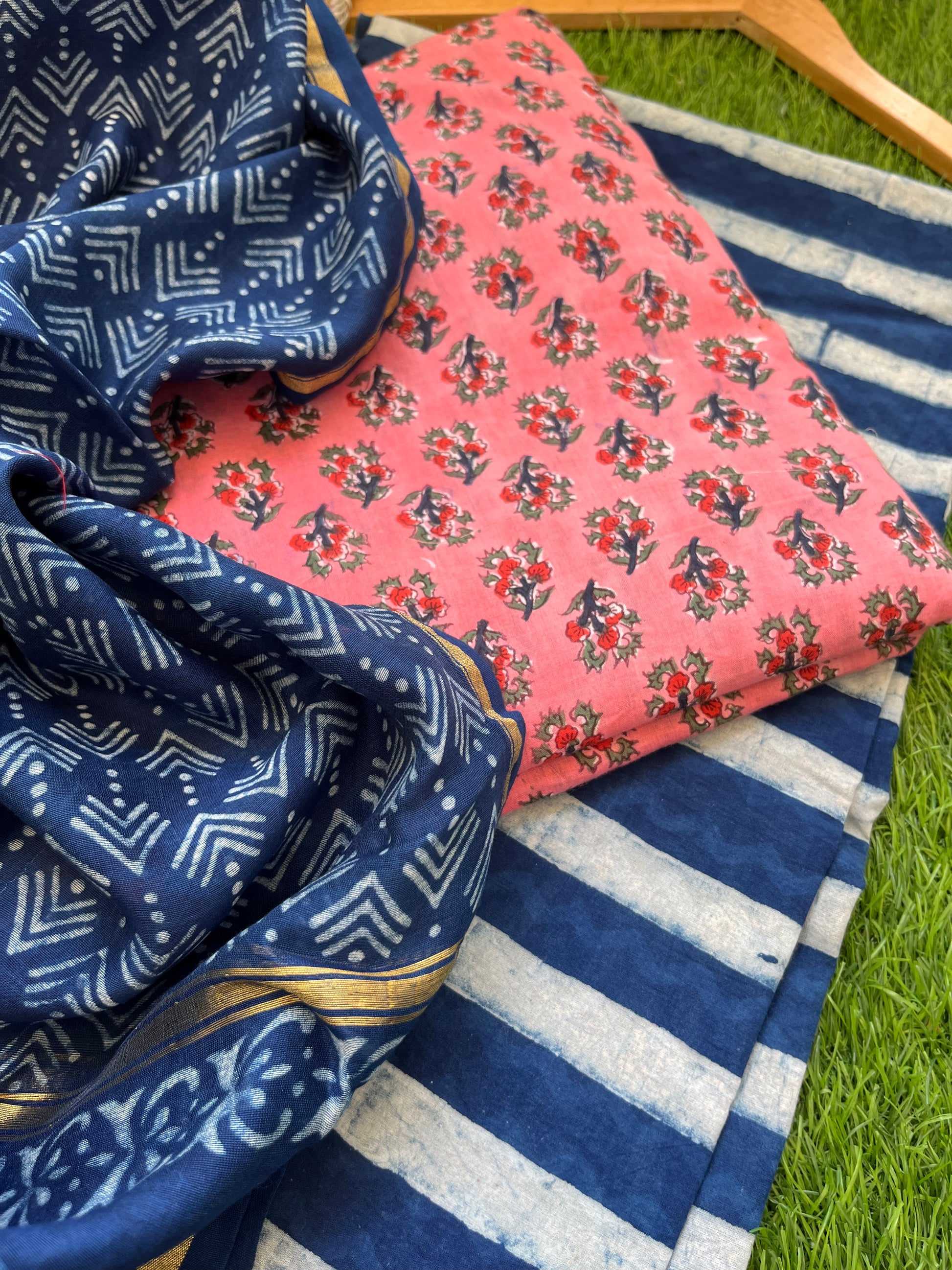 “Cotton block print kurta plain bottom fabric with a chanderi  block print dupatta