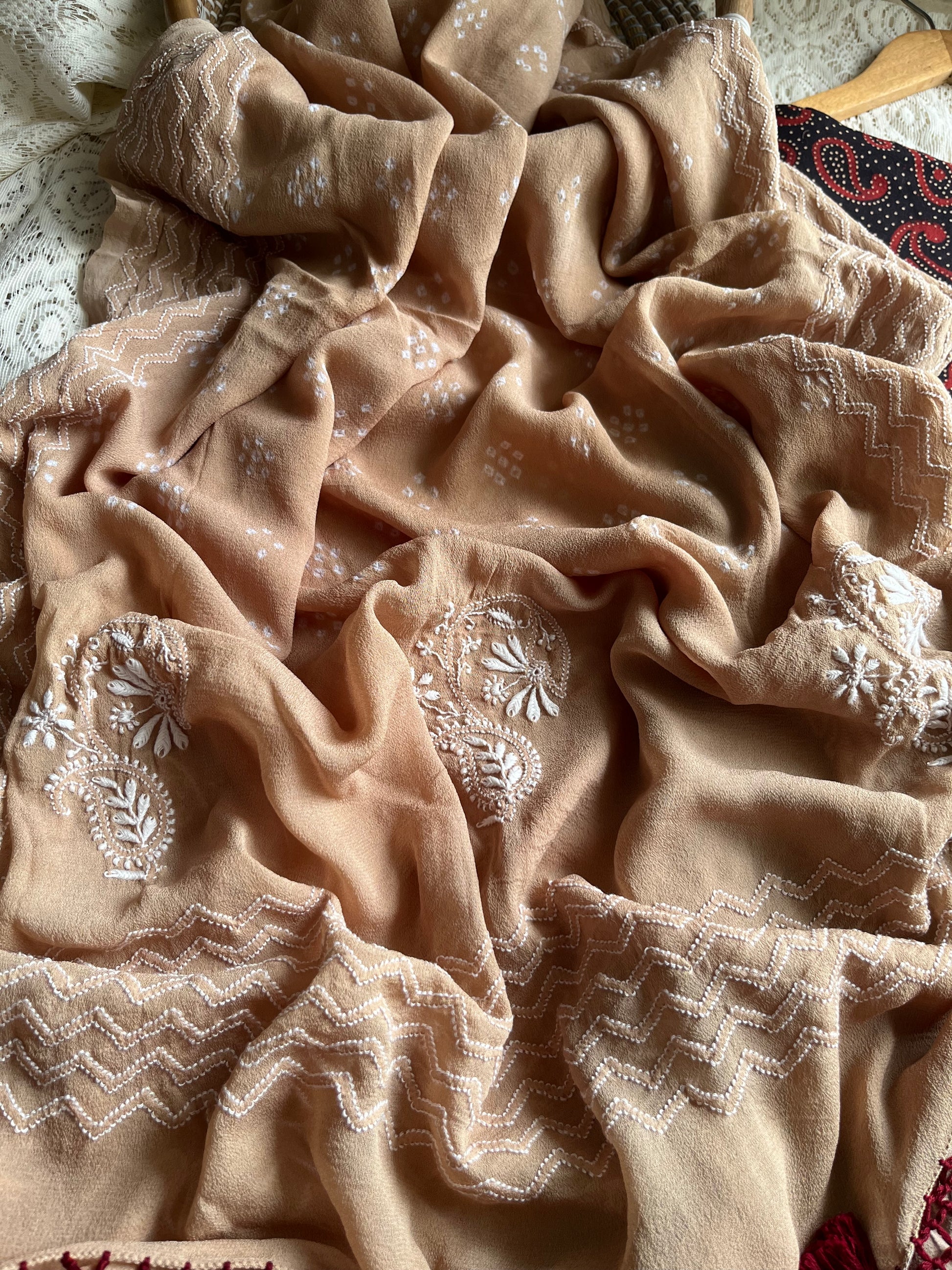 “Cotton ajrakh kurta bottom fabric pure georgette bandhani chikankari dupatta