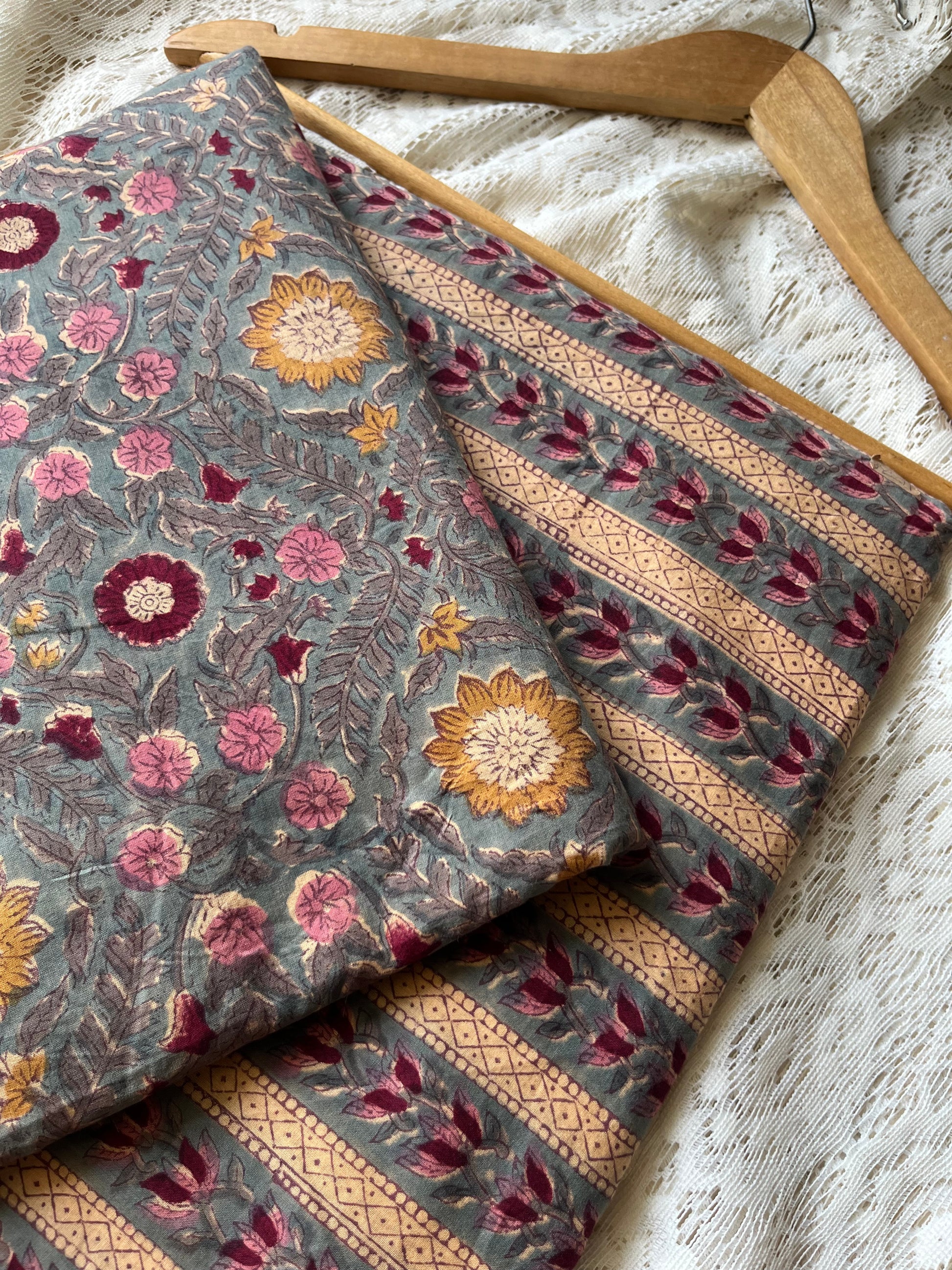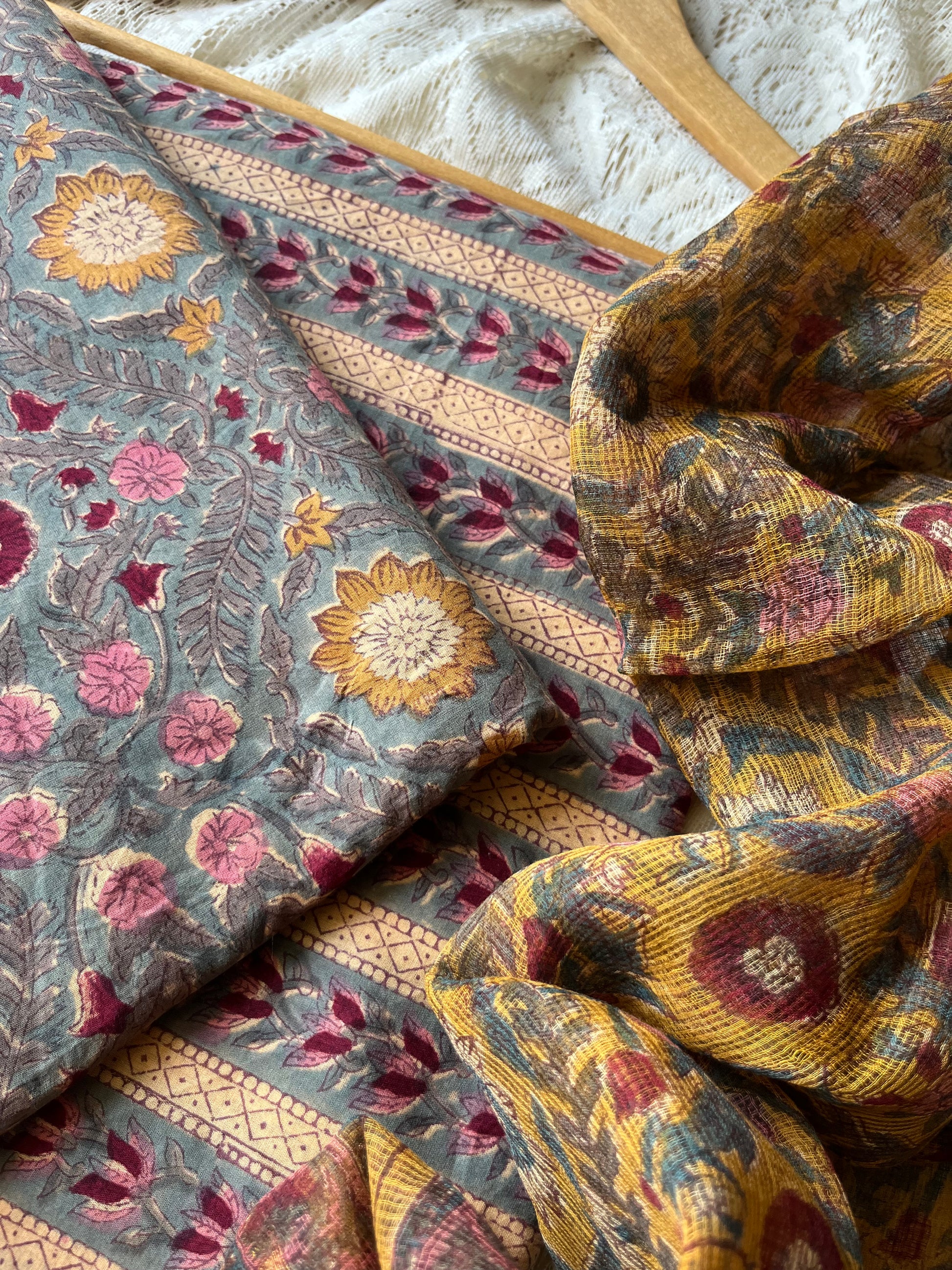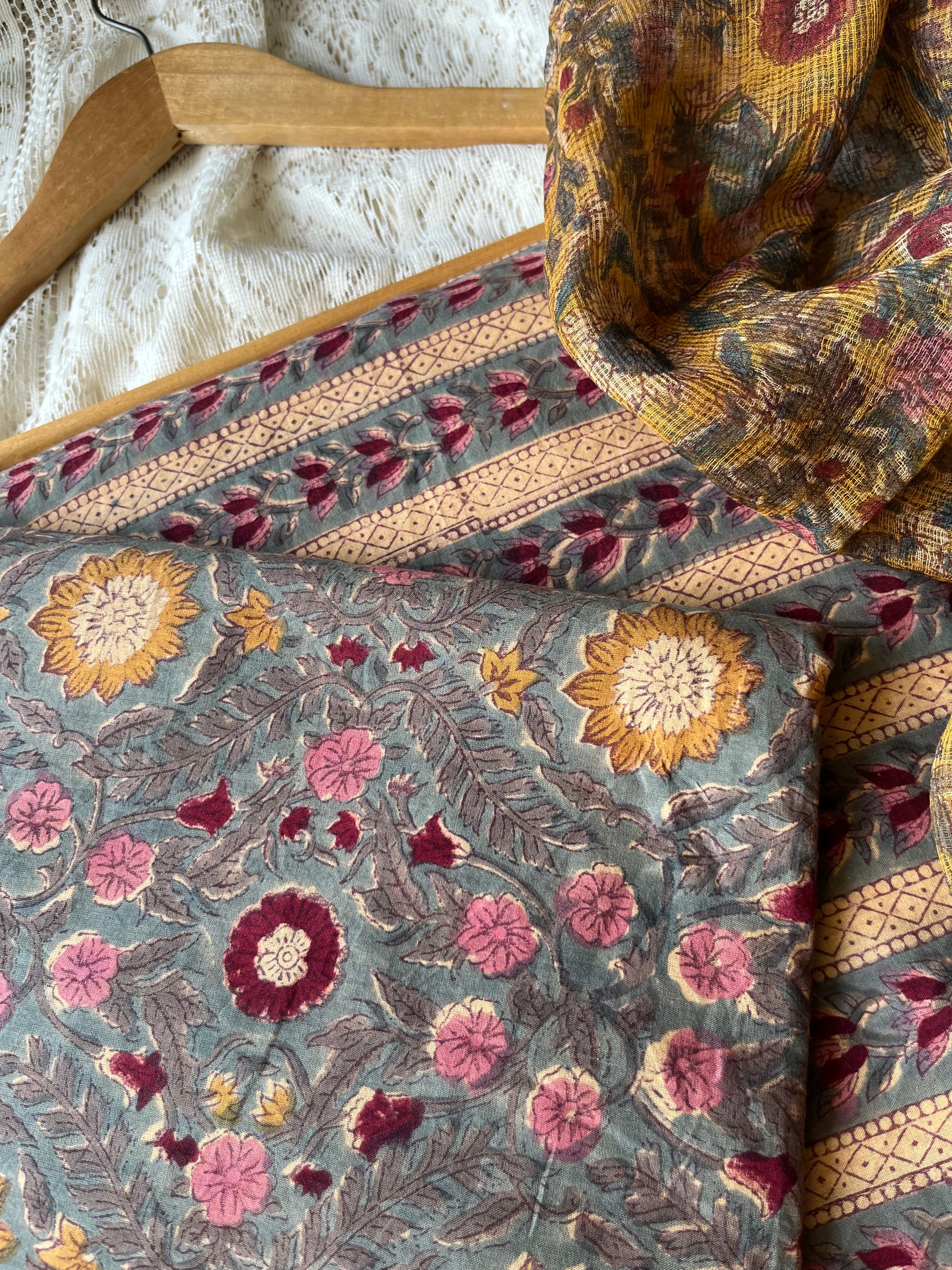 “Cotton block print kurta plain bottom fabric with a kota doria block print dupatta