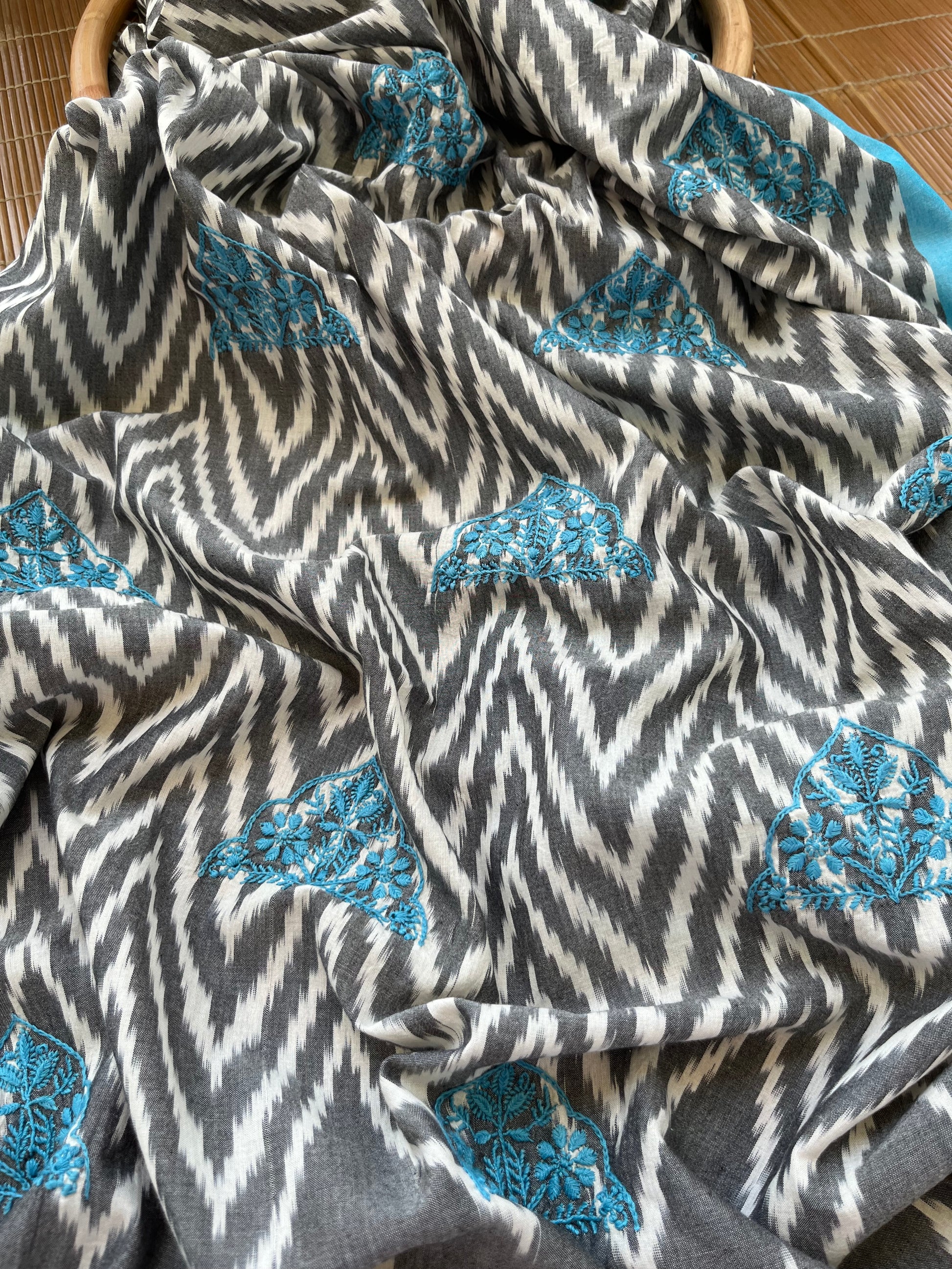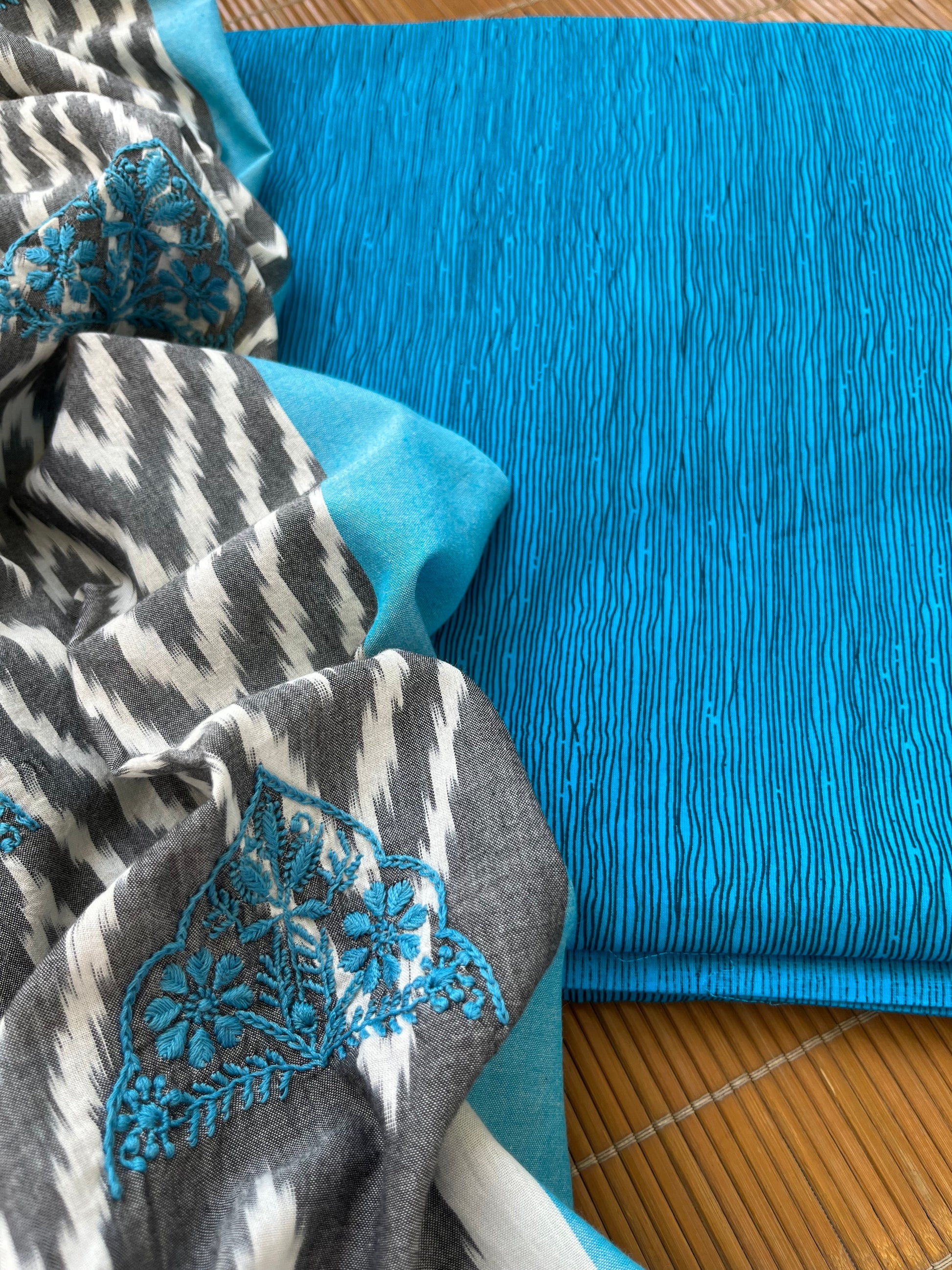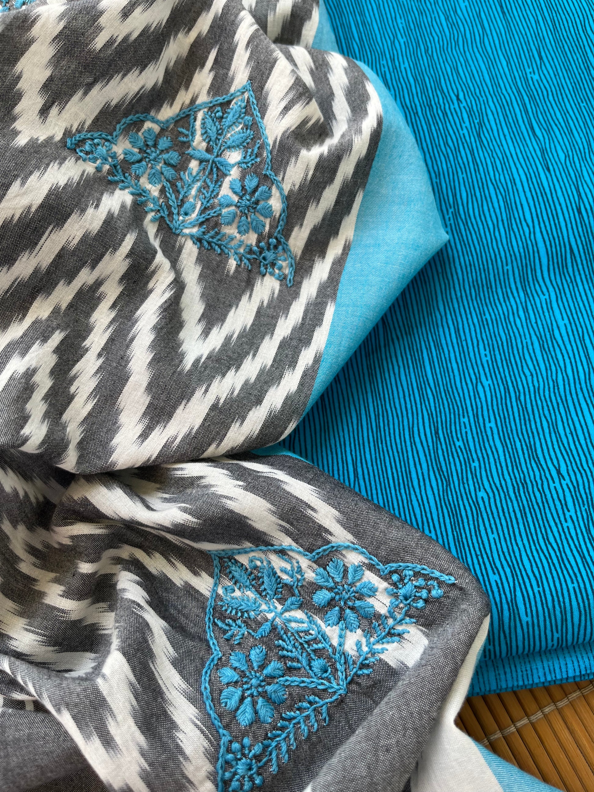 Double ikkat chikankari Dupatta… with cotton print kurta fabric … dupatta has booties scattered all over …