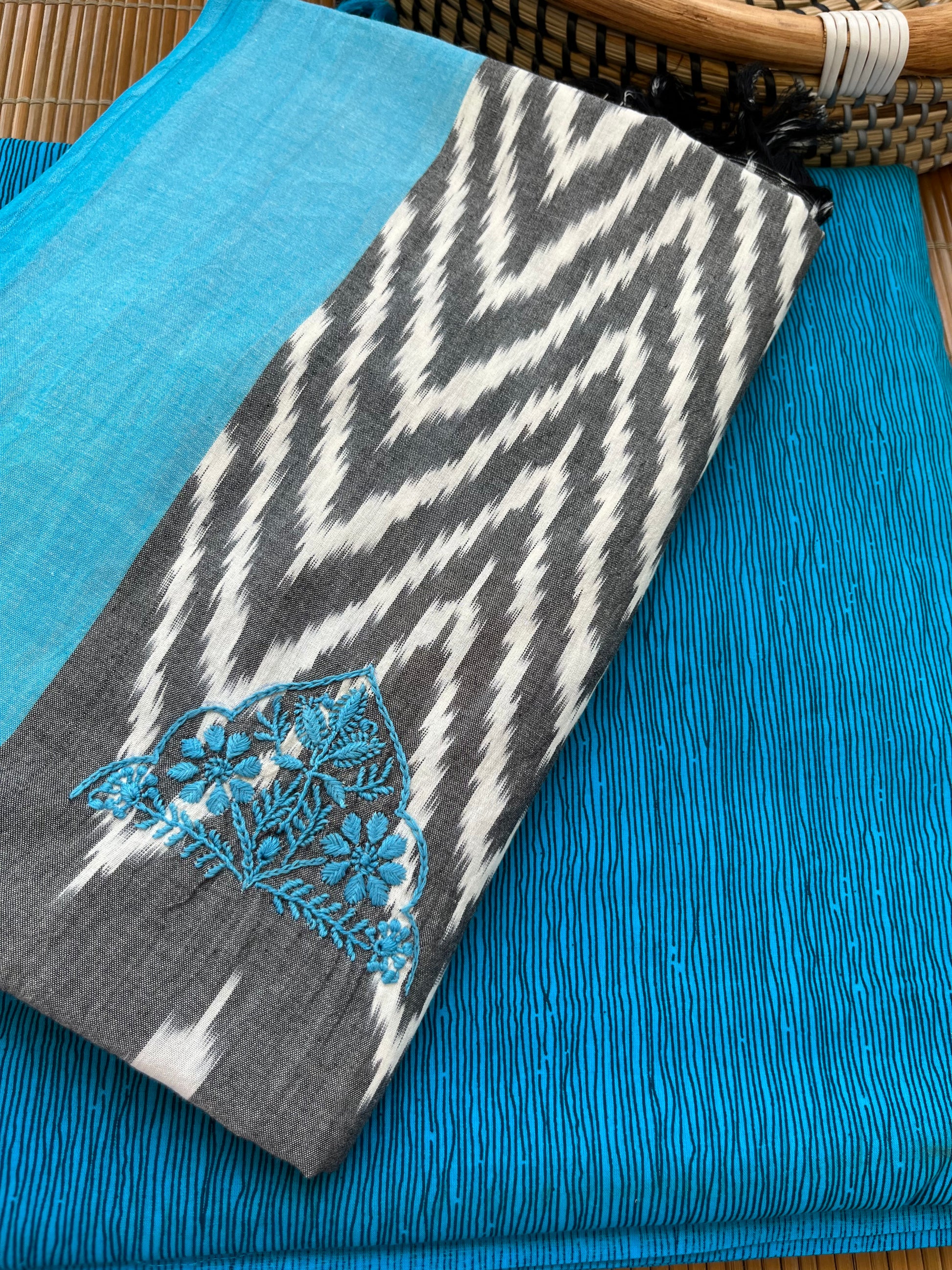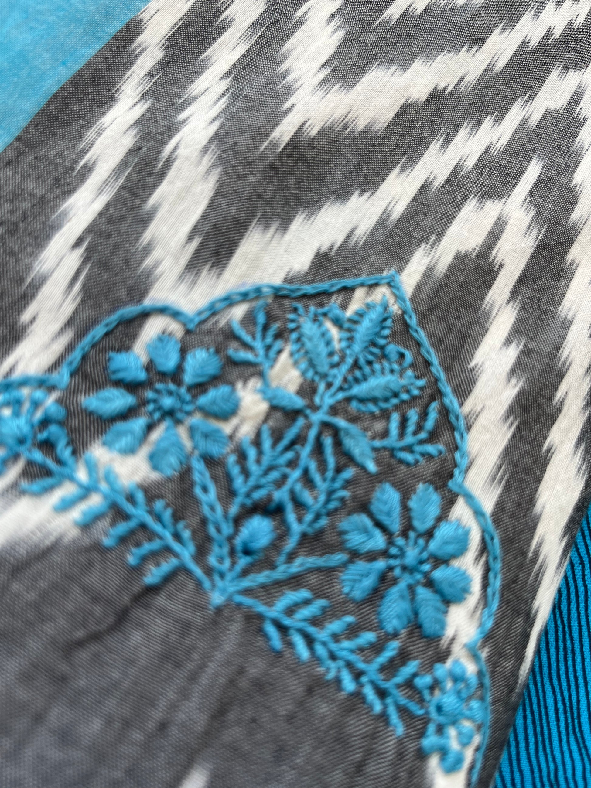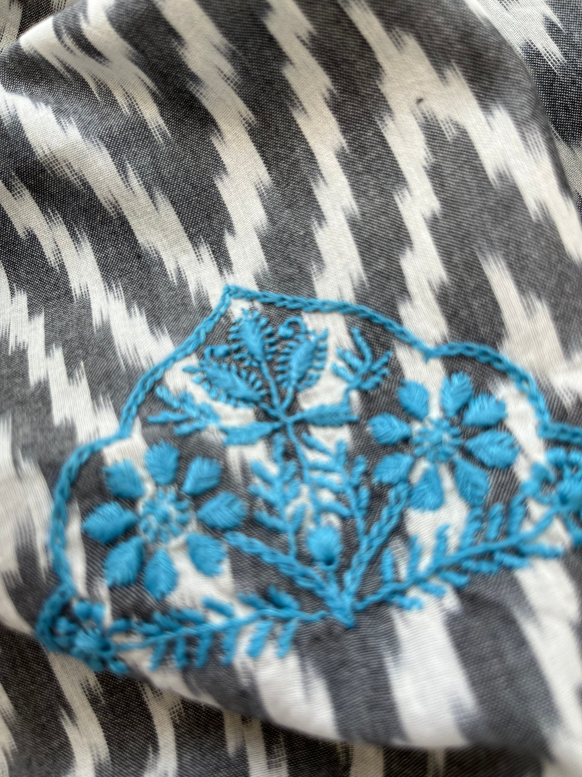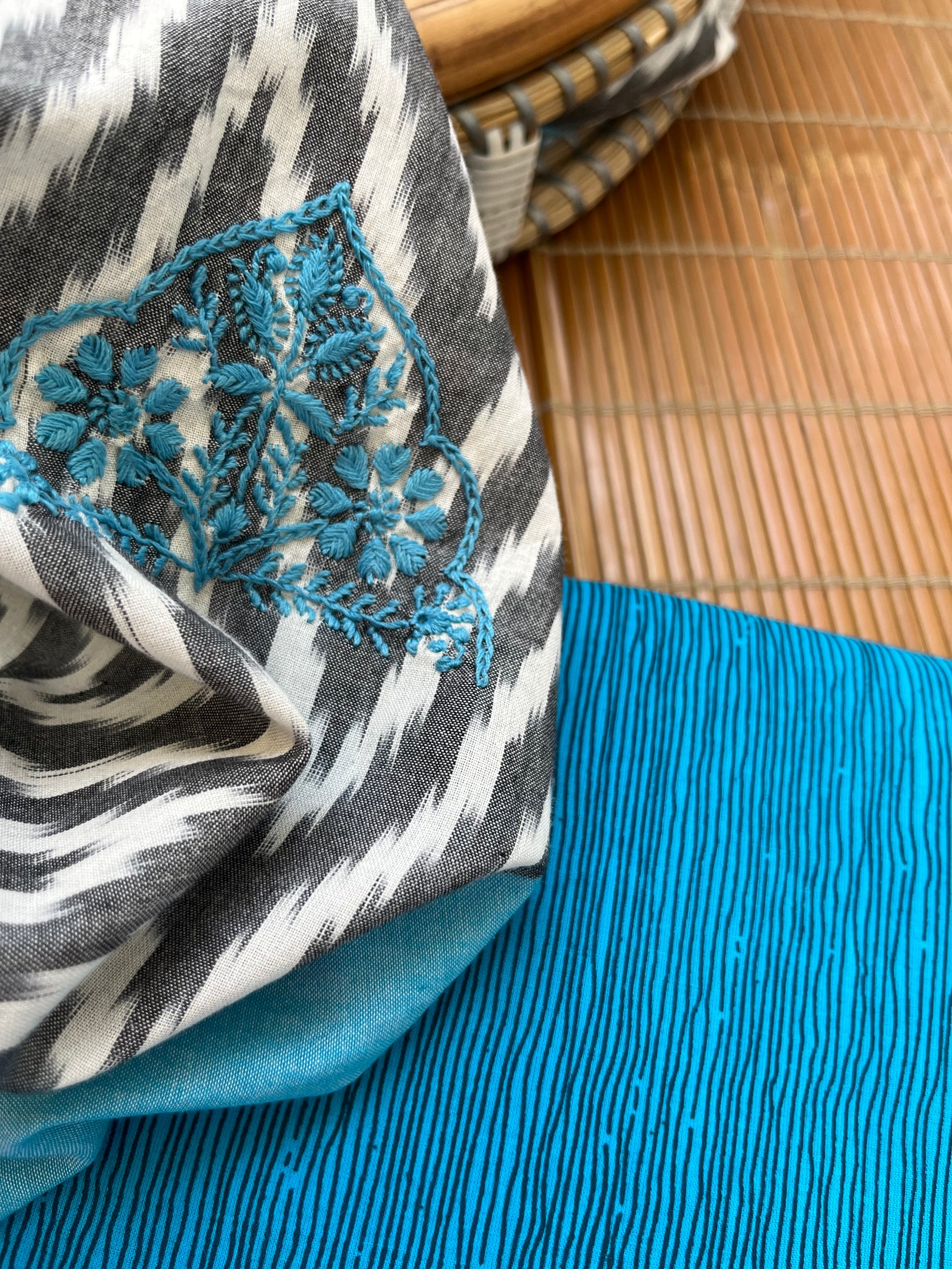 Double ikkat chikankari Dupatta… with cotton print kurta fabric … dupatta has booties scattered all over …