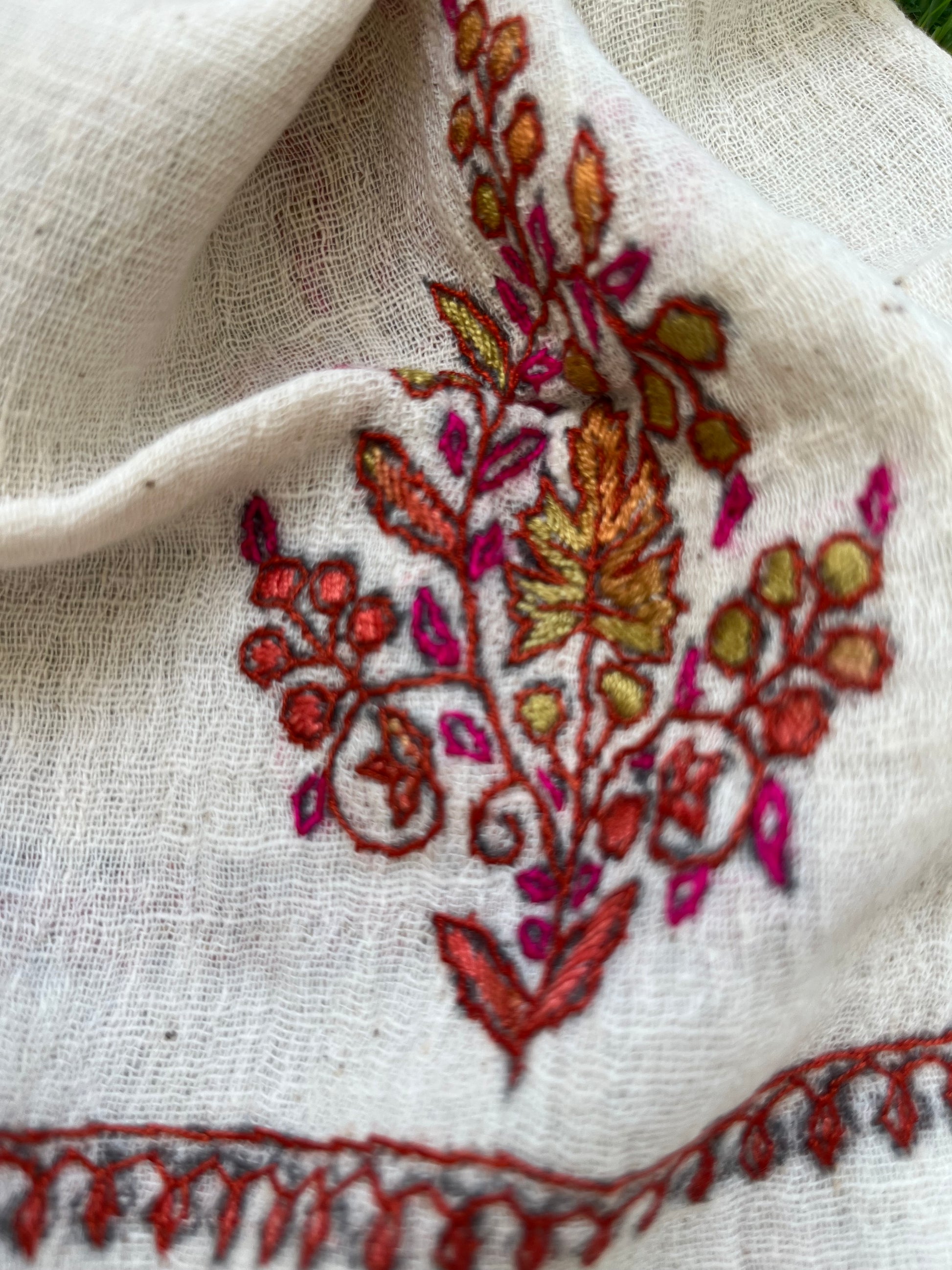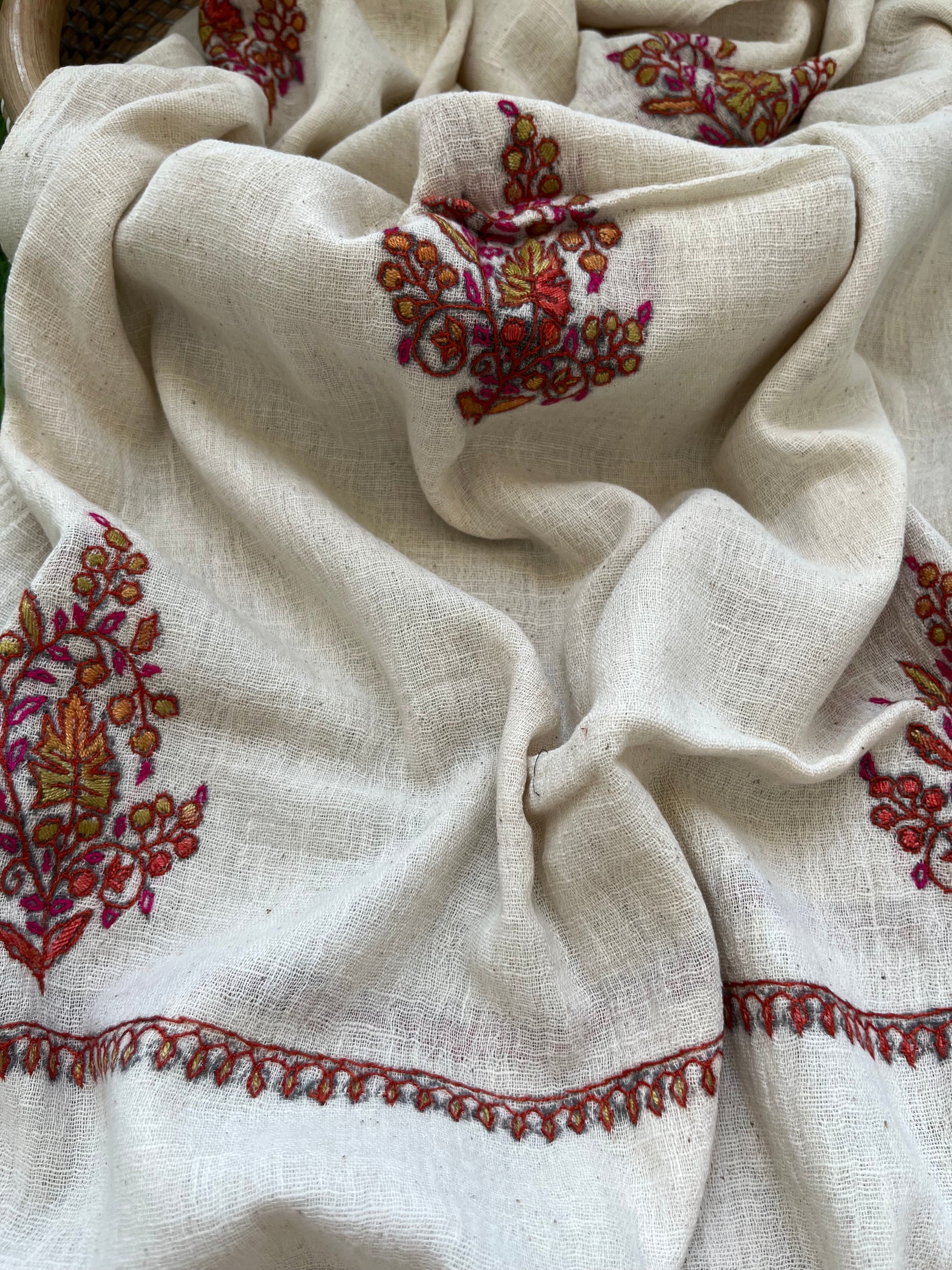 Wrap yourself in effortless grace with our exquisite linen stoles crafted on kala cotton—a fabric known for its soft, breathable texture and natural charm. Each stole is adorned with intricate Kashmiri hand embroidery, where skilled artisans bring delicate motifs to life stitch by stitch.