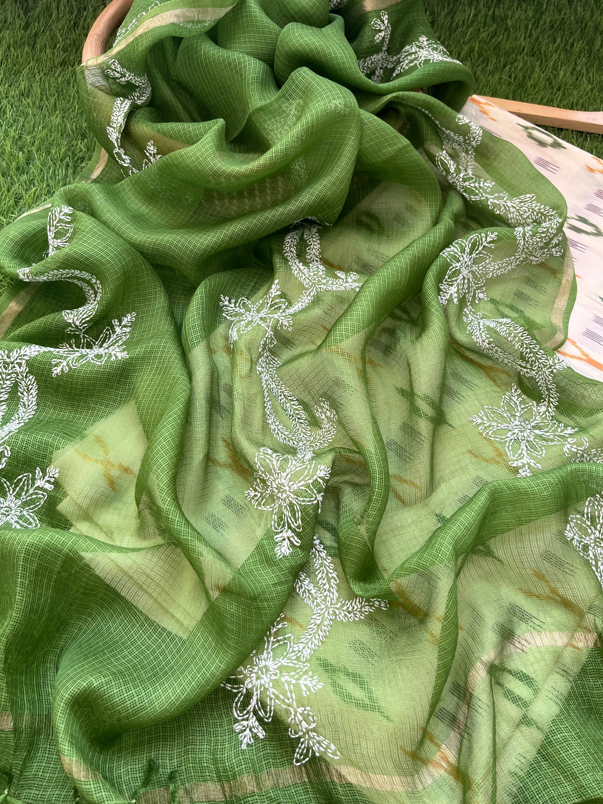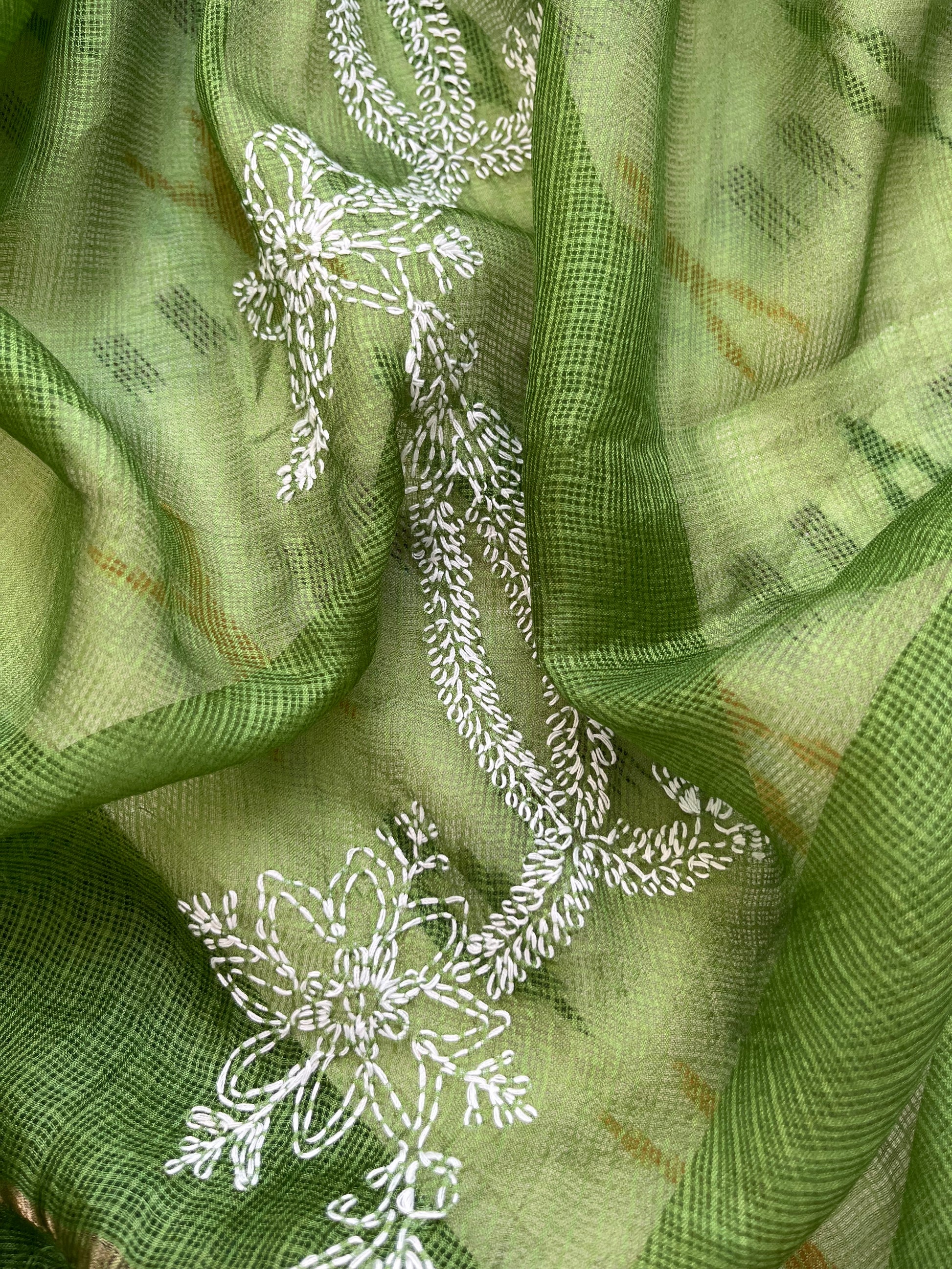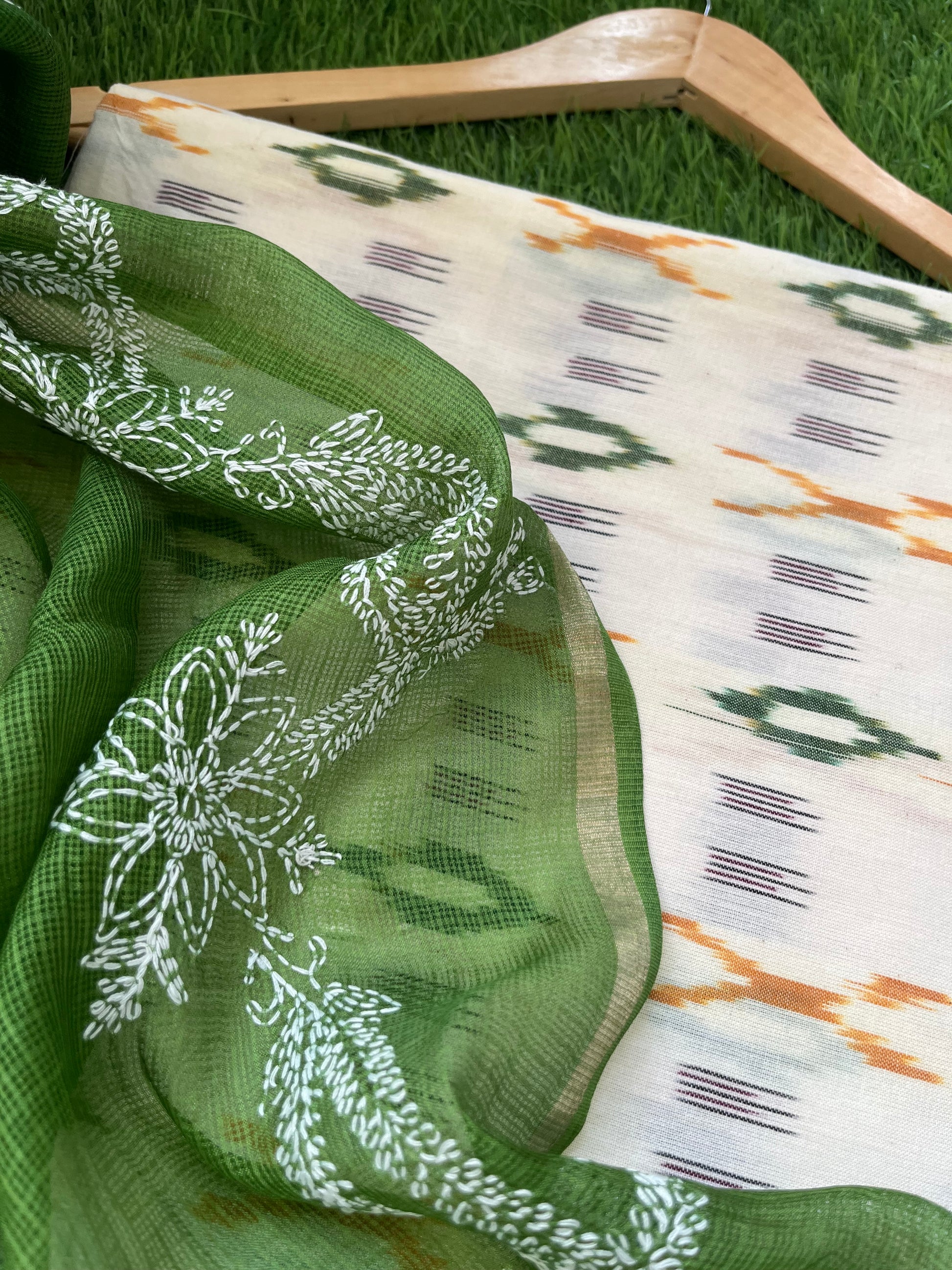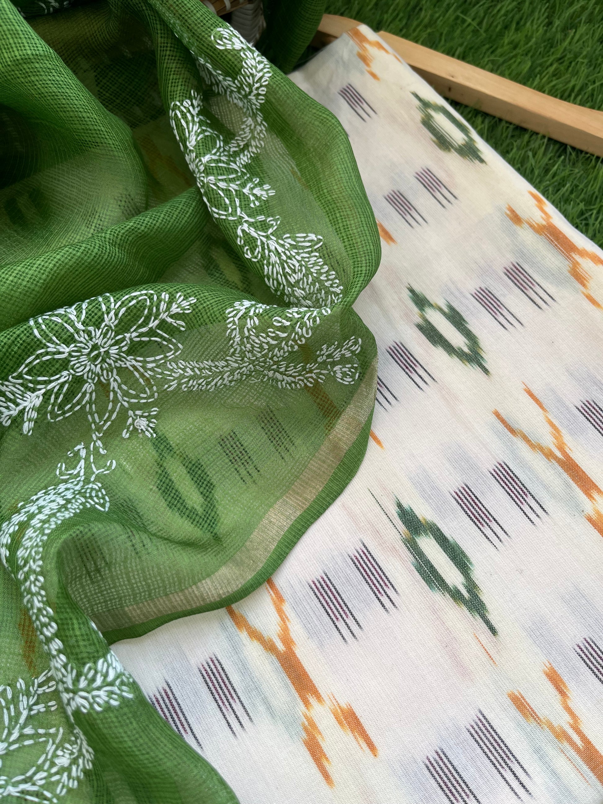Kota silk Chikankari Dupatta with cotton ikkat kurta Fabric