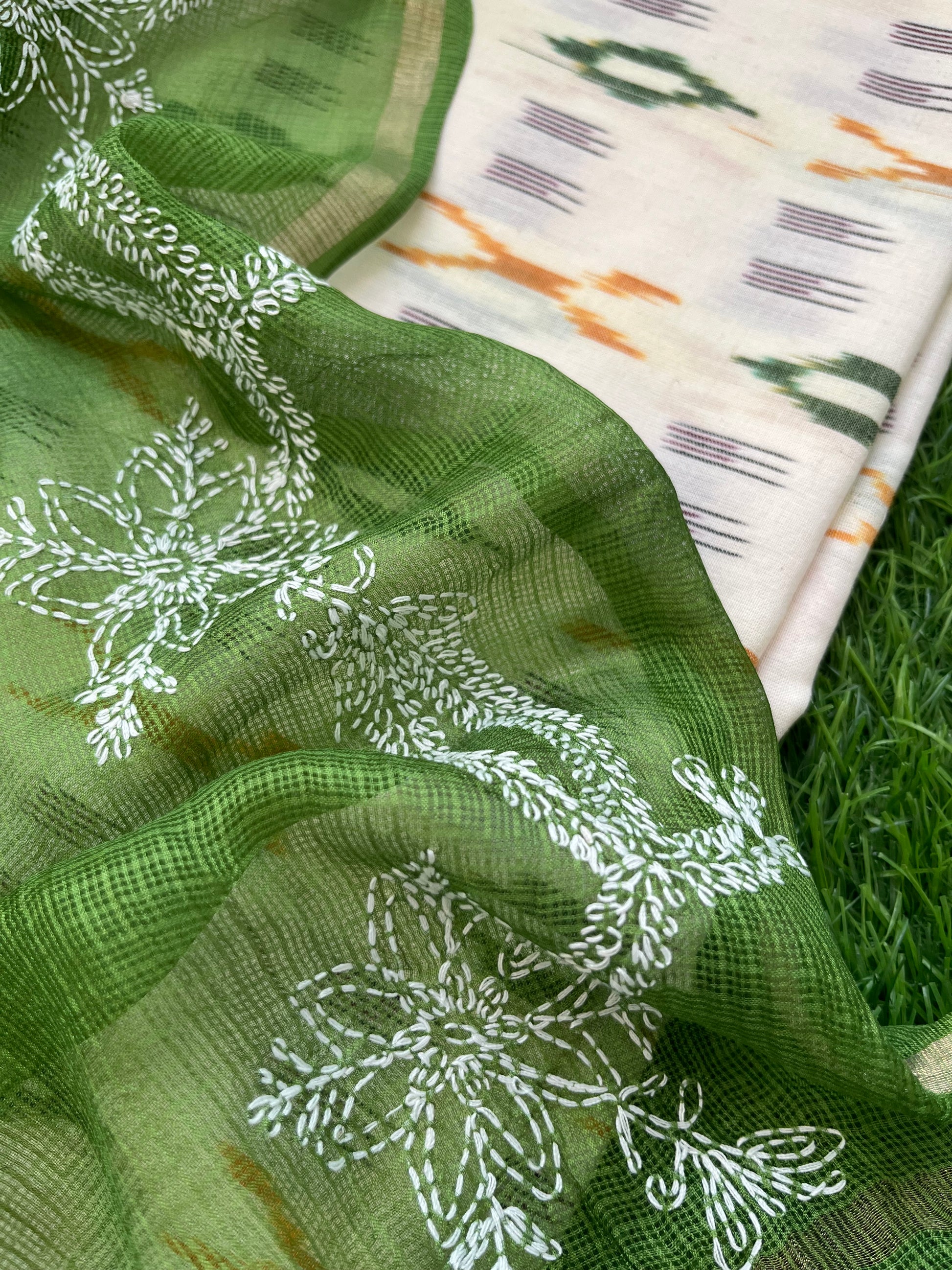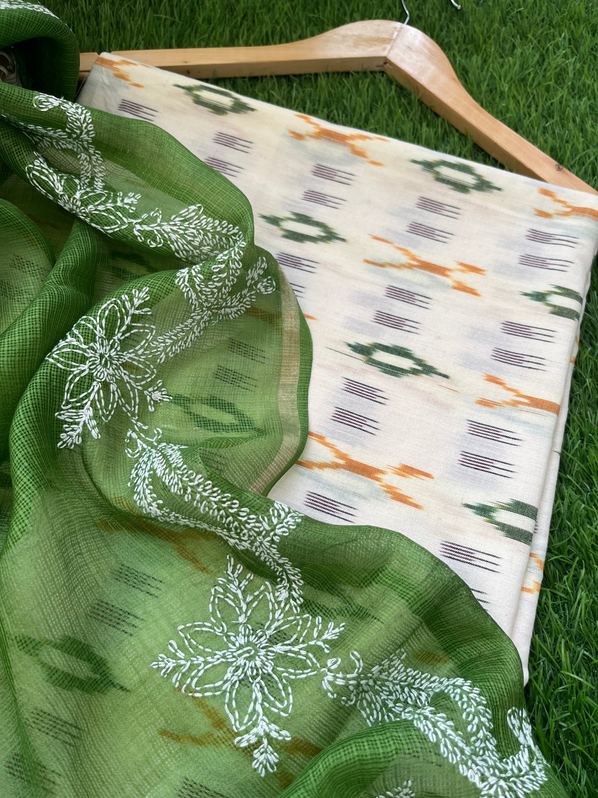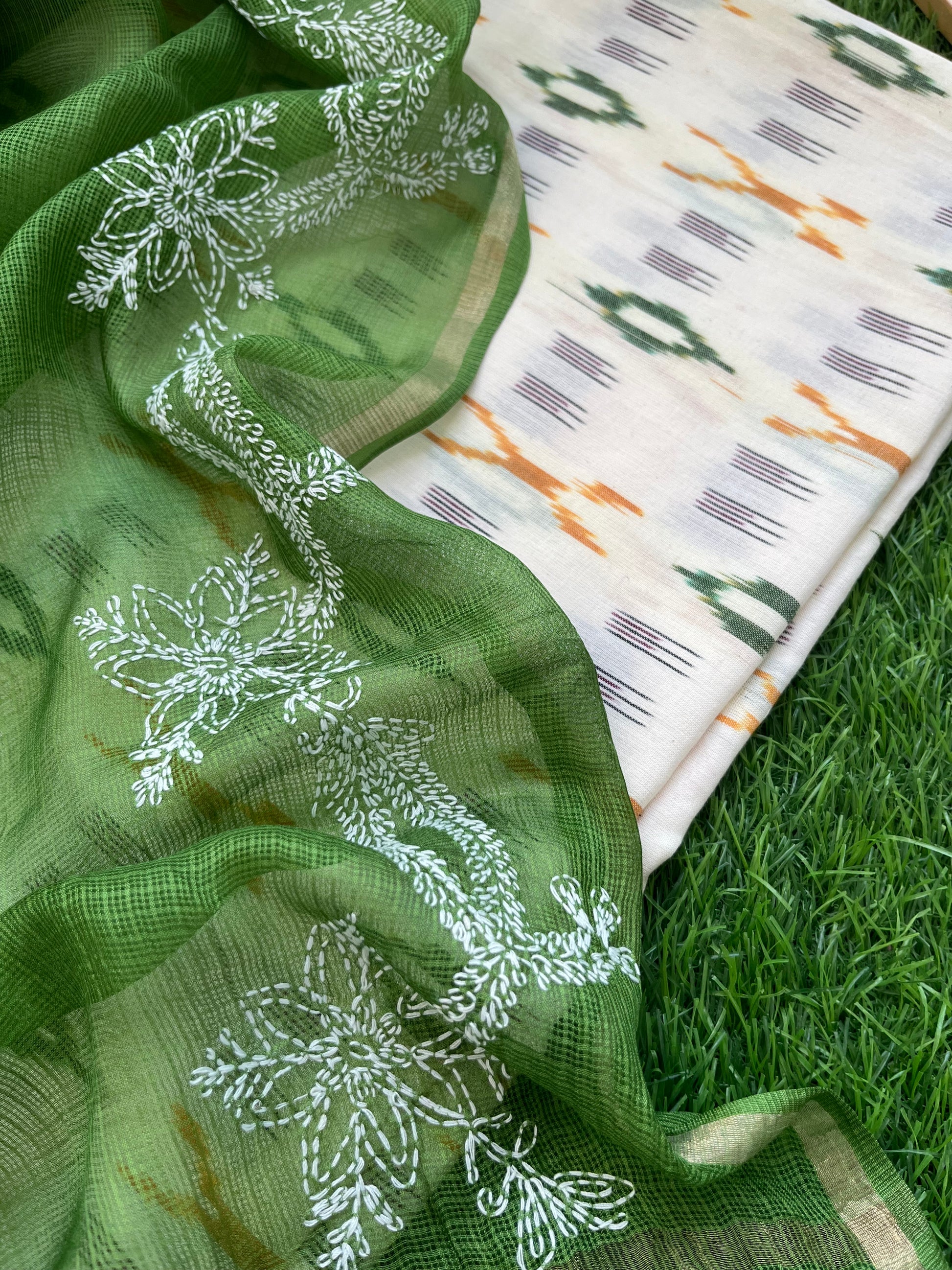 Cotton ikkat kurta fabric paired with a kota silk chikankari Dupatta