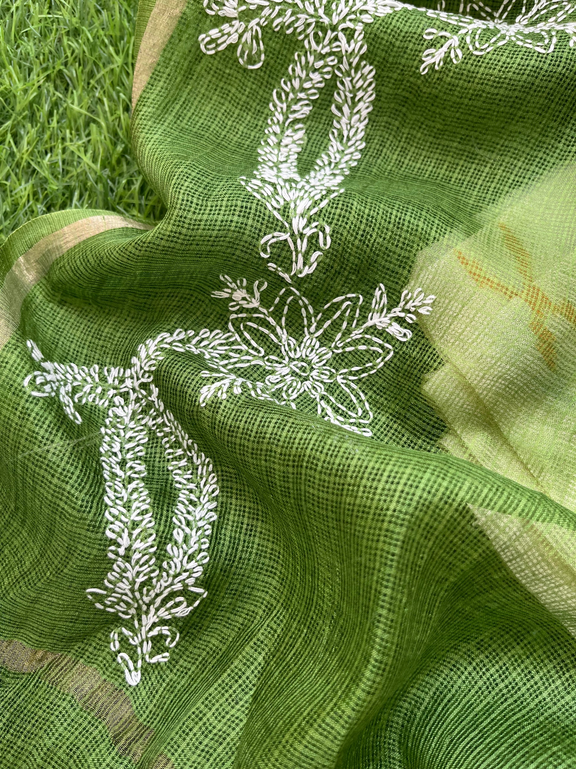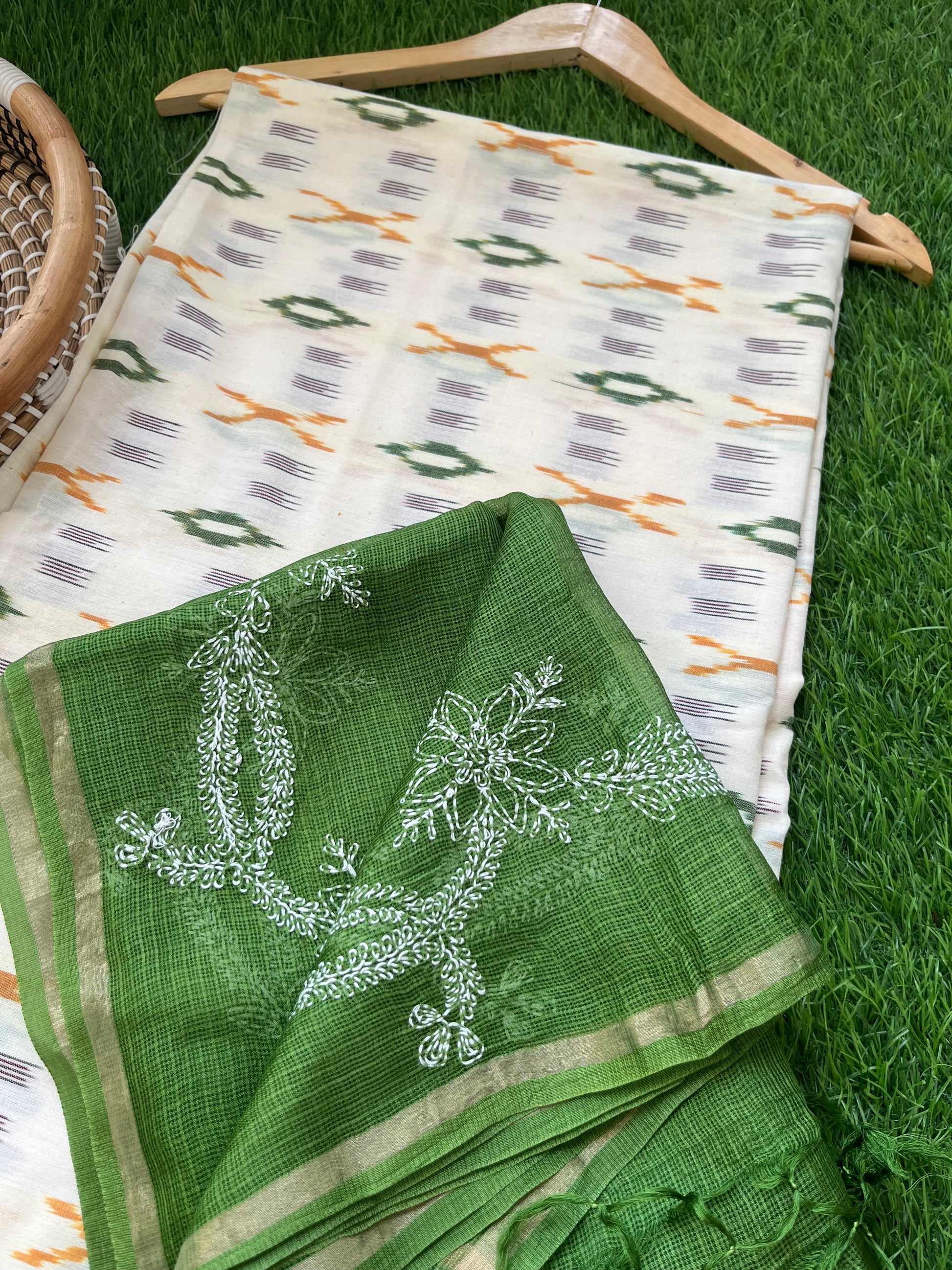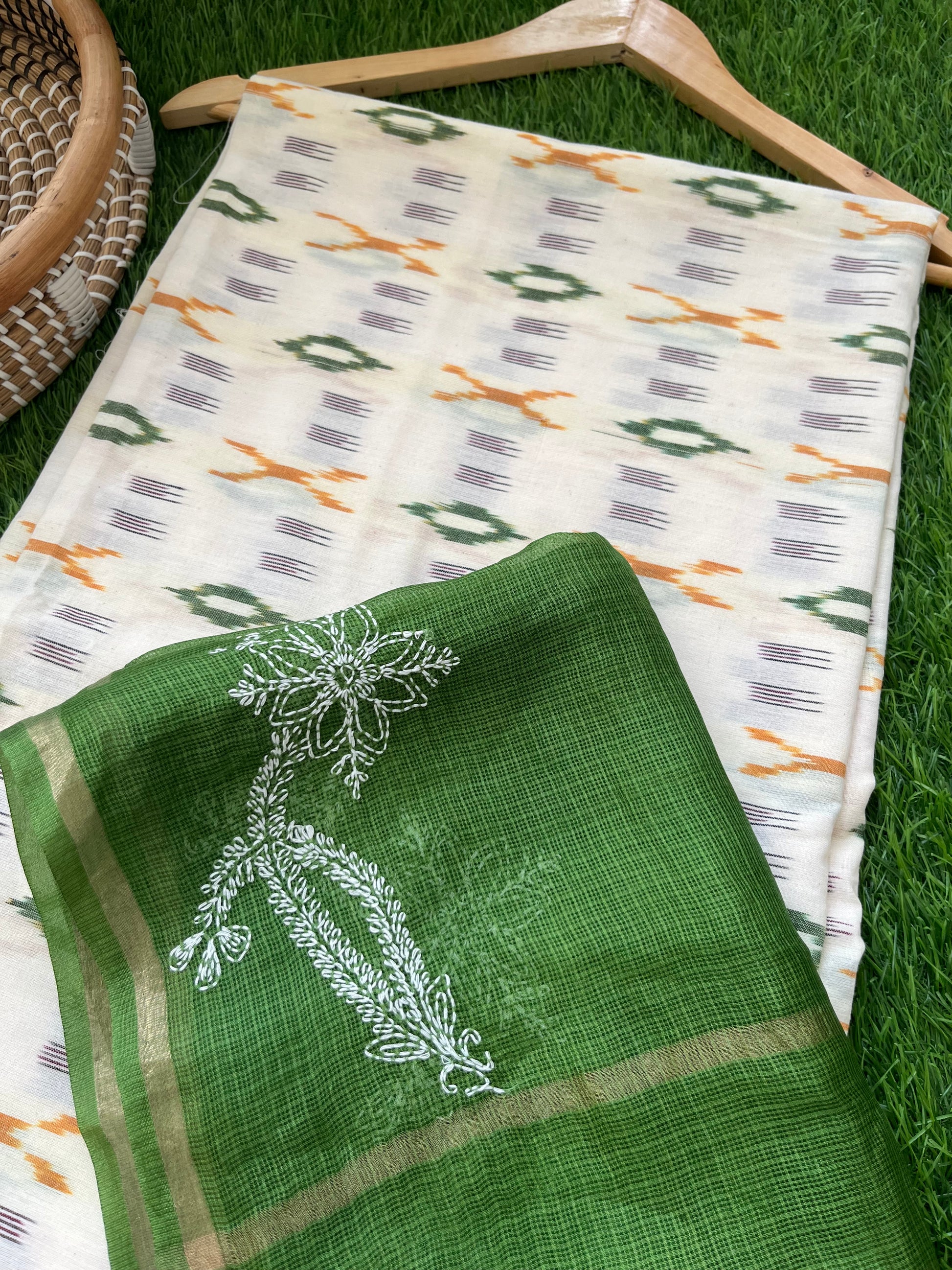 Cotton ikkat kurta fabric paired with a kota silk chikankari Dupatta