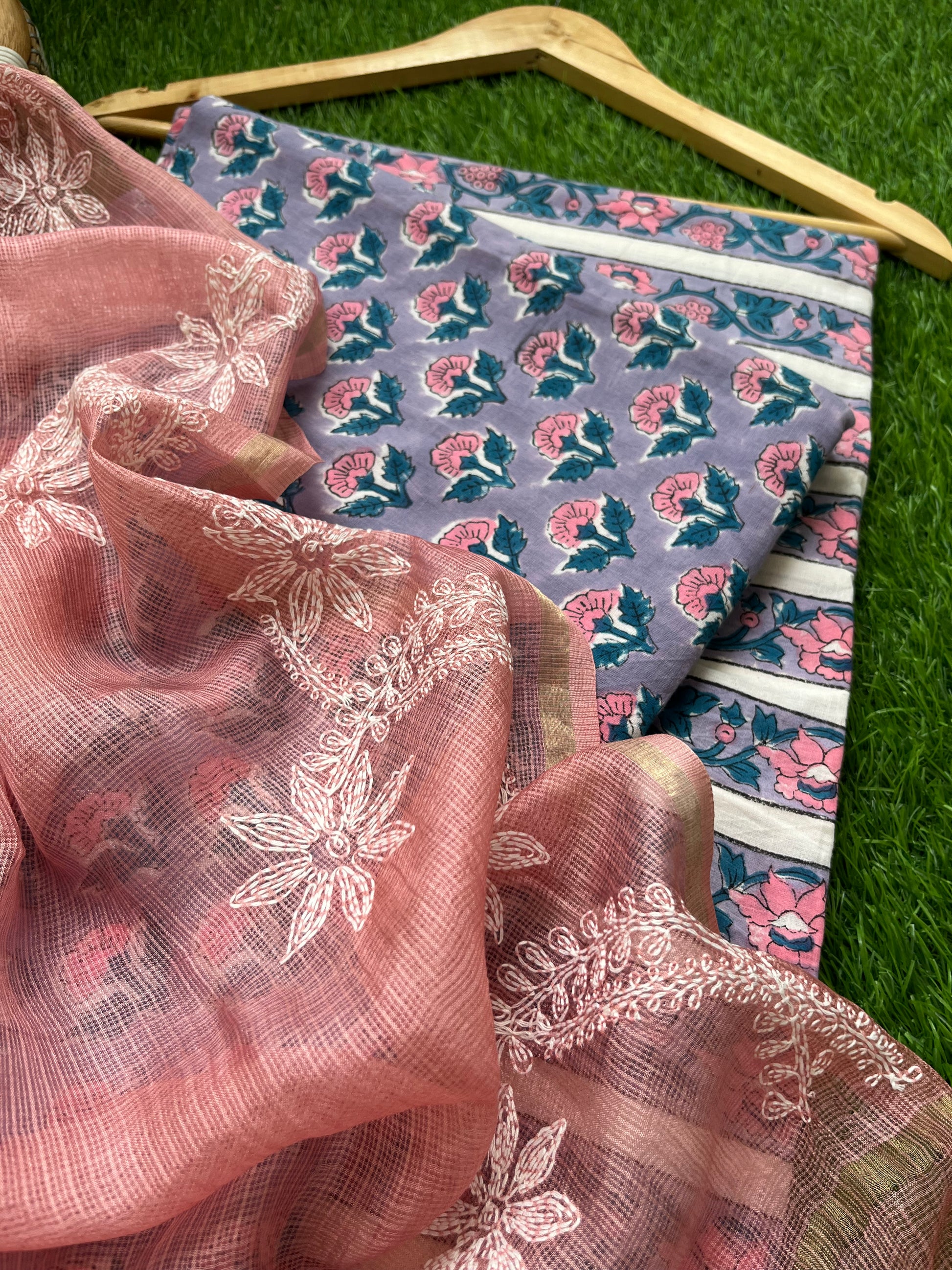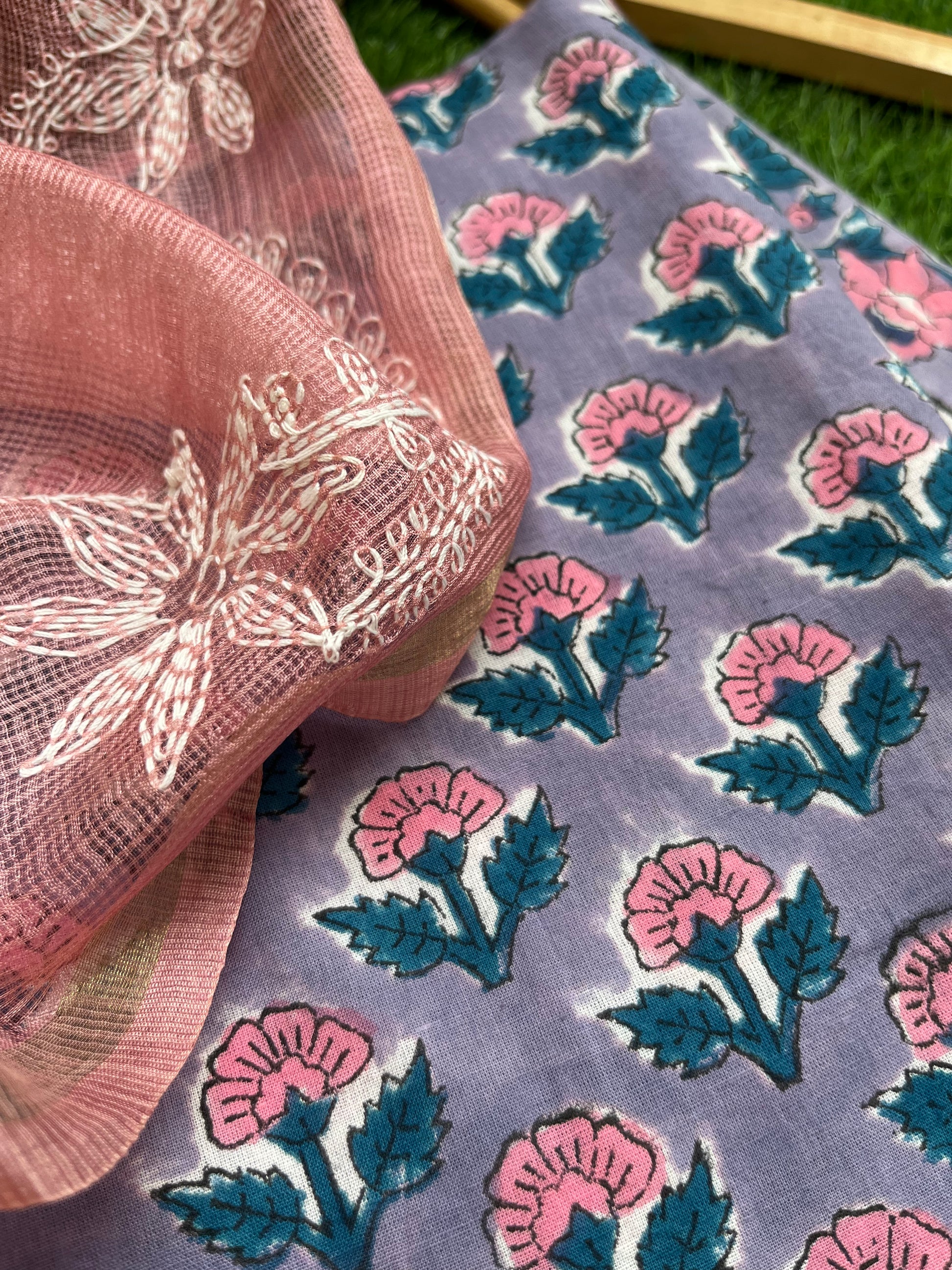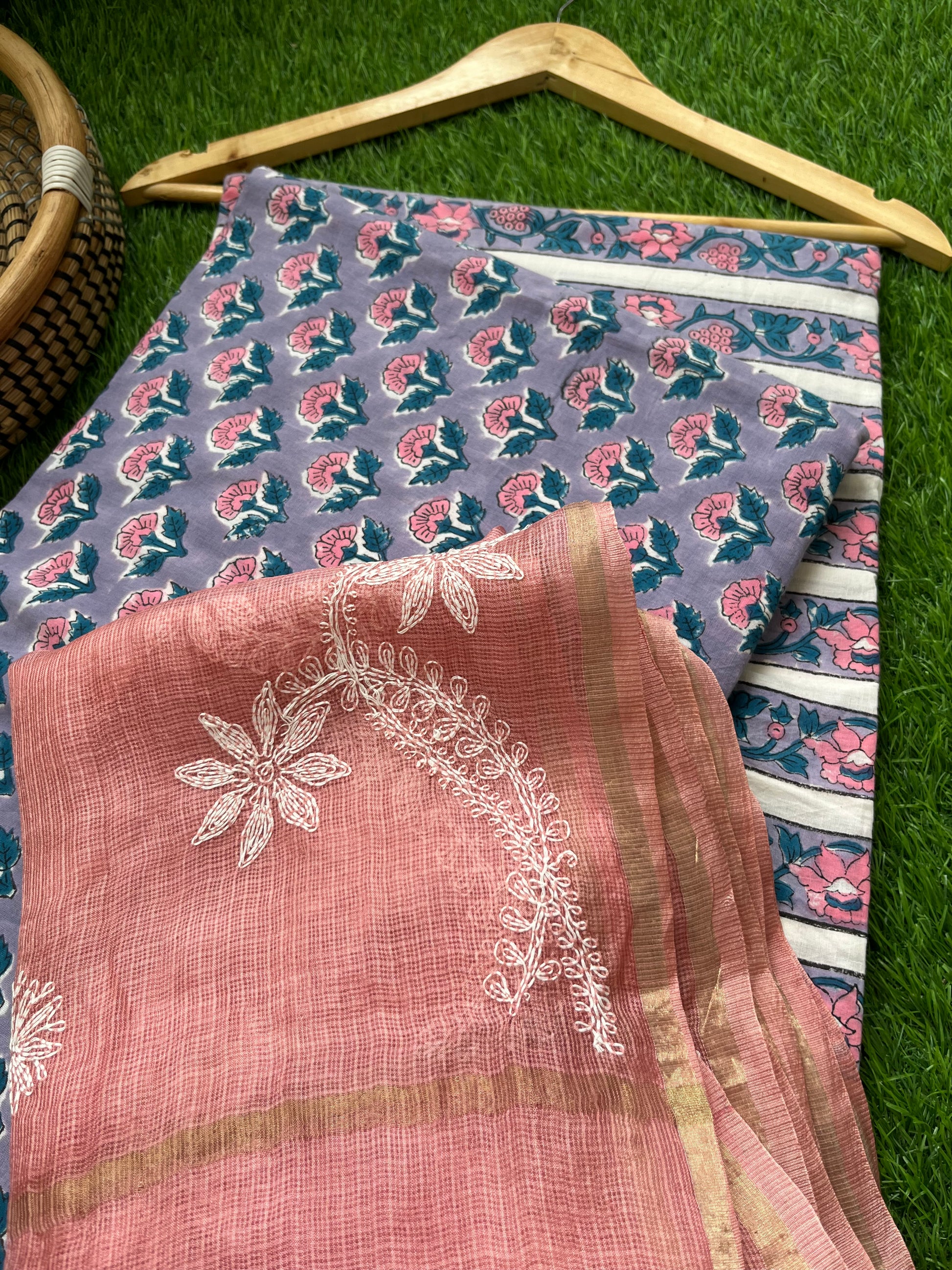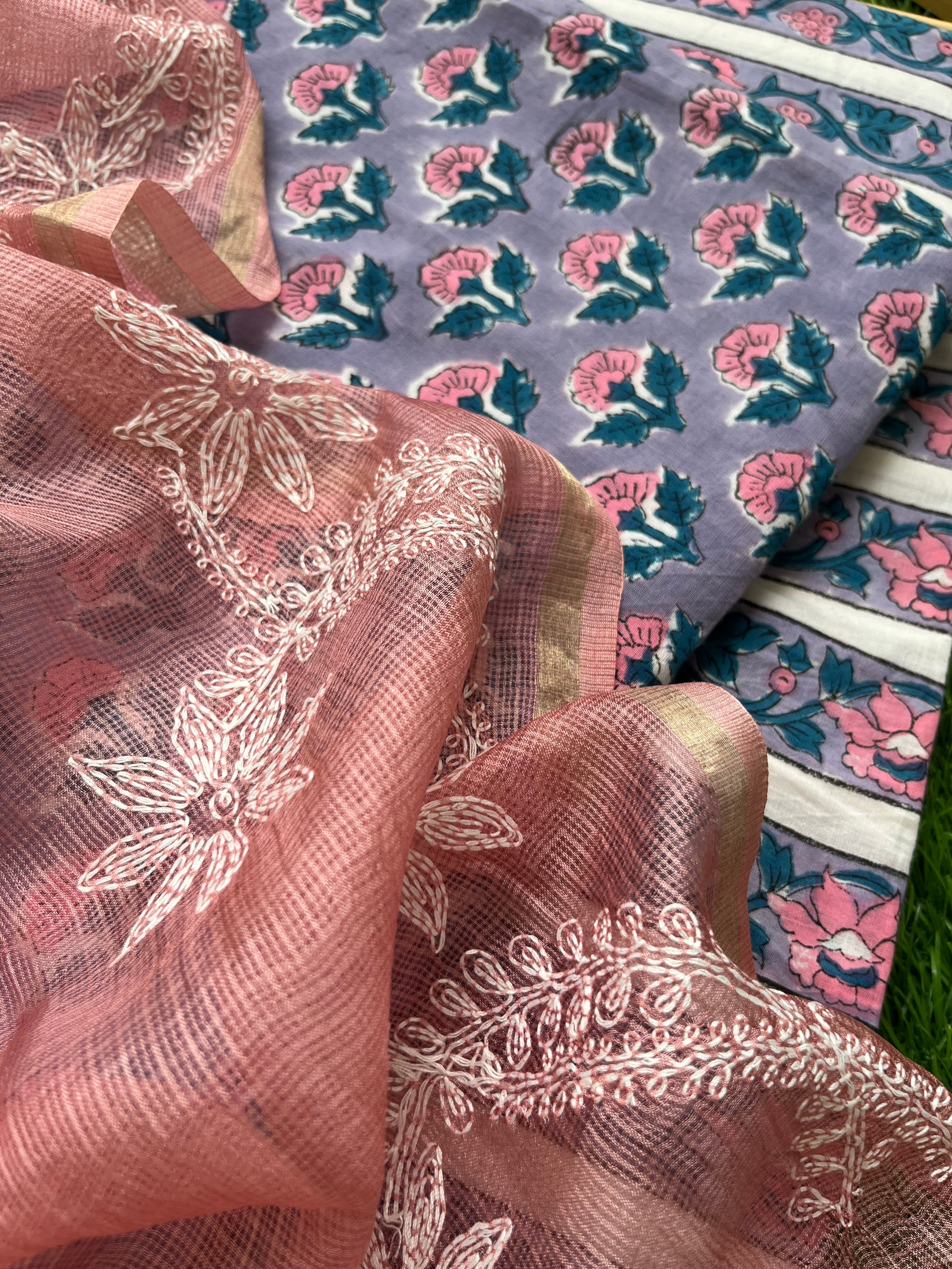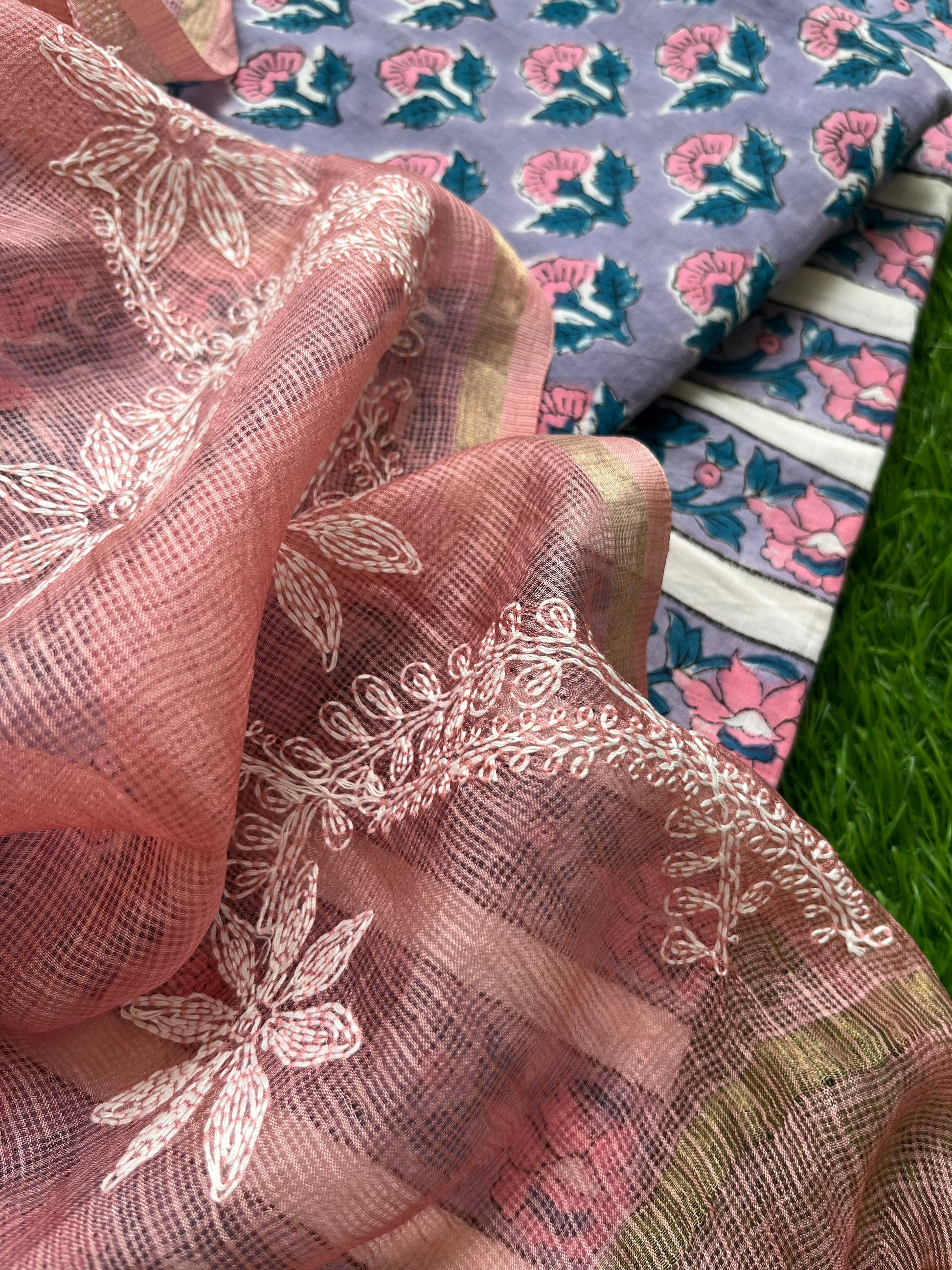 Cotton block print kurta bottom fabric paired with a kota silk chikankari Dupatta