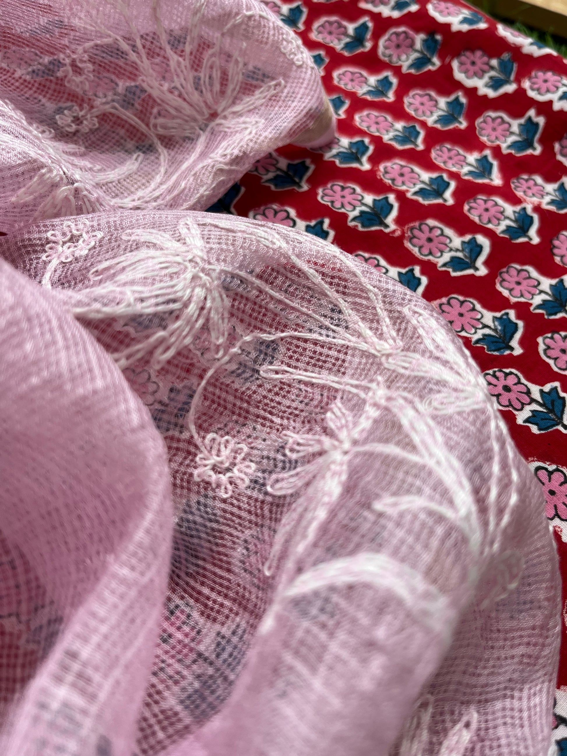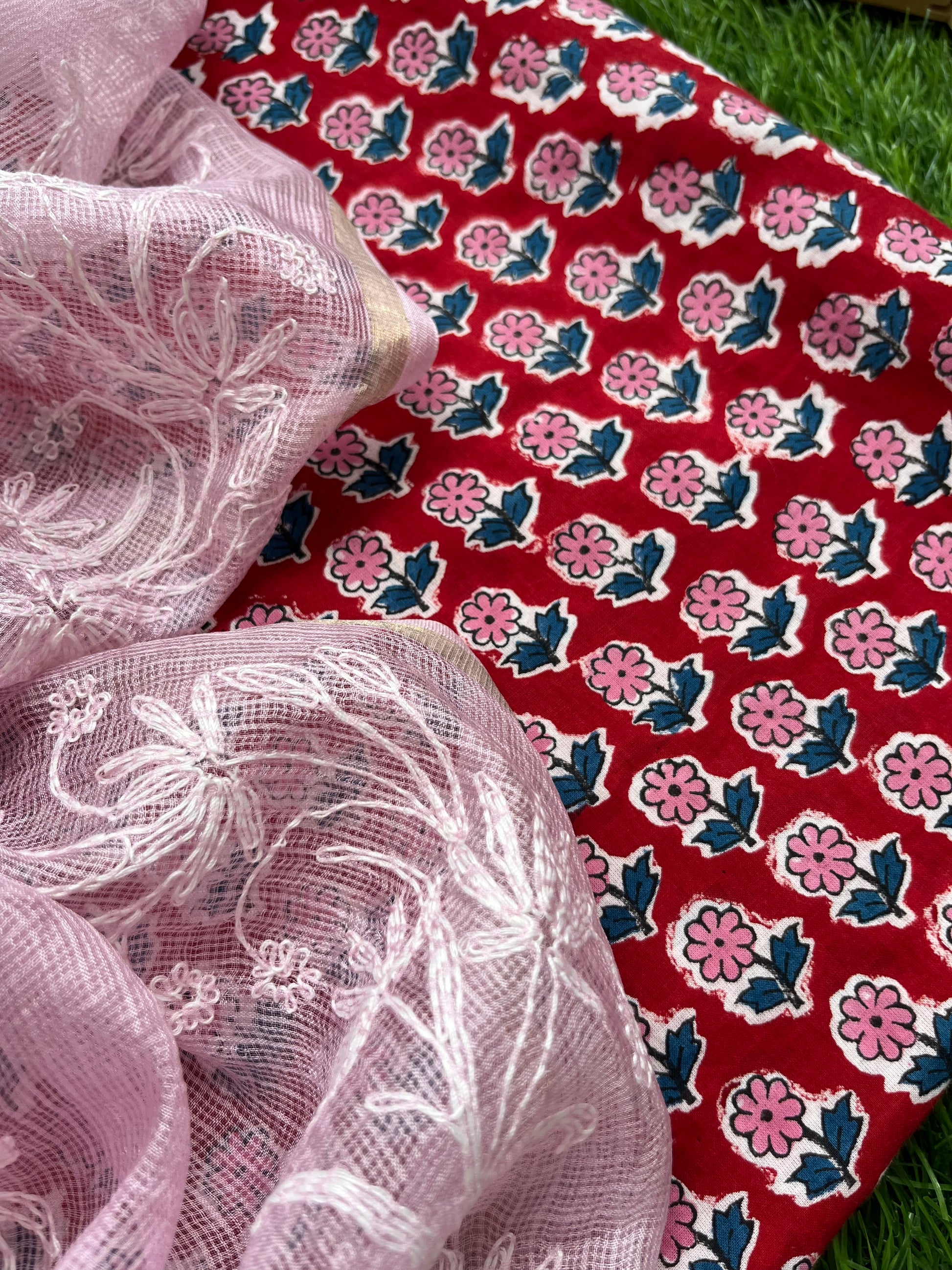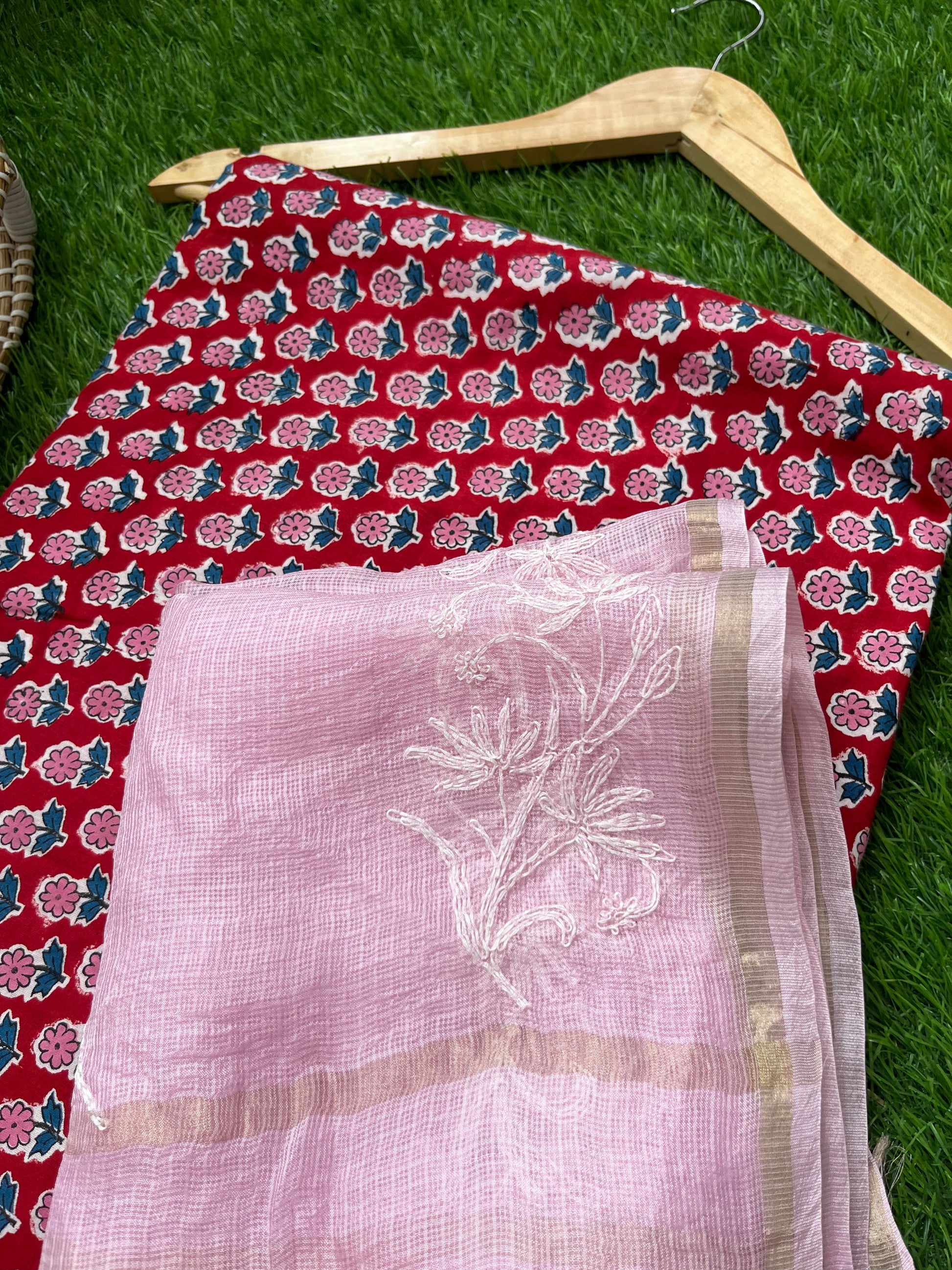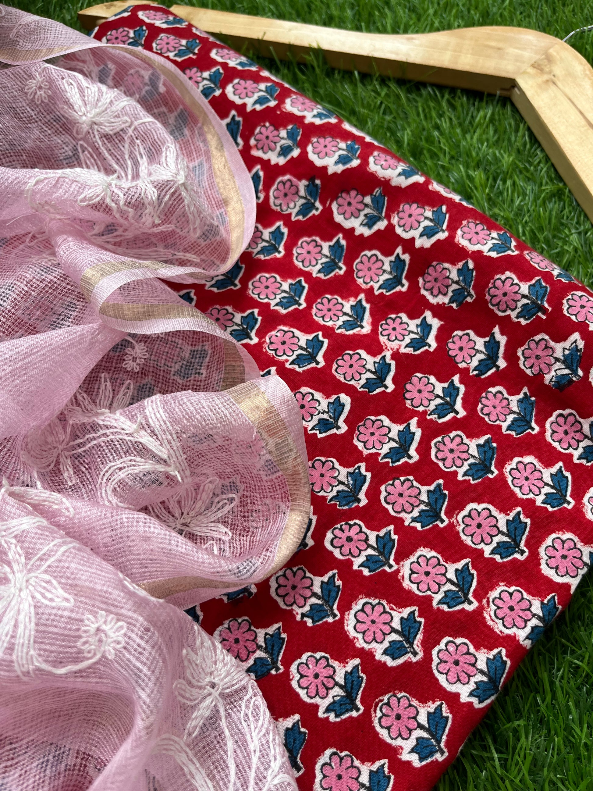 Cotton block print kurta bottom fabric paired with a kota silk chikankari Dupatta