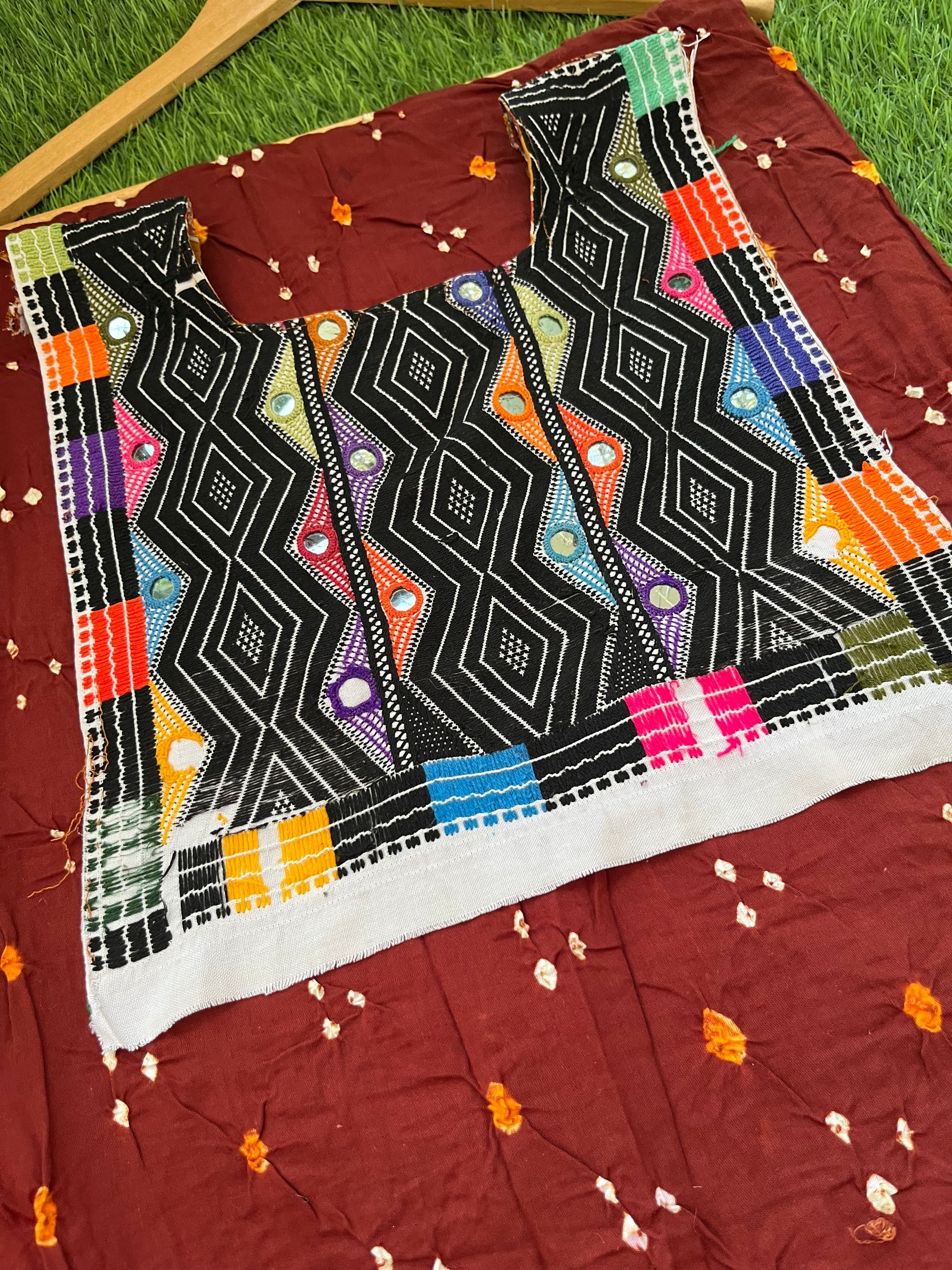 Tiny Banjara patches around the neckline, not fully, just 3–4 places.