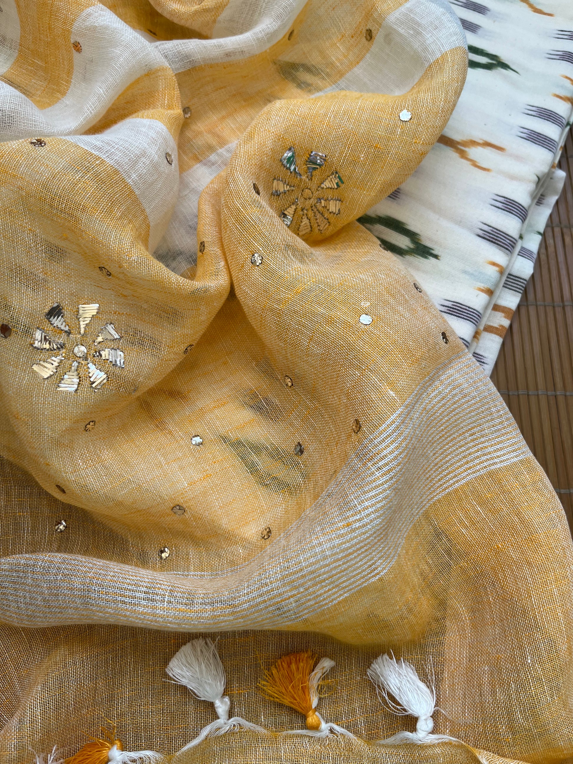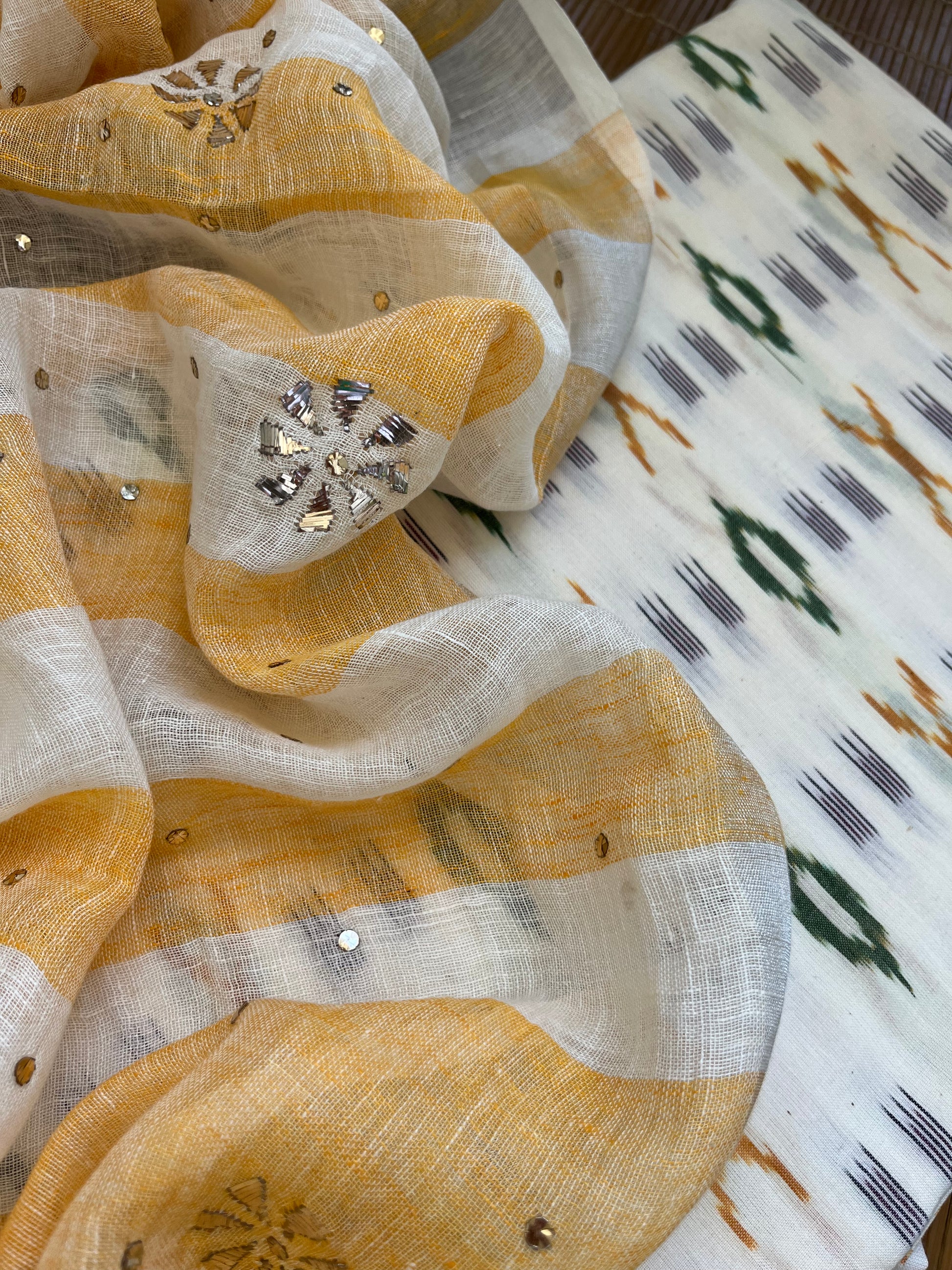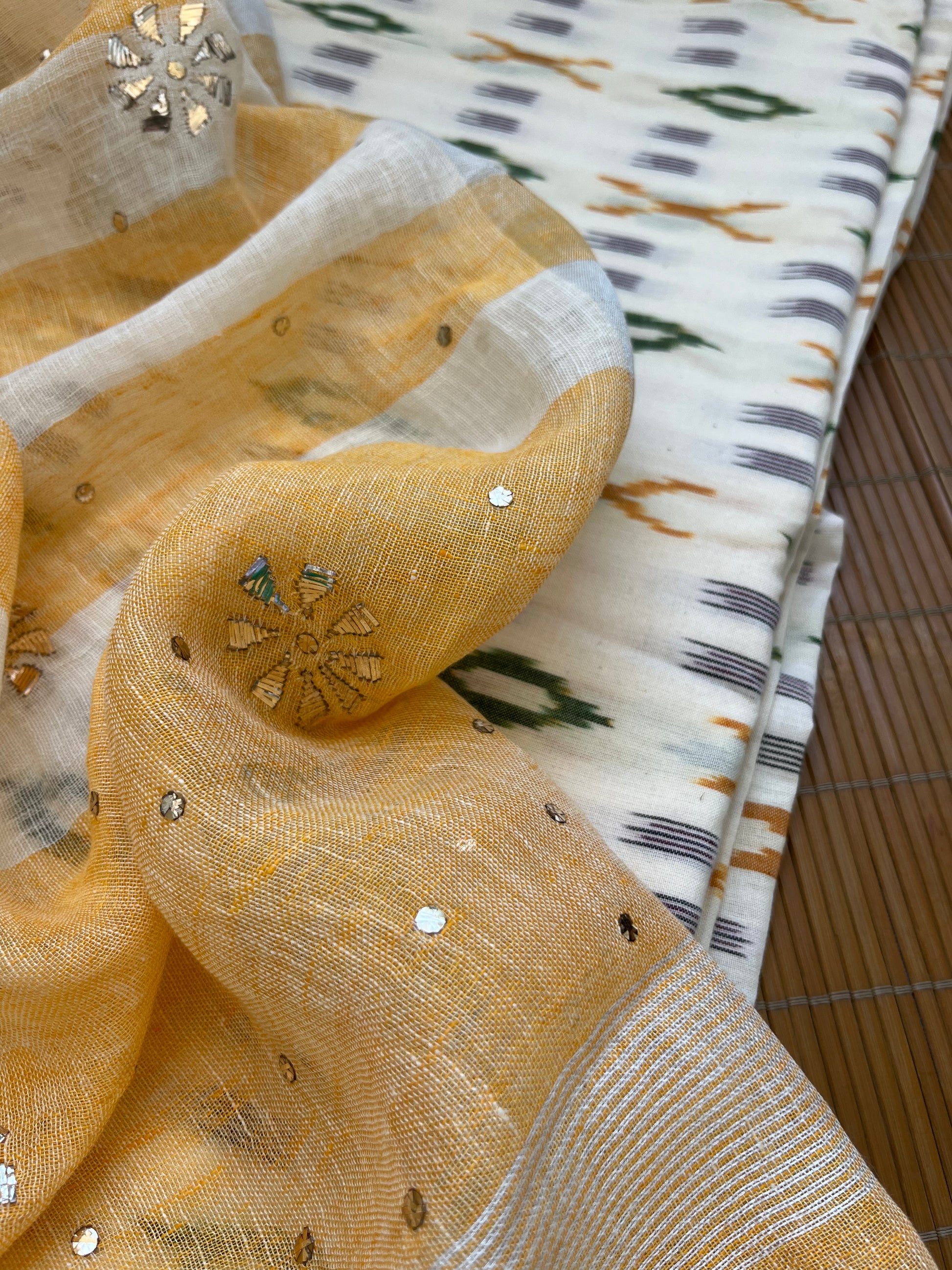 Mukaish linen dupatta cotton ikkat fabric