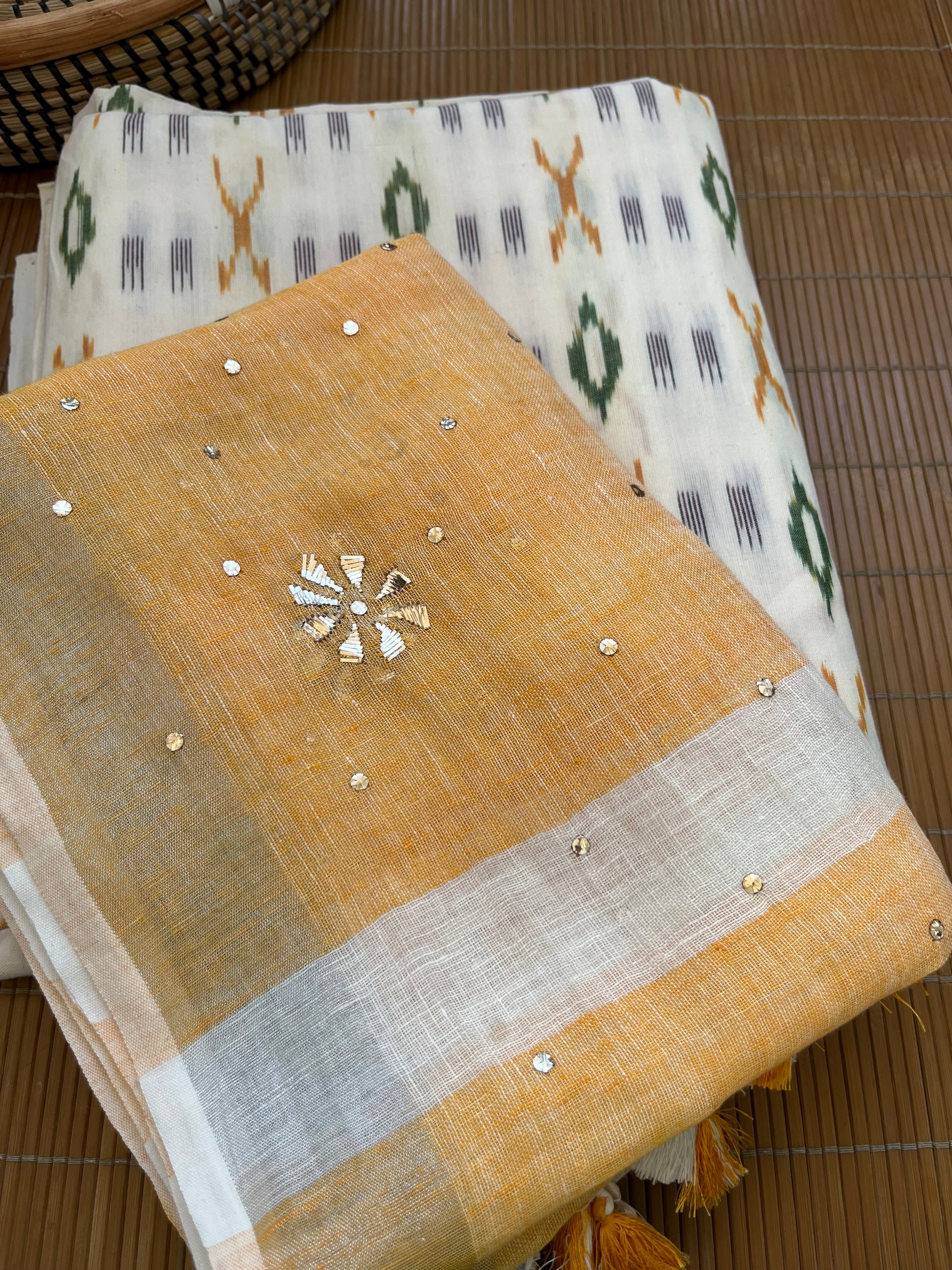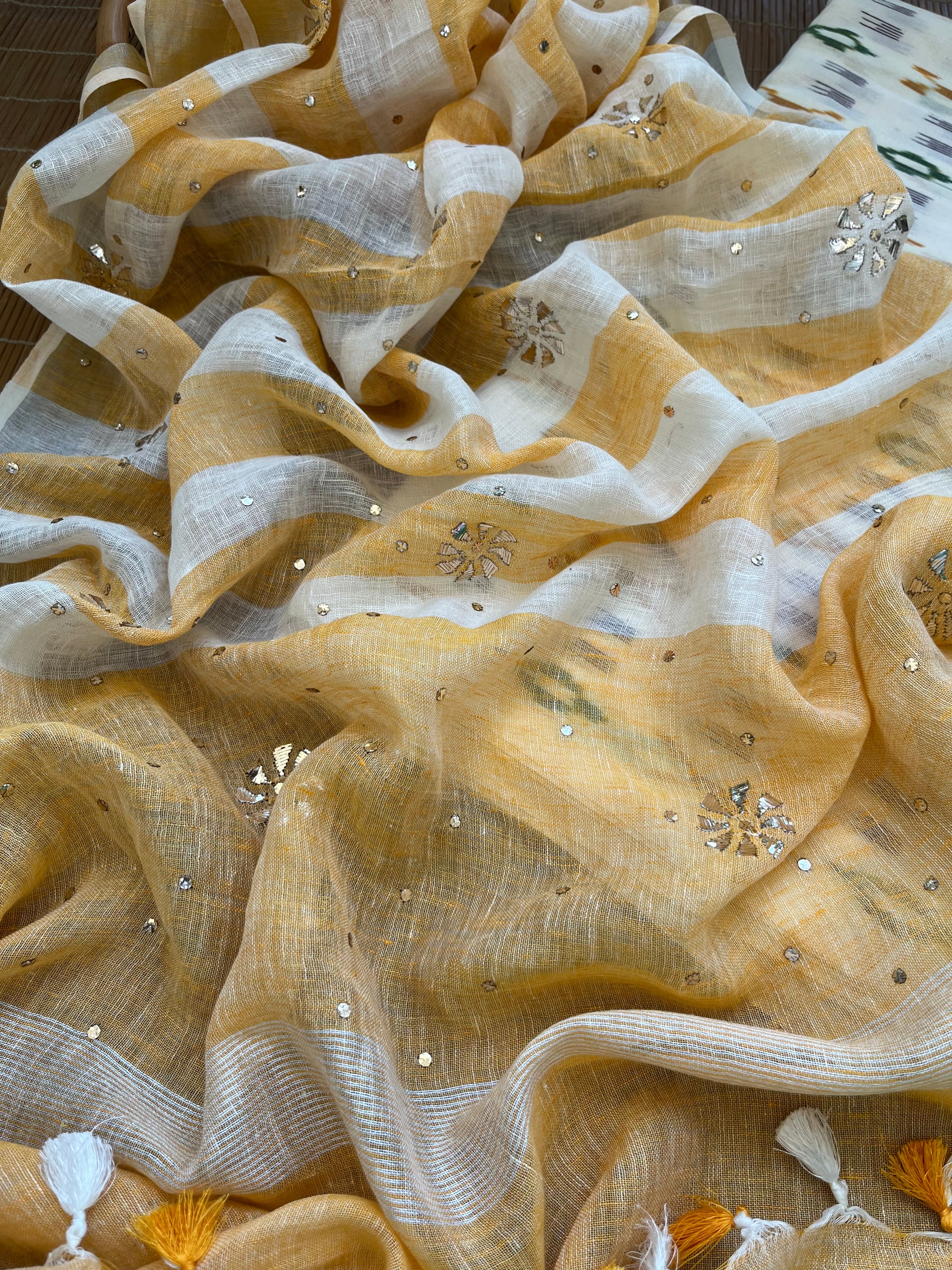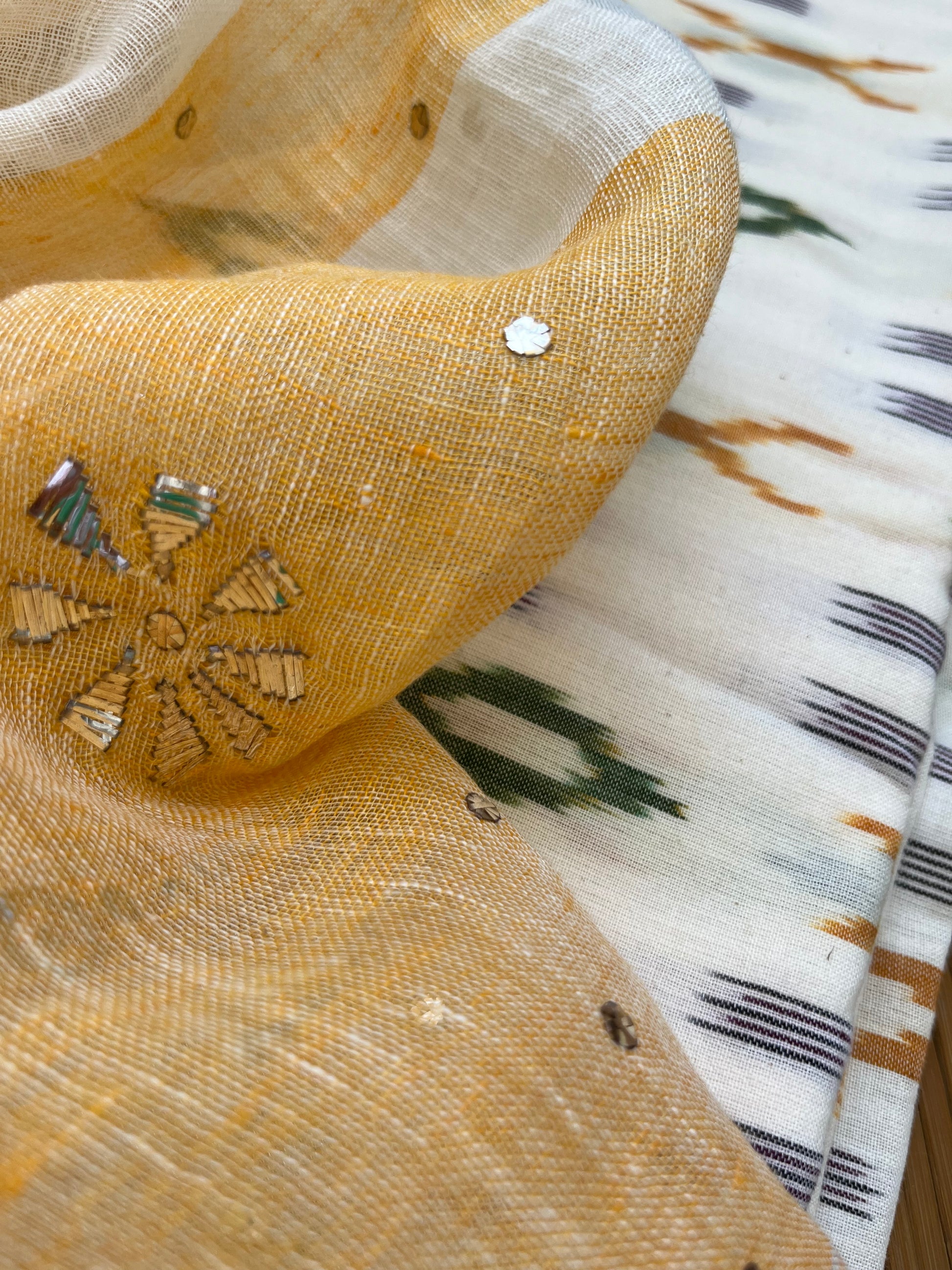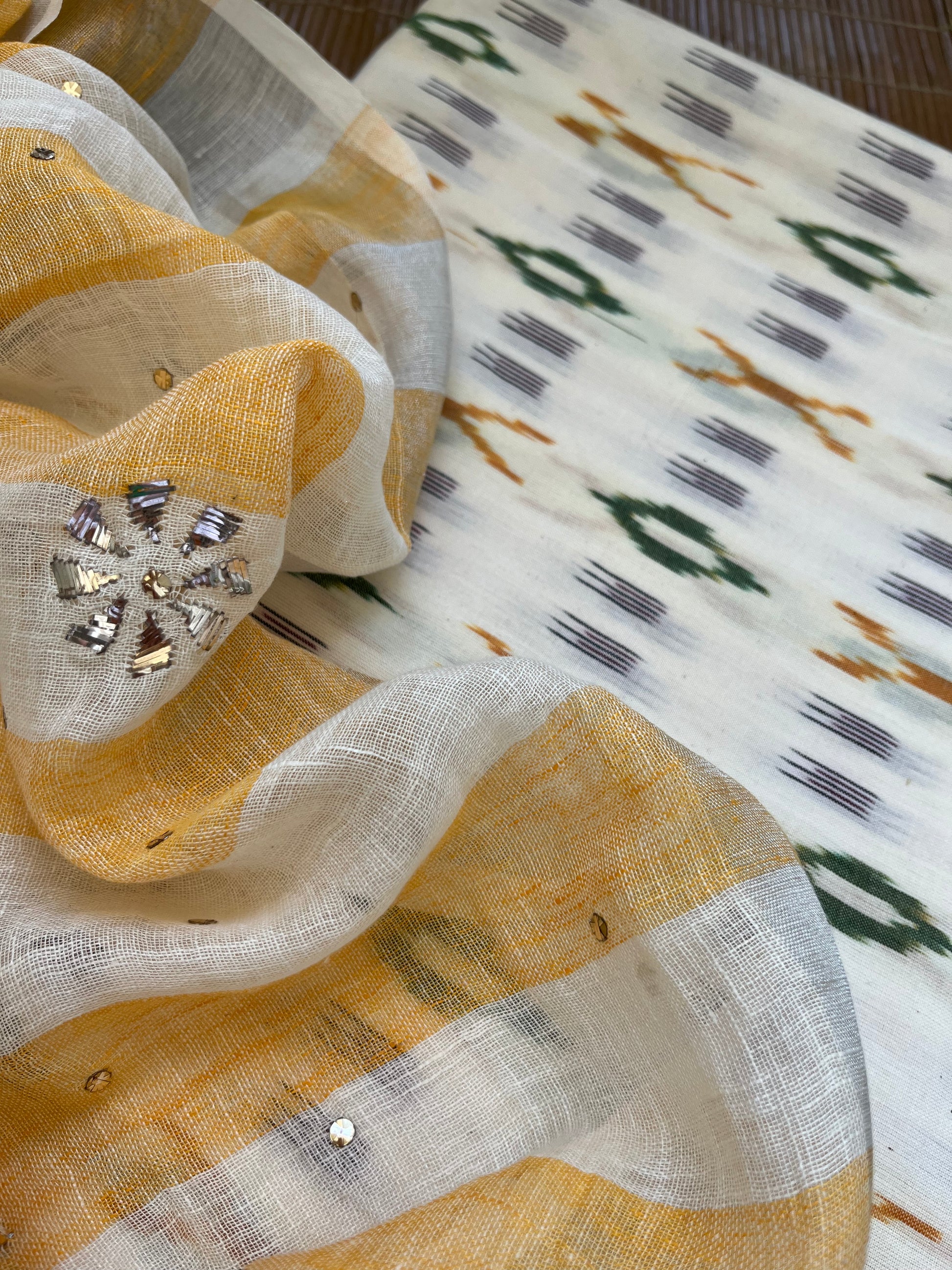 Mukaish linen dupatta cotton ikkat fabric
