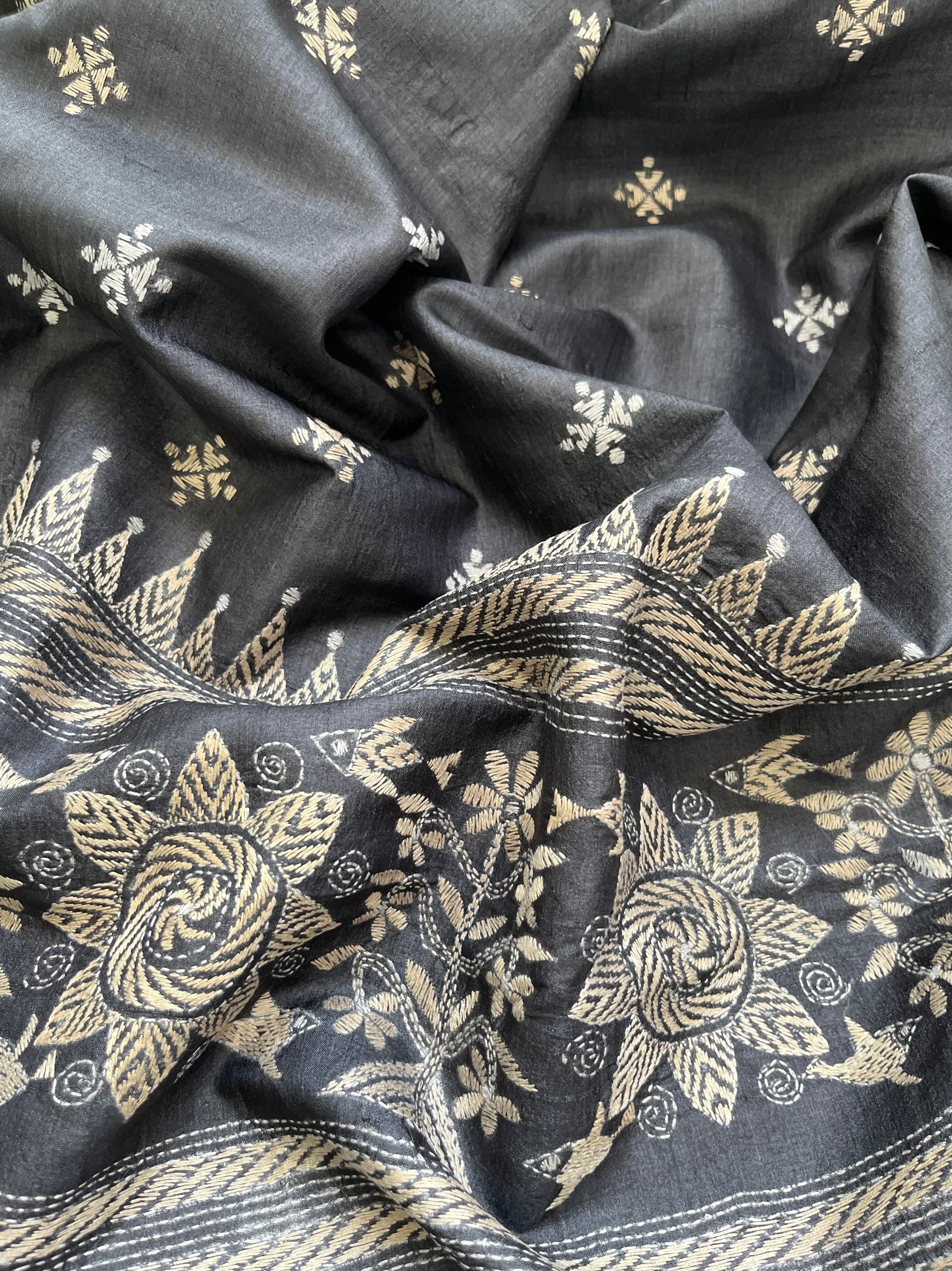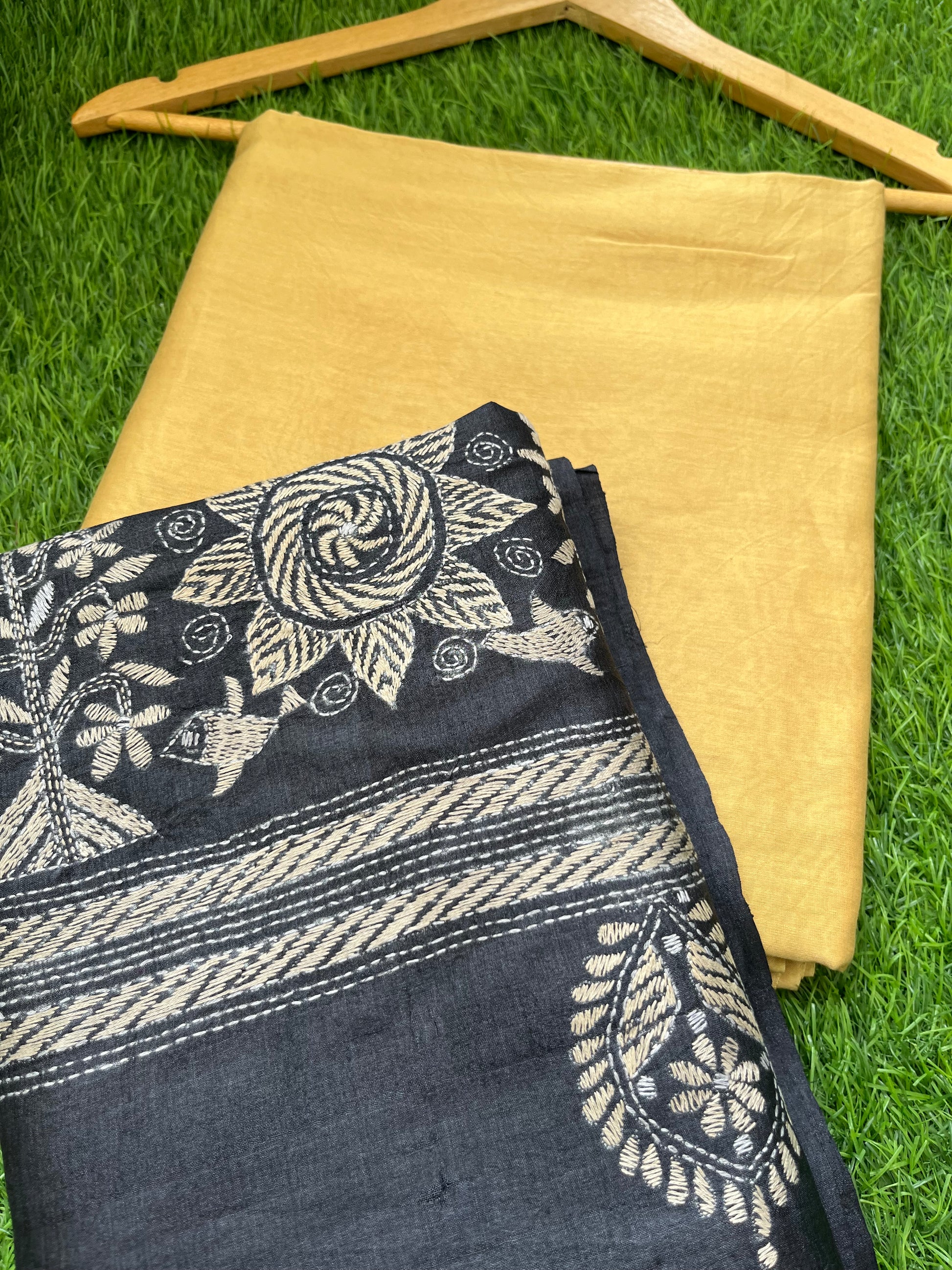 Cotton silk kurta bottom fabric with silk kantha work dupatta.