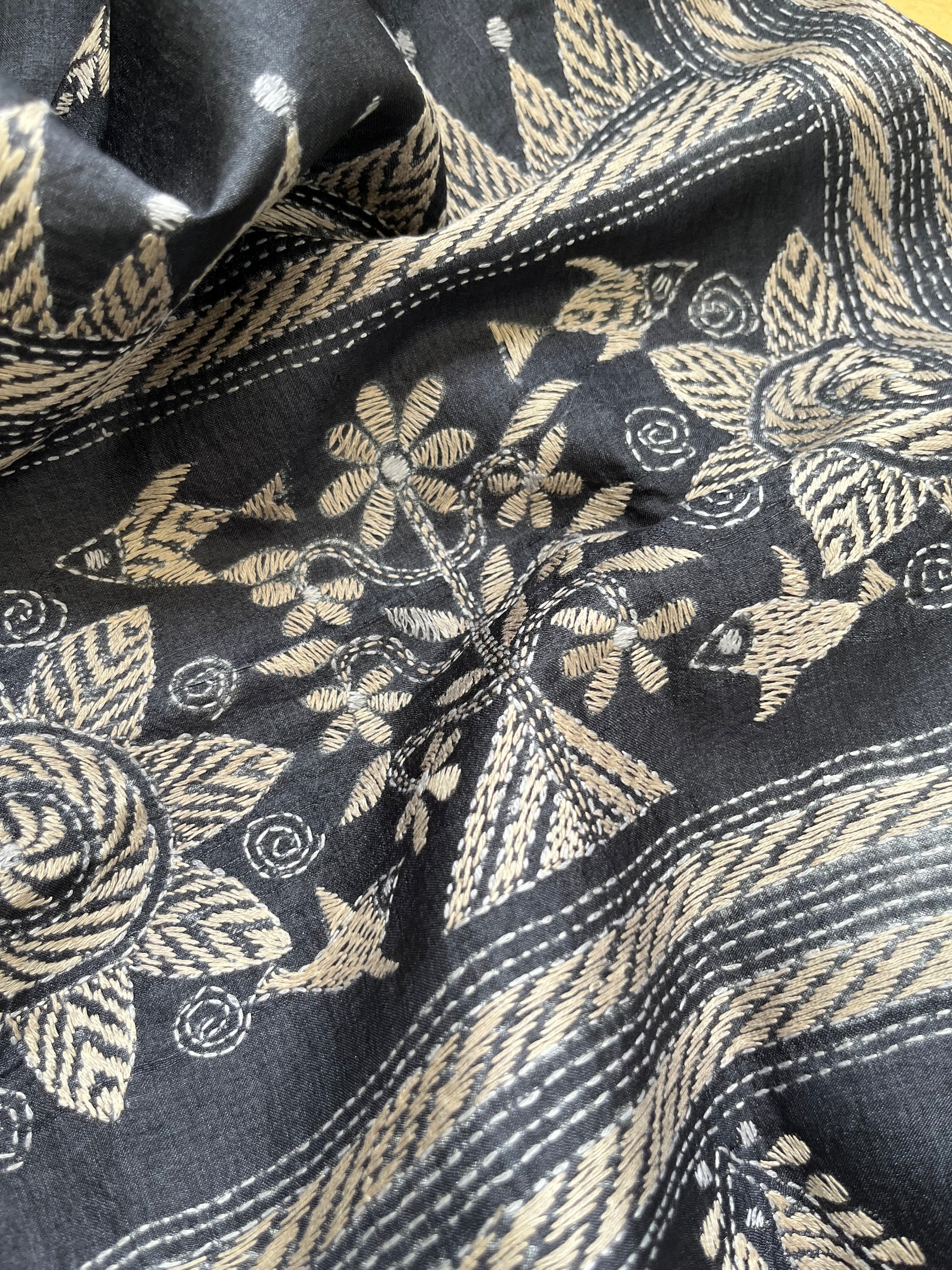 Delicate hand-stitched Kantha embroidery — every motif narrates a story, every stitch a reflection of tradition. Soft, detailed, and full of character, Kantha brings a soulful touch to your ensemble.