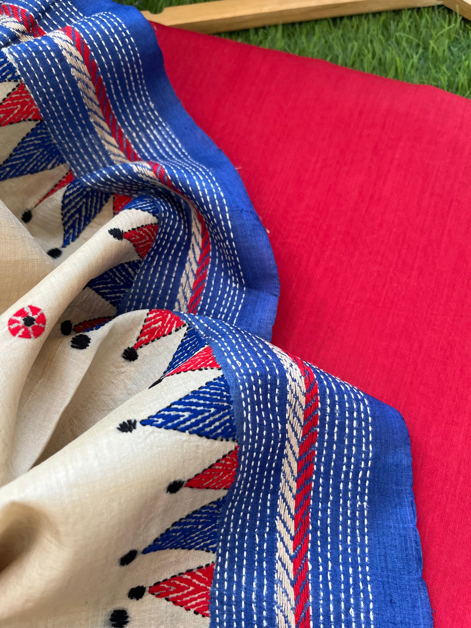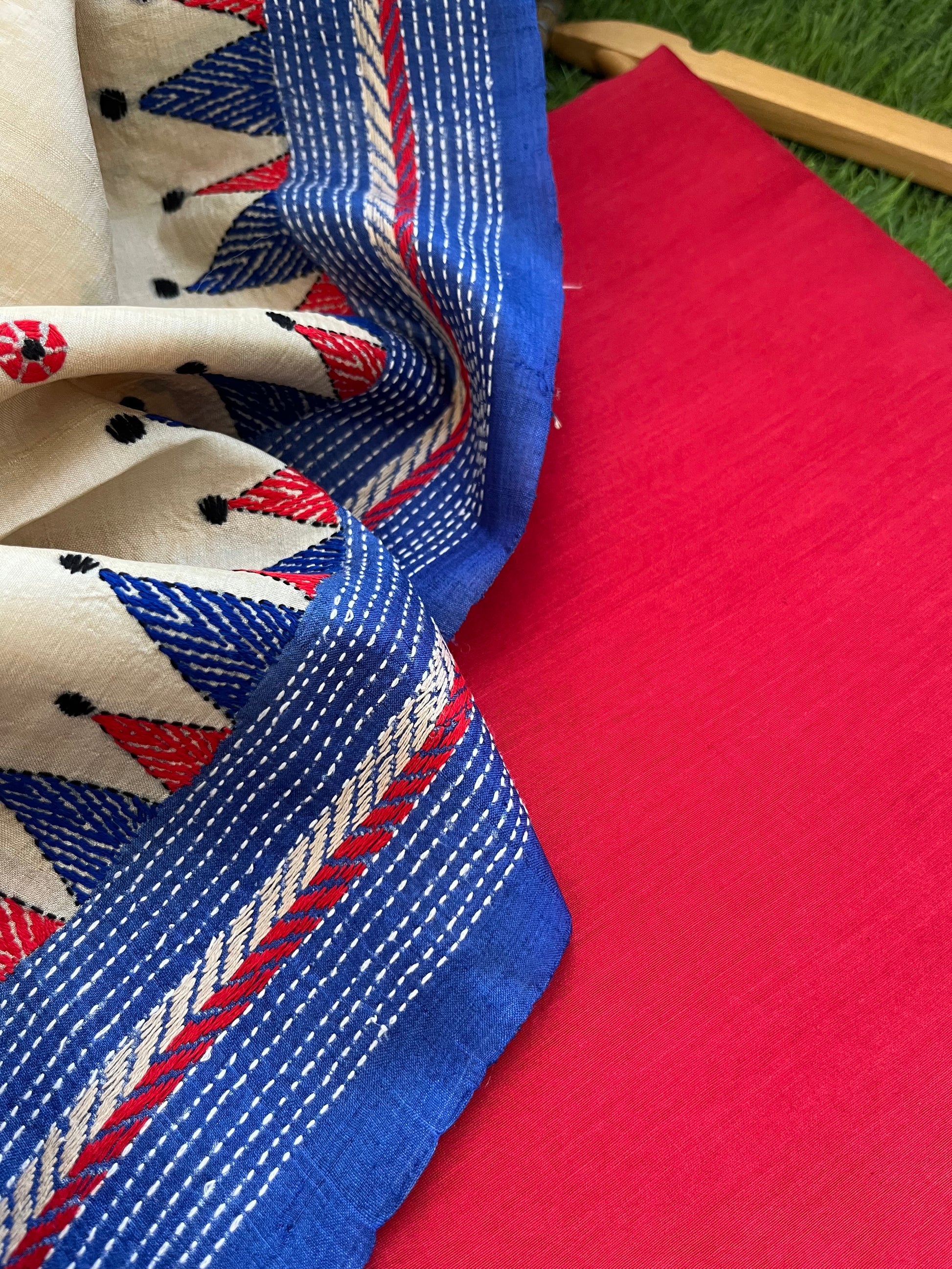 Cotton silk kurta bottom fabric with silk kantha work dupatta.
