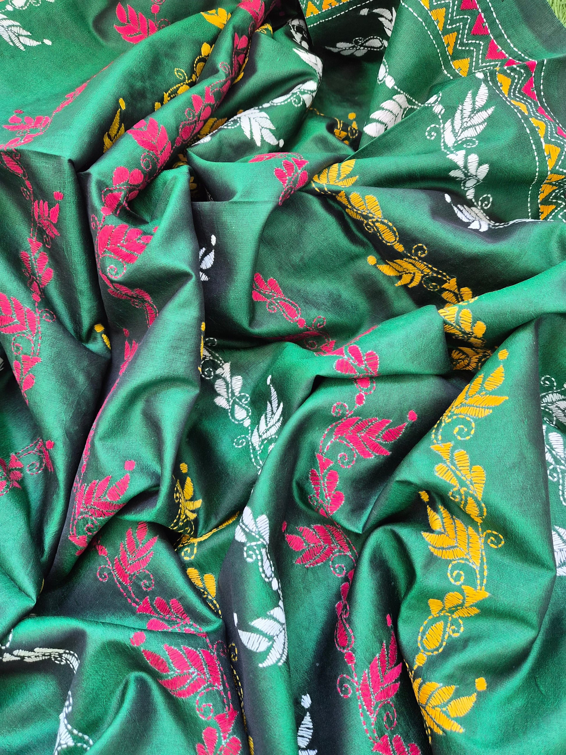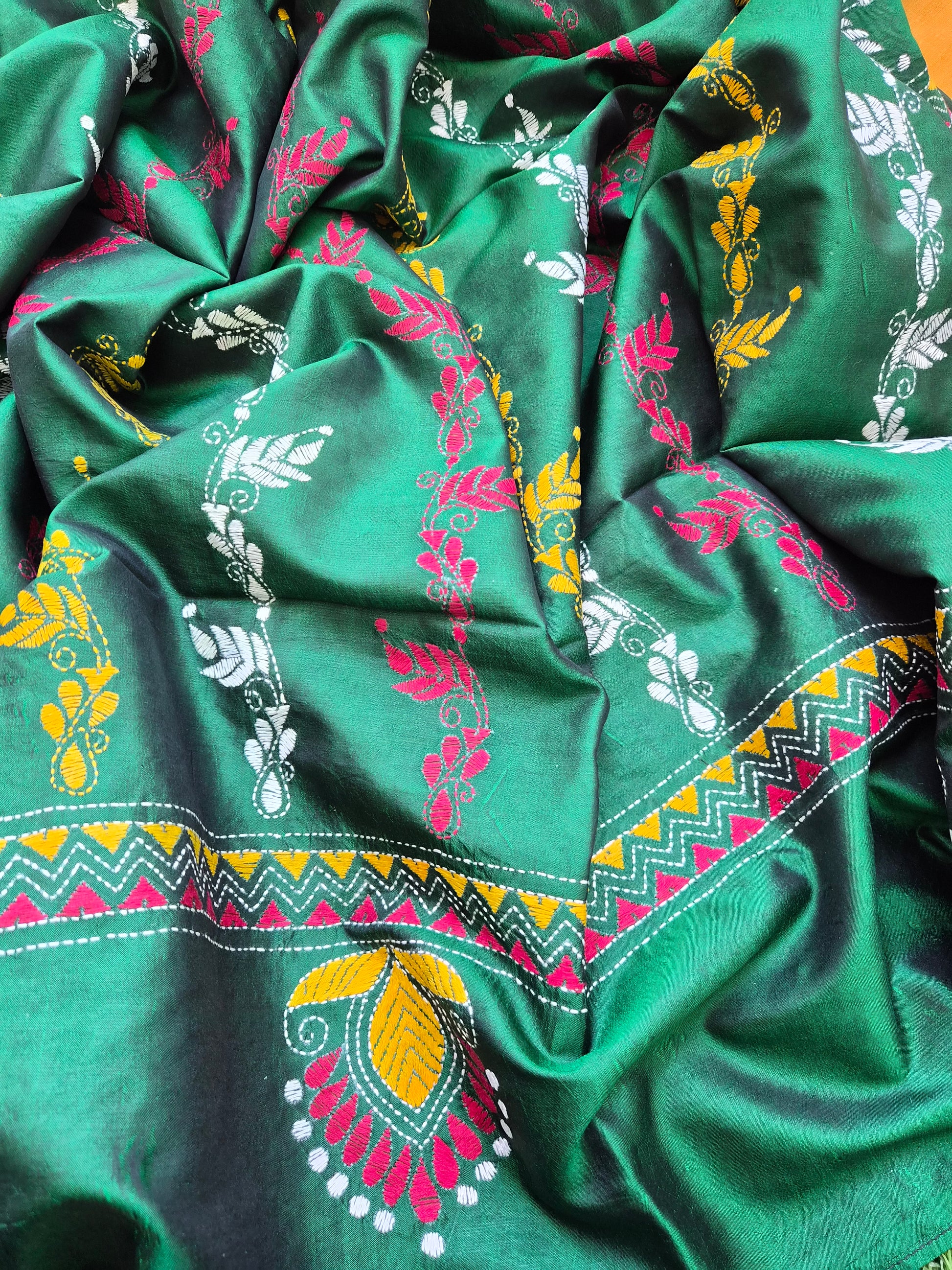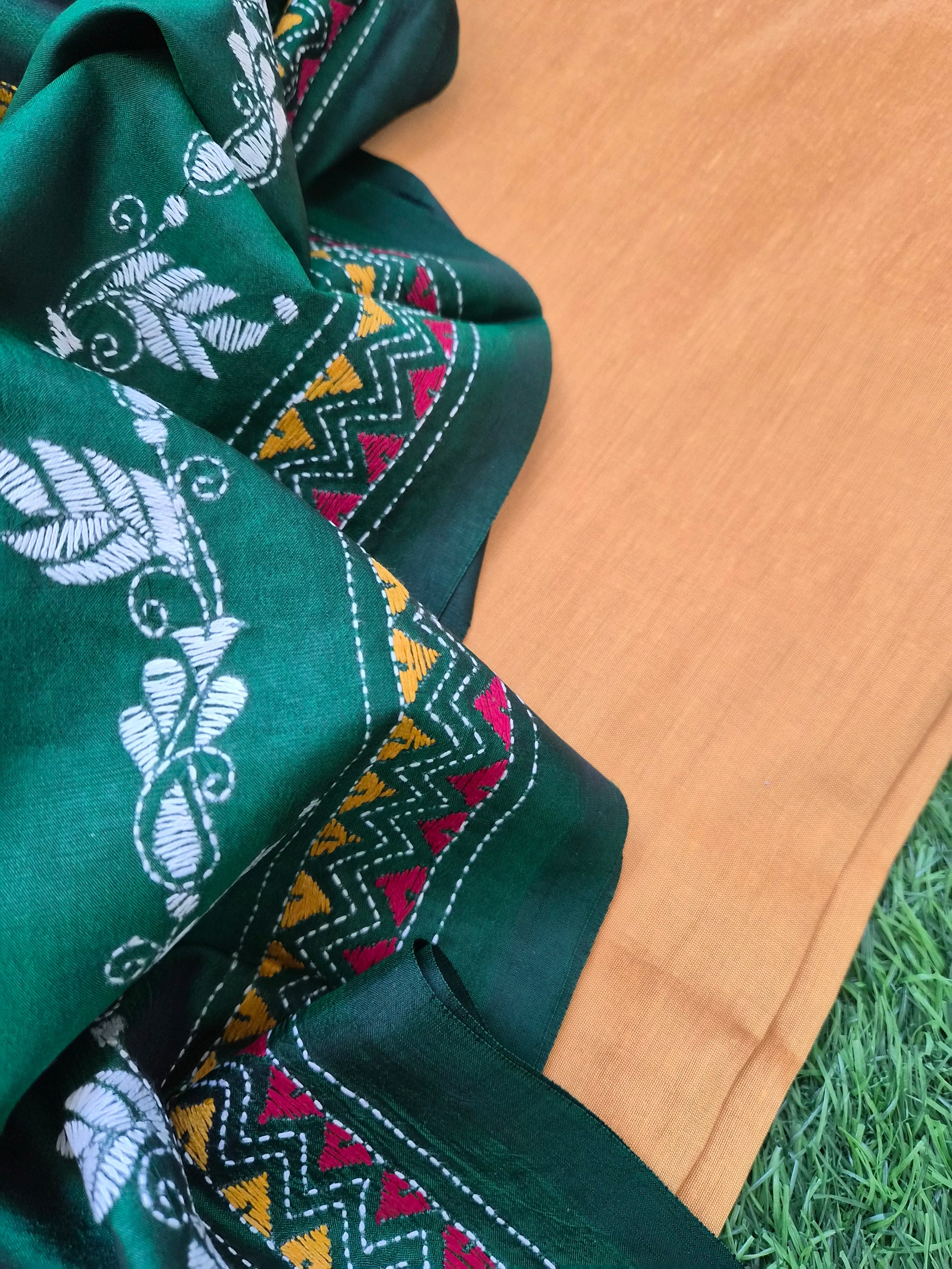Cotton silk kurta bottom fabric with silk kantha work dupatta.