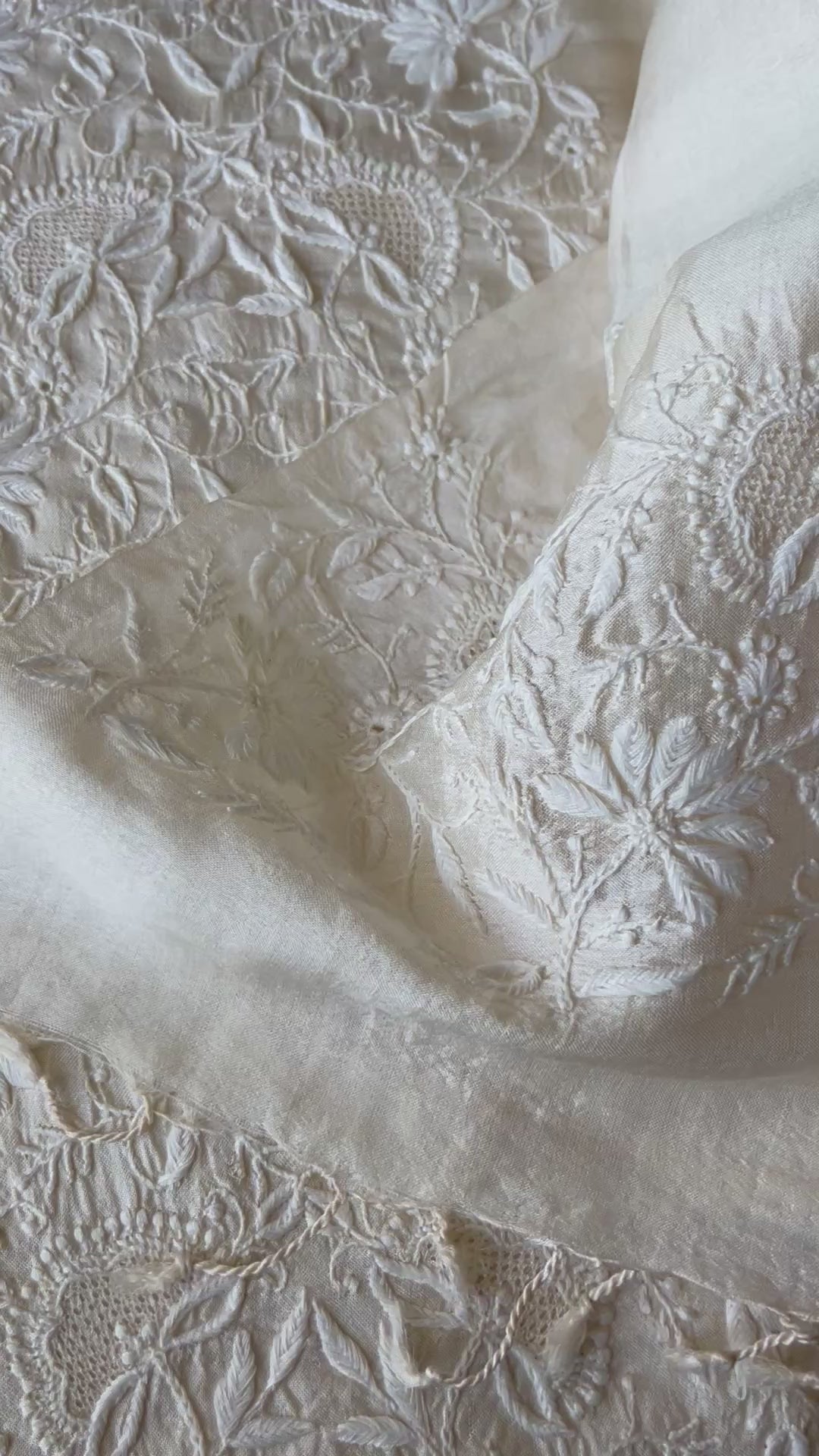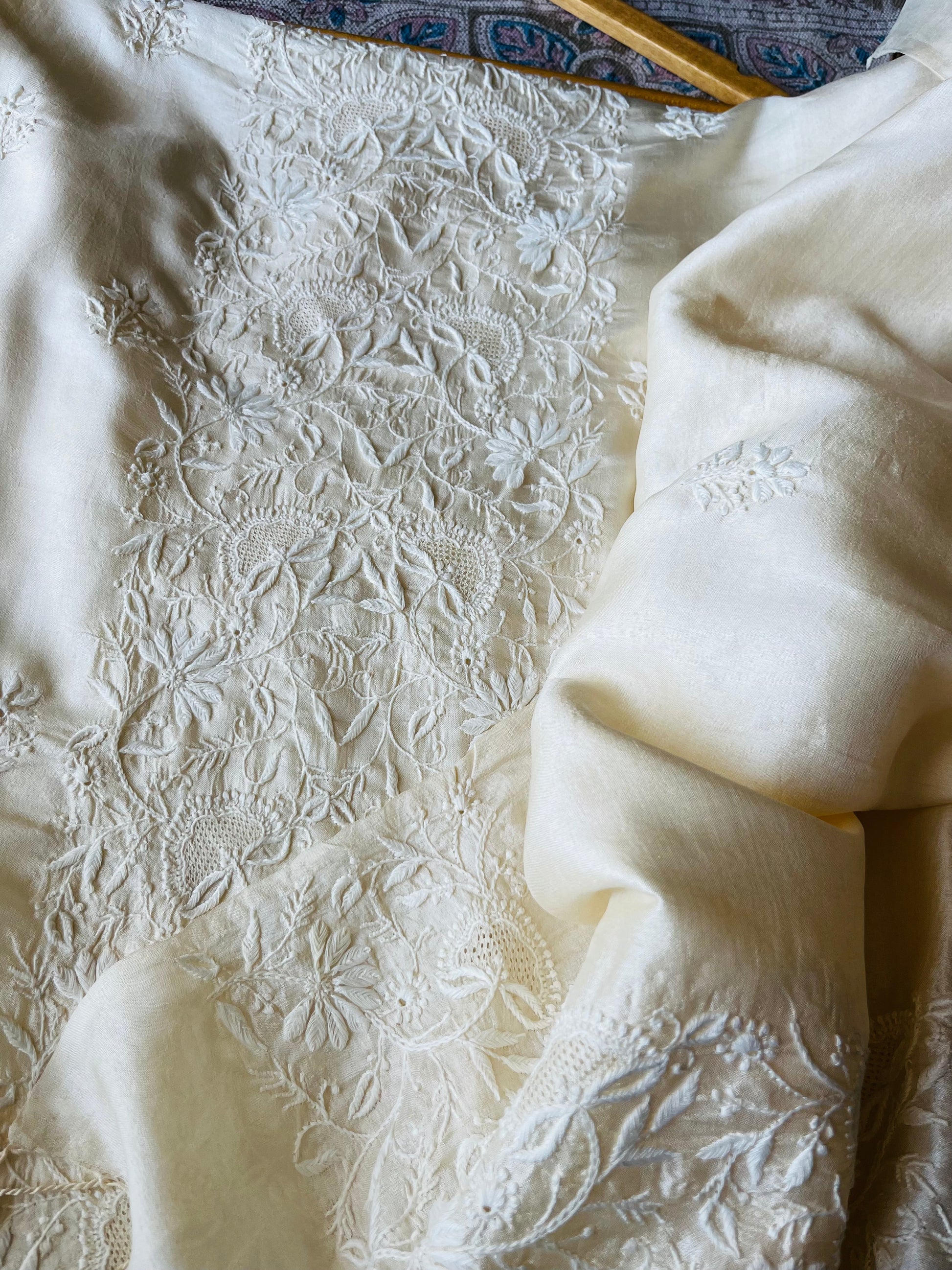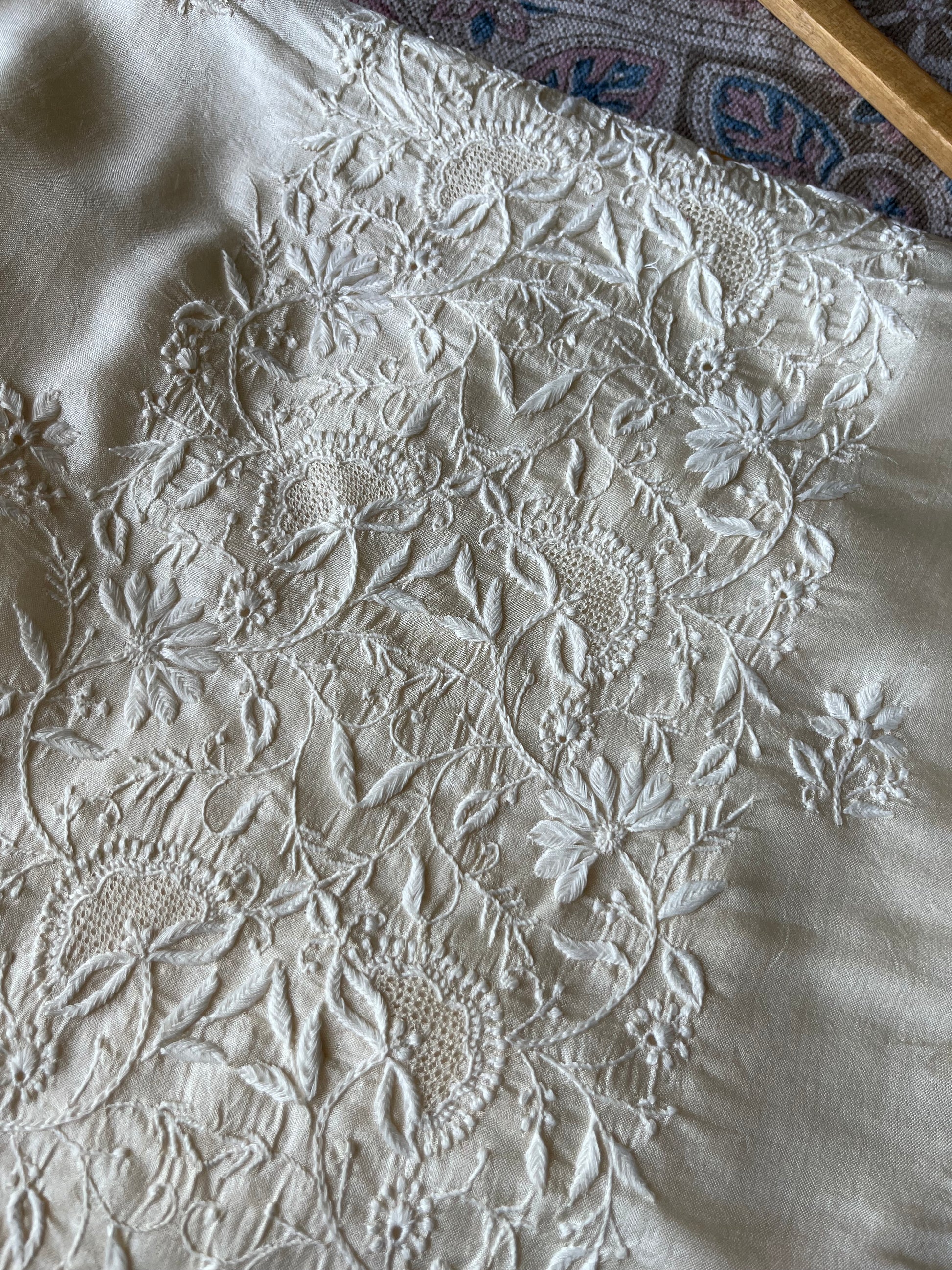 Tussar silk chikankari kurta dupatta. Kurta has no neckline but a panel in front back has a motif