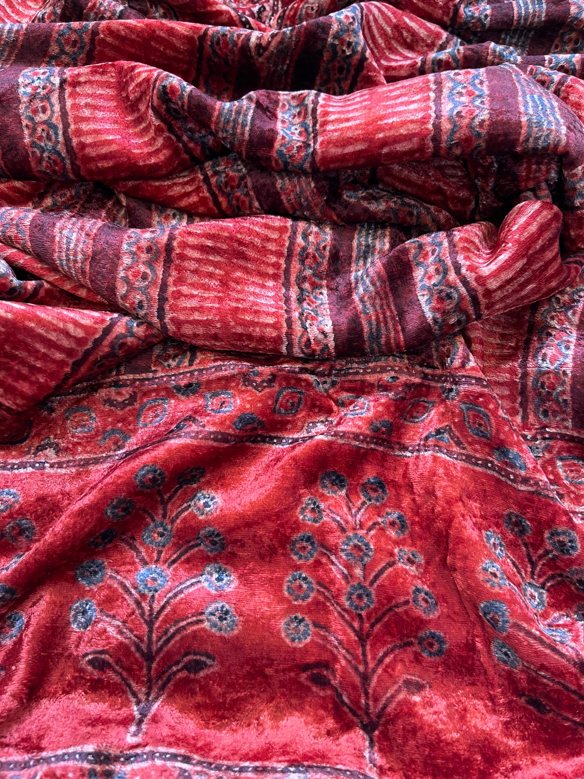Our Velvet Ajrakh Kurta is where timeless craft meets festive opulence. Hand block printed in traditional Ajrakh motifs on plush velvet, this piece exudes warmth, richness, and character. Perfect for evenings that call for understated elegance — pair it with statement earrings or a silk dupatta for a look that’s effortlessly regal.