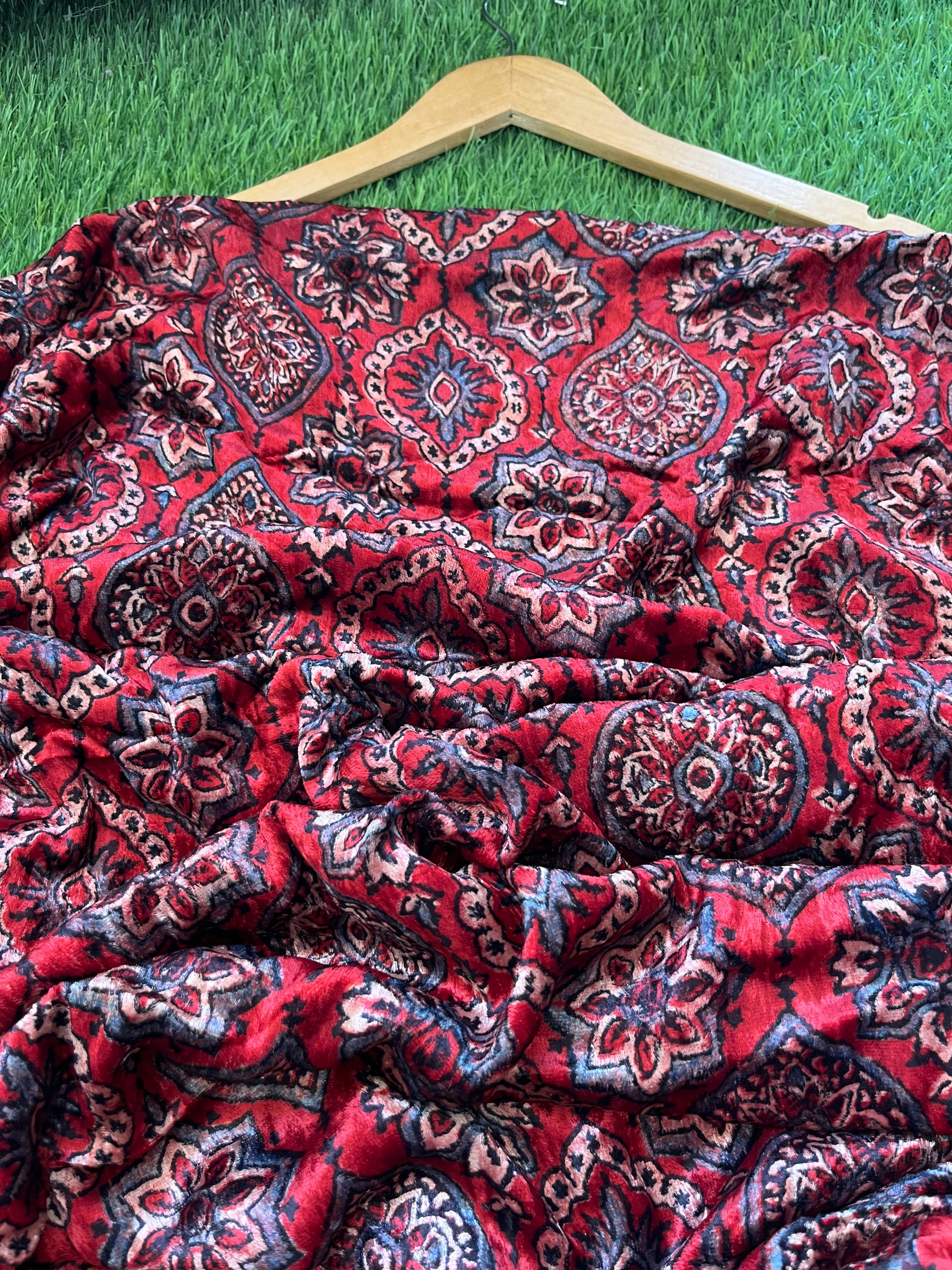 Our Velvet Ajrakh Kurta is where timeless craft meets festive opulence. Hand block printed in traditional Ajrakh motifs on plush velvet, this piece exudes warmth, richness, and character. Perfect for evenings that call for understated elegance — pair it with statement earrings or a silk dupatta for a look that’s effortlessly regal.